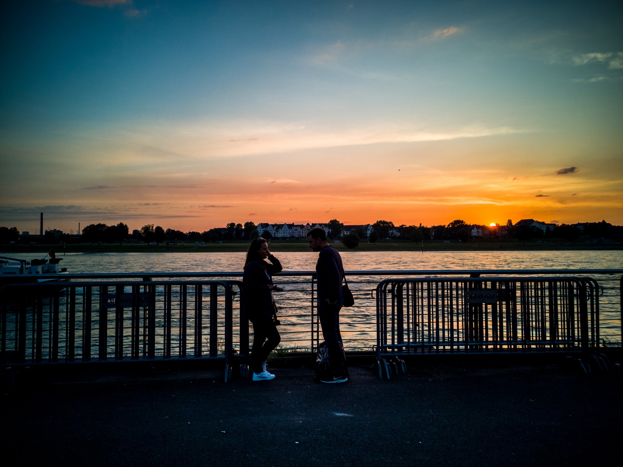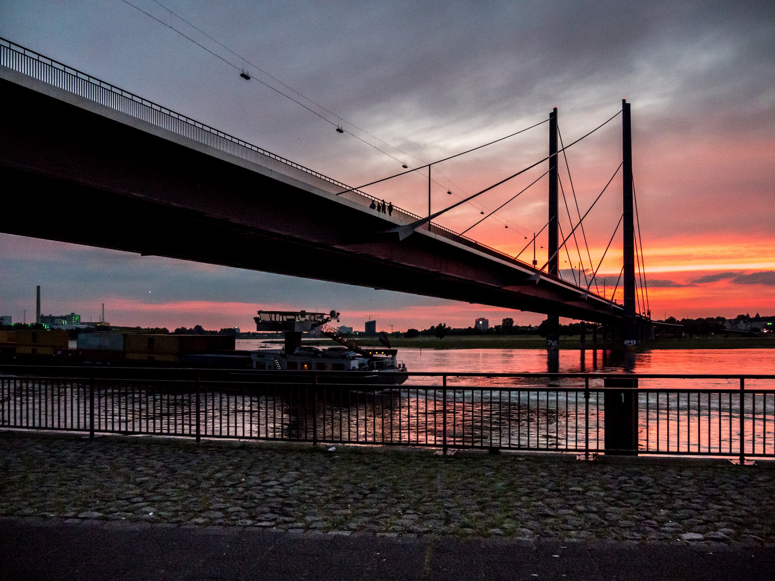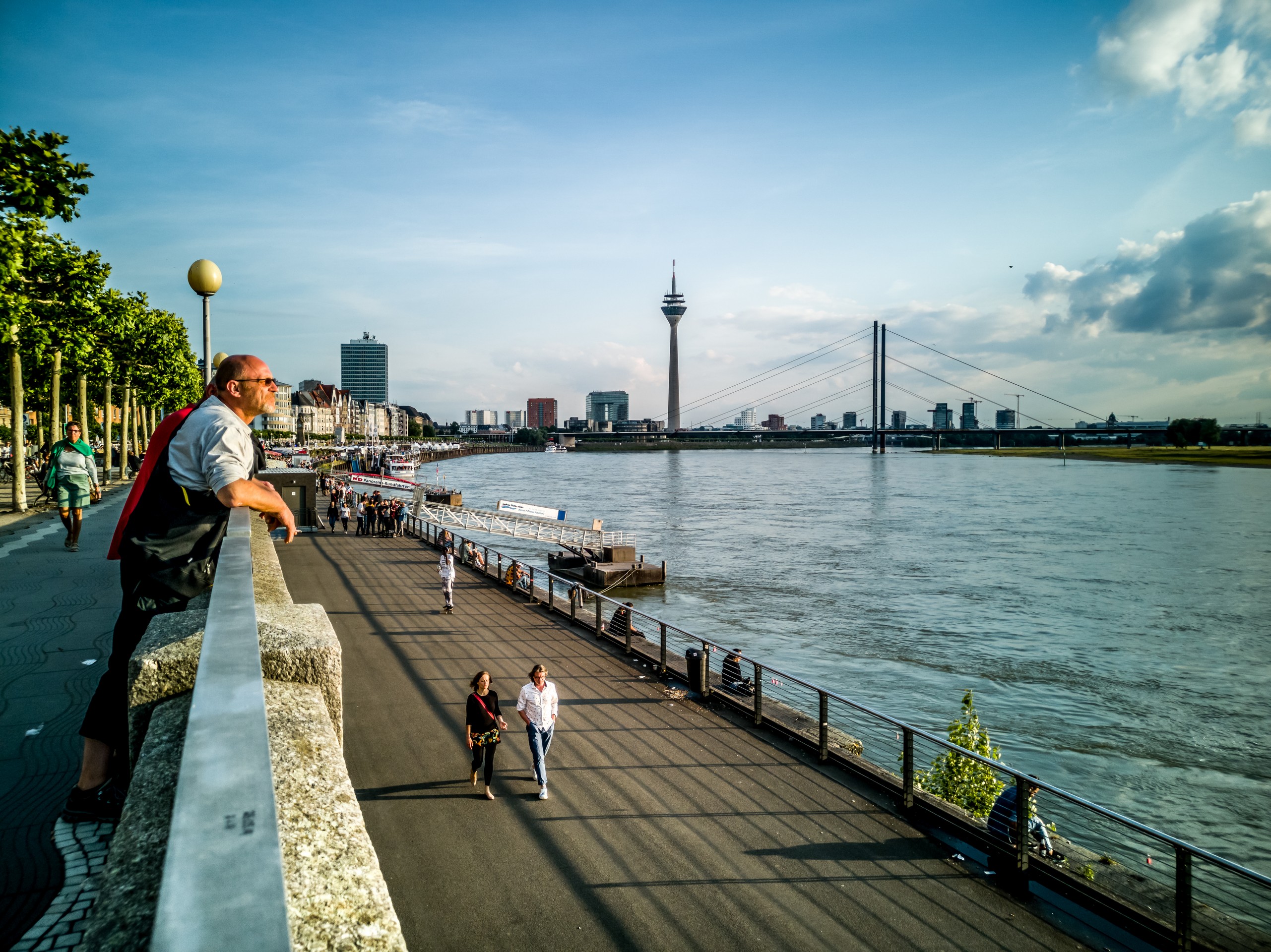Il est déjà 21 heures quand j’arrive en ville. Venue avec OUIbus, nous avons pris du retard grâce aux embouteillages bruxellois et à un contrôle douanier à l’aéroport de Cologne-Bonn. J’ai juste le temps de déposer mes affaires à mon Air BnB avant de prendre la route. Comme tu le sais, Lectrice, Lecteur, j’avais décidé de partir sans smartphone. J’essaie juste de me diriger au mieux sans mon guide métal mais il faut que je me dépêche. Sur mon chemin, je tombe justement sur une ligne de tram ! Un rapide regard sur le nom des arrêts et une carte me signale que je suis pile dans la bonne direction. Quelques minutes plus tard, me voilà au pied de l’icône de la ville : la Rheinturm. Construite entre la fin des années 70 et le début des années 80, elle domine le panorama de la ville depuis lors. Elle sert à la fois d’antenne pour la télévision mais aussi… d’horloge. La nuit tombée, des lumières incrustées dans son mât indique l’heure. C’est d’ailleurs la plus grande horloge décimale au monde. Je ne vais d’ailleurs pas tarder à la voir en action : j’arrive justement sur les bords du fleuve à la fin de coucher de soleil.