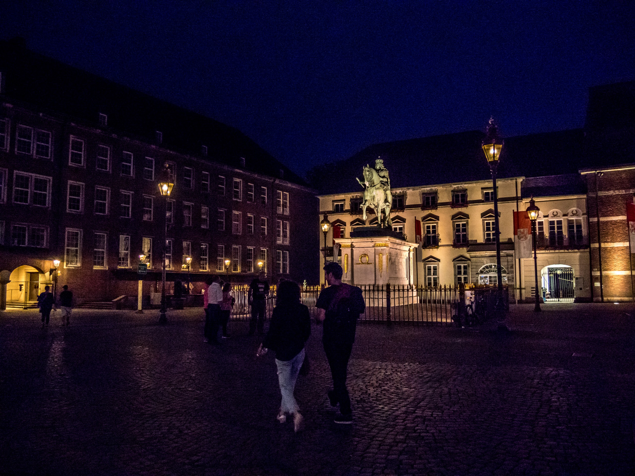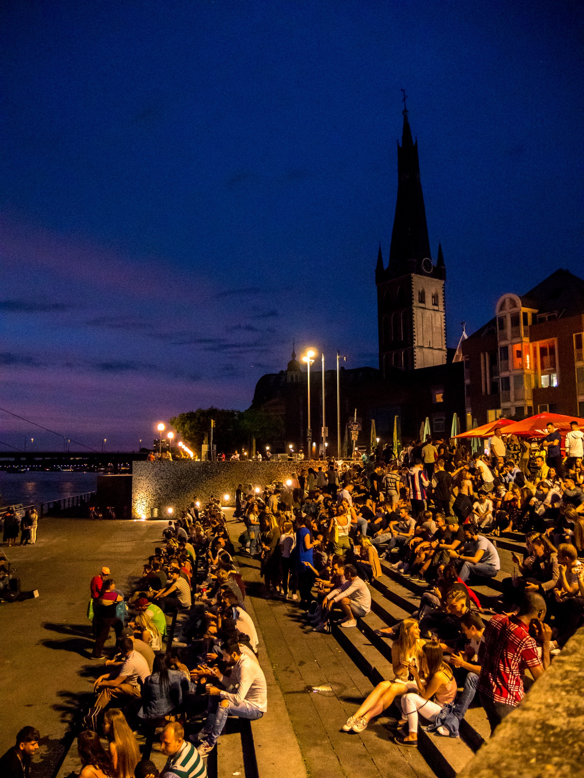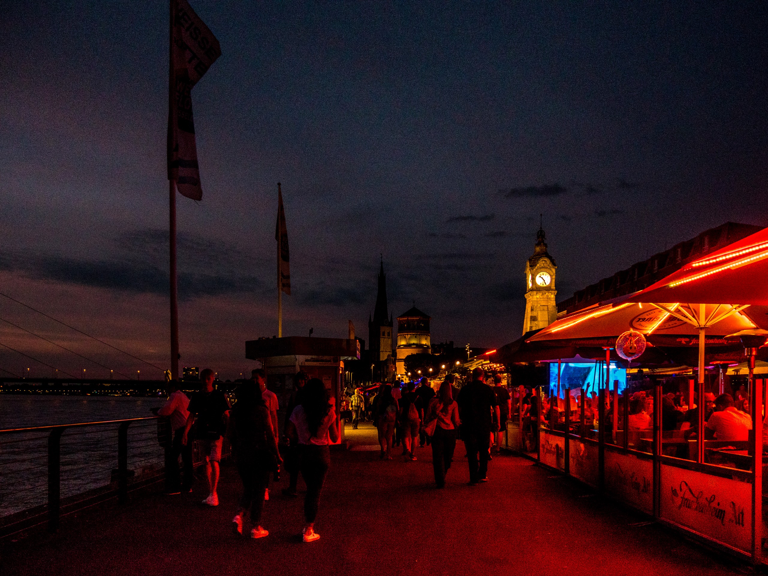 Les lumières de la ville sont allumées maintenant, les bords de Rhin sont rouges et Altstadt, la vieille ville, rouge de monde aussi ! Je dois dire que je n’ai jamais vu ça : c’est tout un quartier qui est transformé en espace à boire et à danser. Son surnom ? « Le plus grand bar du monde ». Il y a tellement de monde et tellement de musique que j’en attrape le tournis. Je me retrouve coincé entre des murs de chair humaine avec des vrombissement de basses venant dans tous les sens. Je regarde vers le haut, vers les étages… Je me demande comment font les gens qui habitent ici. Y-en-t-il seulement ? Et là, prise d’une espèce de mini-crise de panique, je me résous à sortir mon smartphone pour m’extraire de là et rejoindre la brasserie où je pensais manger.