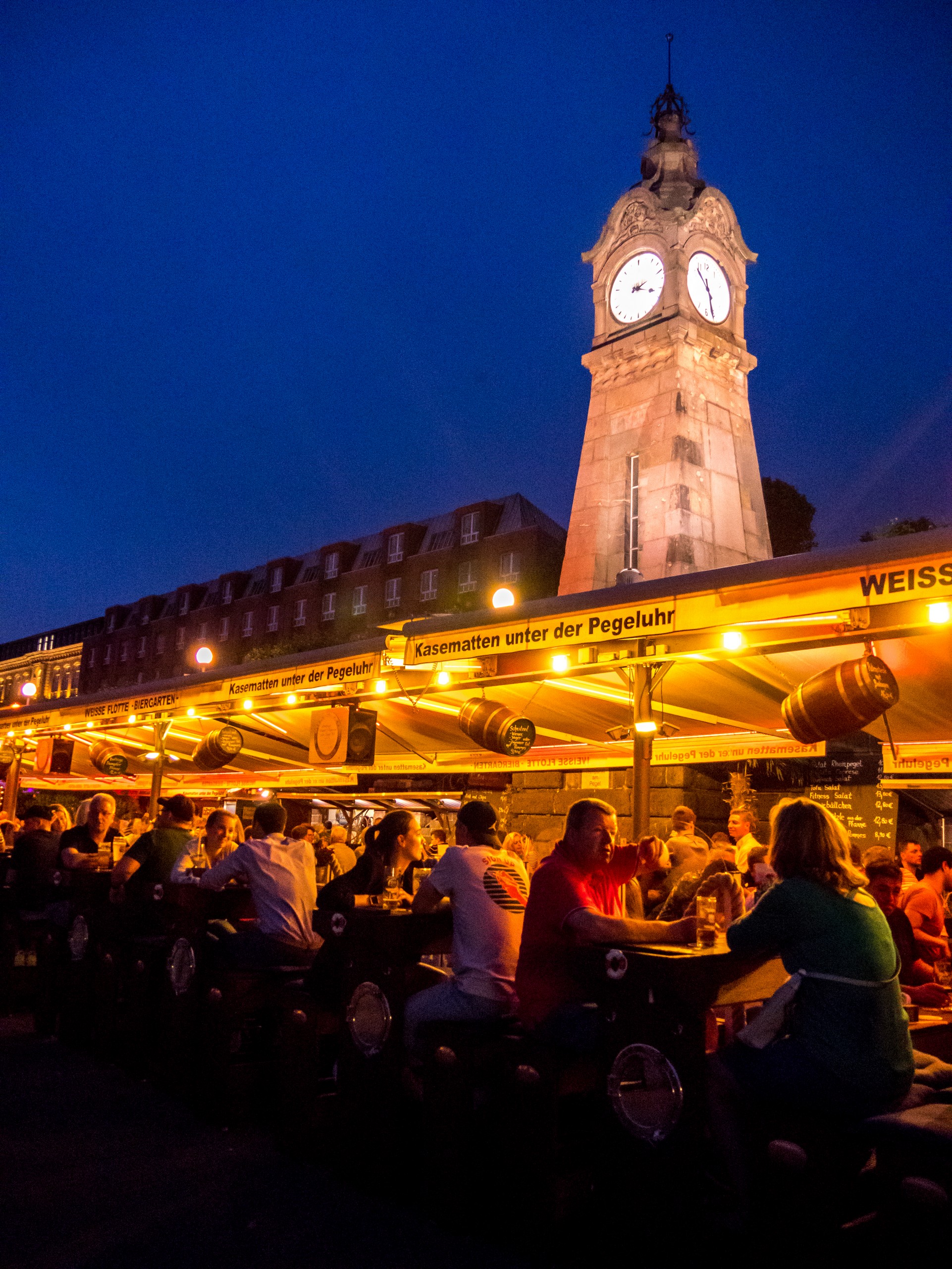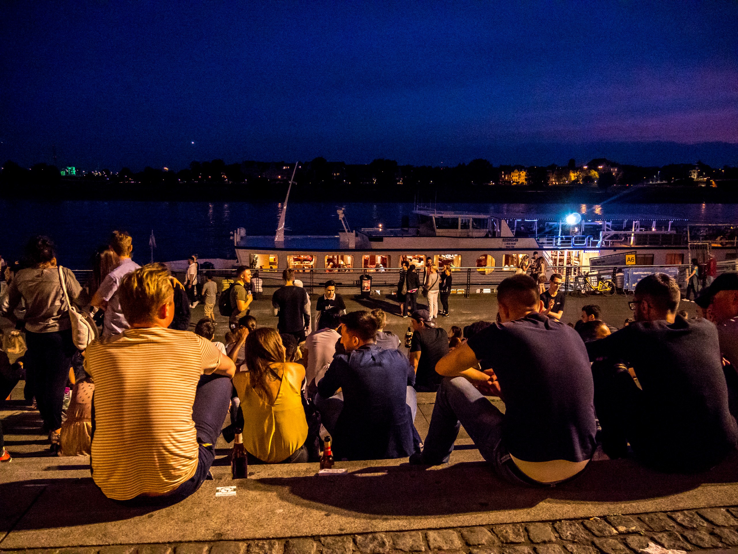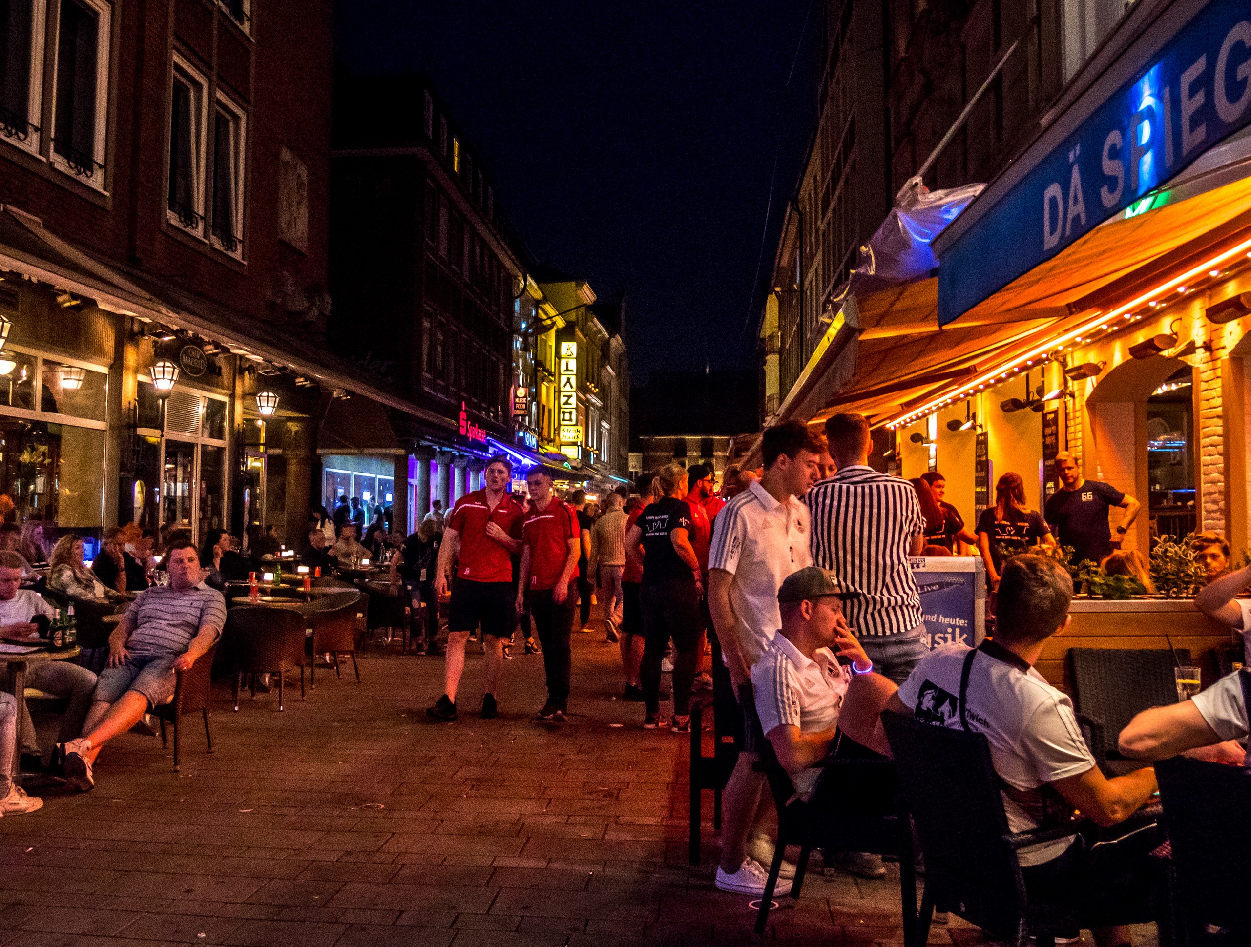 Les lumières de la ville sont allumées maintenant, les bords de Rhin sont rouges et Altstadt, la vieille ville, rouge de monde aussi ! Je dois dire que je n’ai jamais vu ça : c’est tout un quartier qui est transformé en espace à boire et à danser. Son surnom ? « Le plus grand bar du monde ». Il y a tellement de monde et tellement de musique que j’en attrape le tournis. Je me retrouve coincé entre des murs de chair humaine avec des vrombissement de basses venant dans tous les sens. Je regarde vers le haut, vers les étages… Je me demande comment font les gens qui habitent ici. Y-en-t-il seulement ? Et là, prise d’une espèce de mini-crise de panique, je me résous à sortir mon smartphone pour m’extraire de là et rejoindre la brasserie où je pensais manger.
