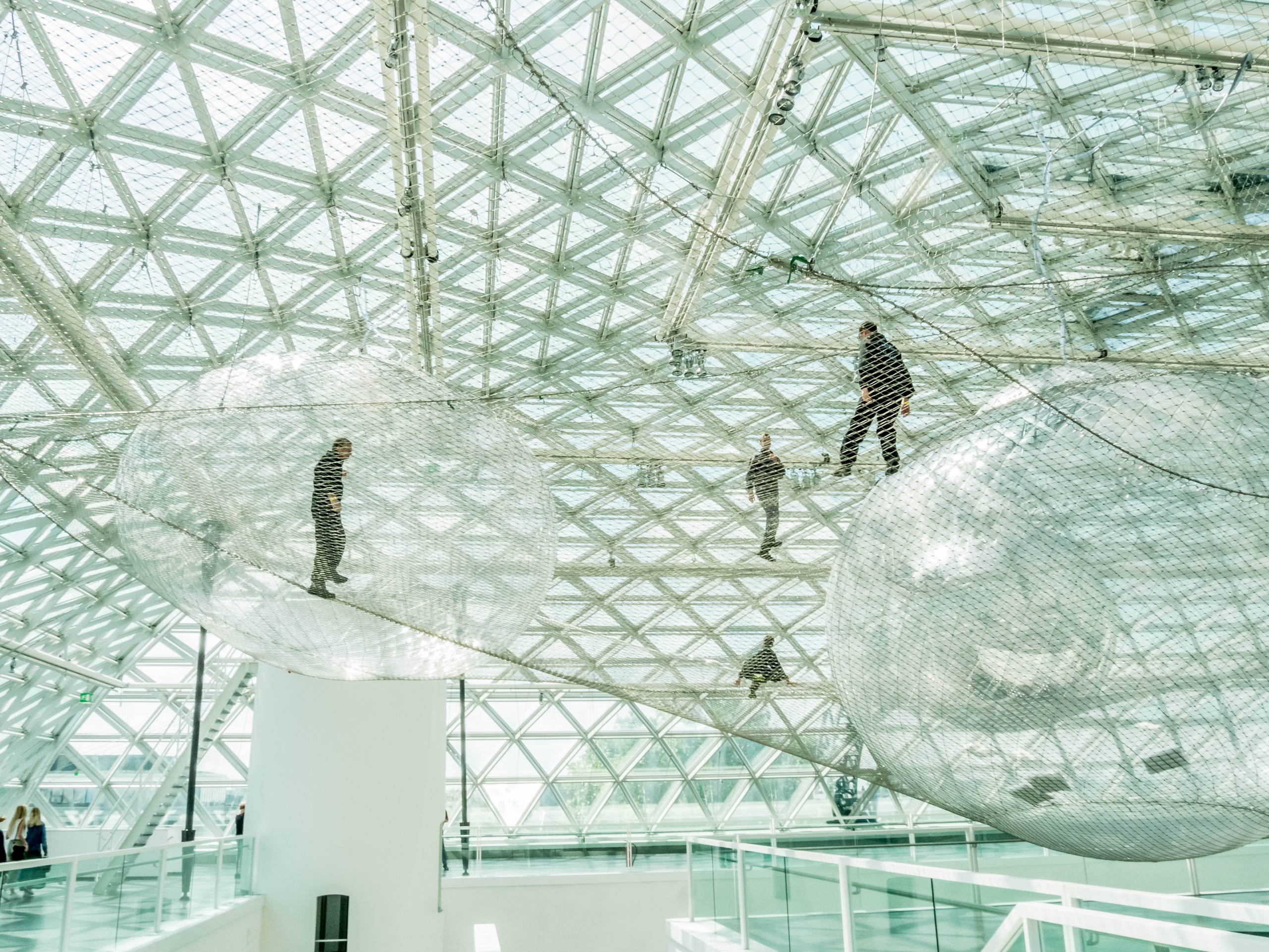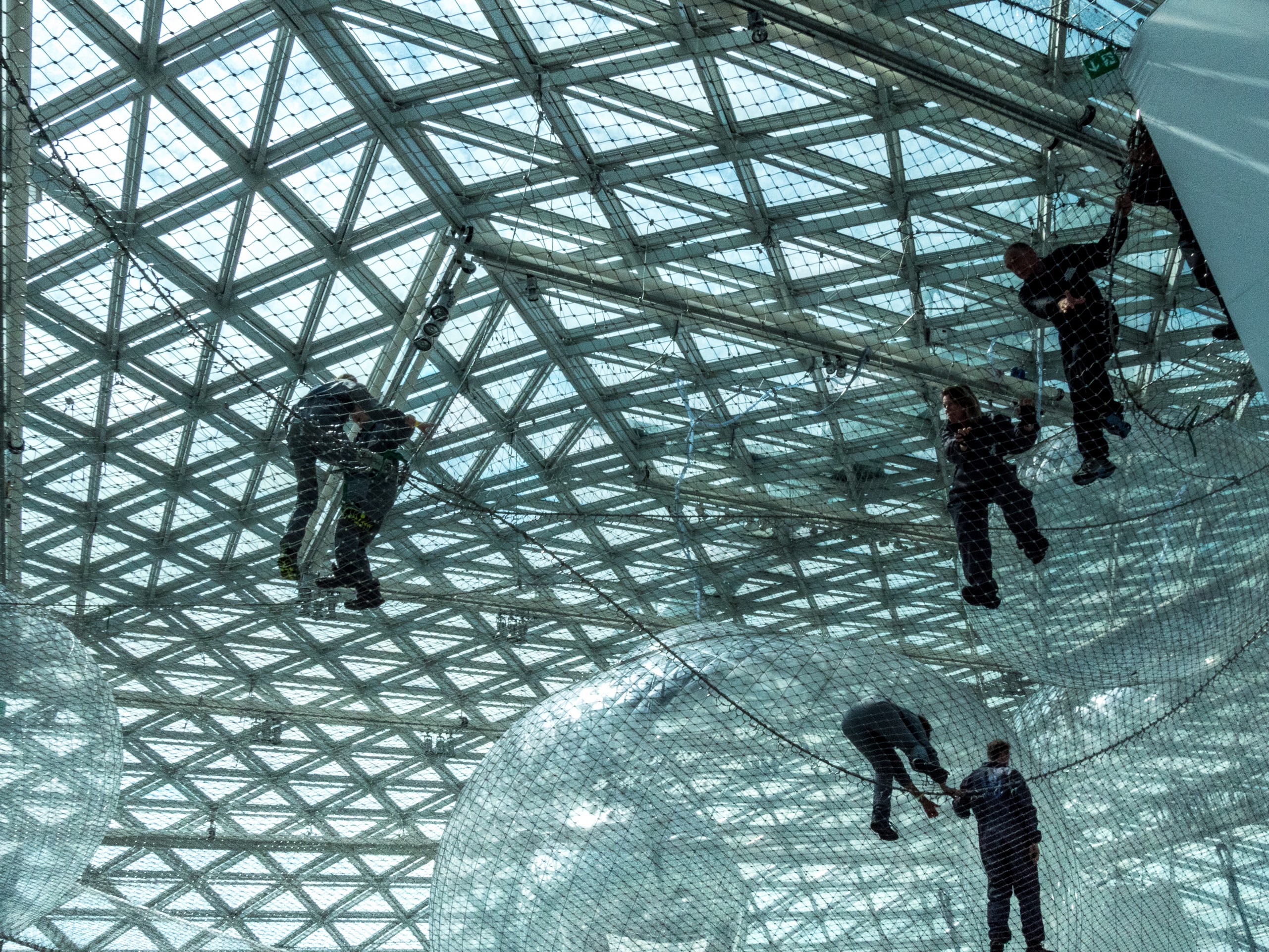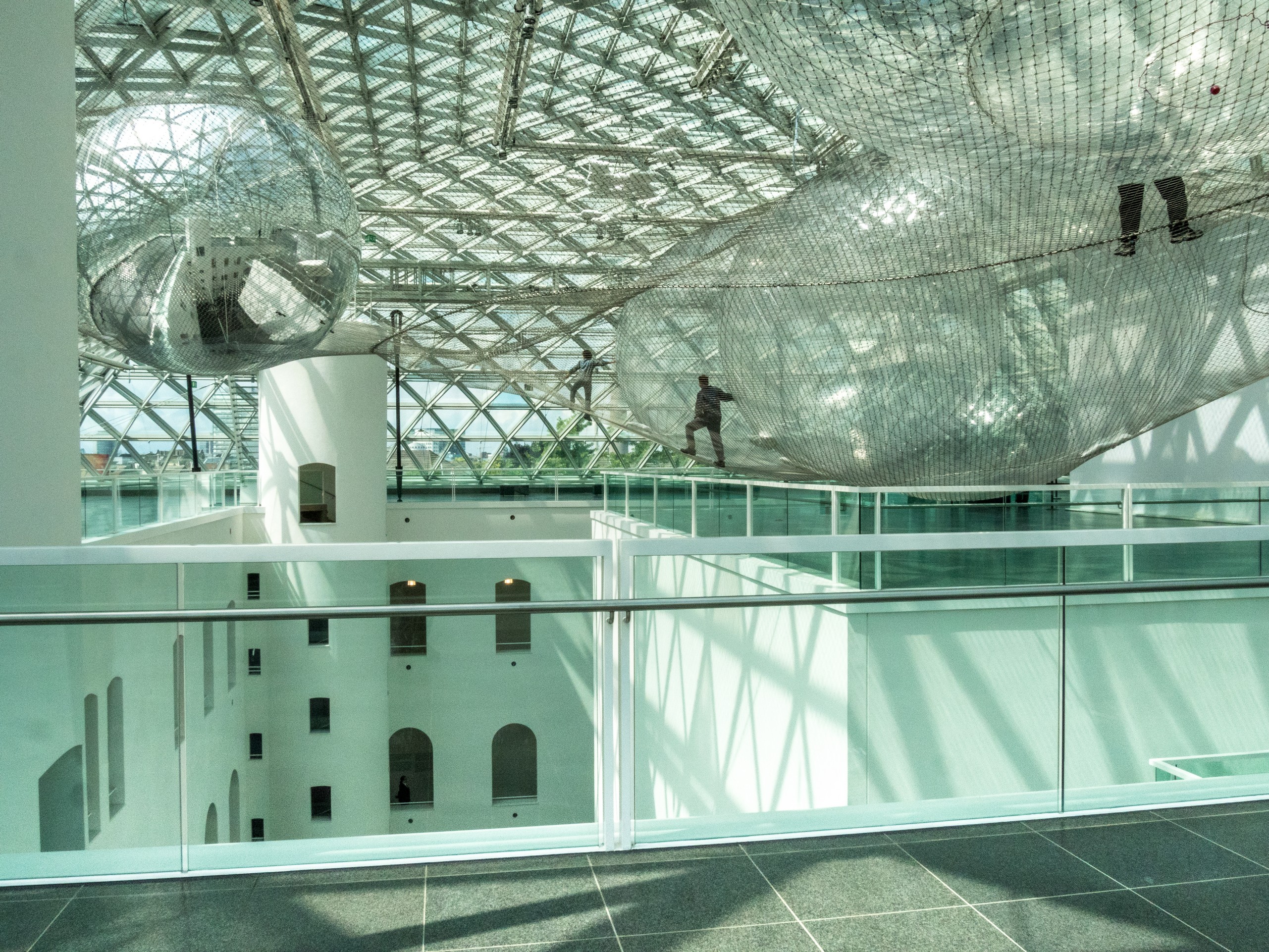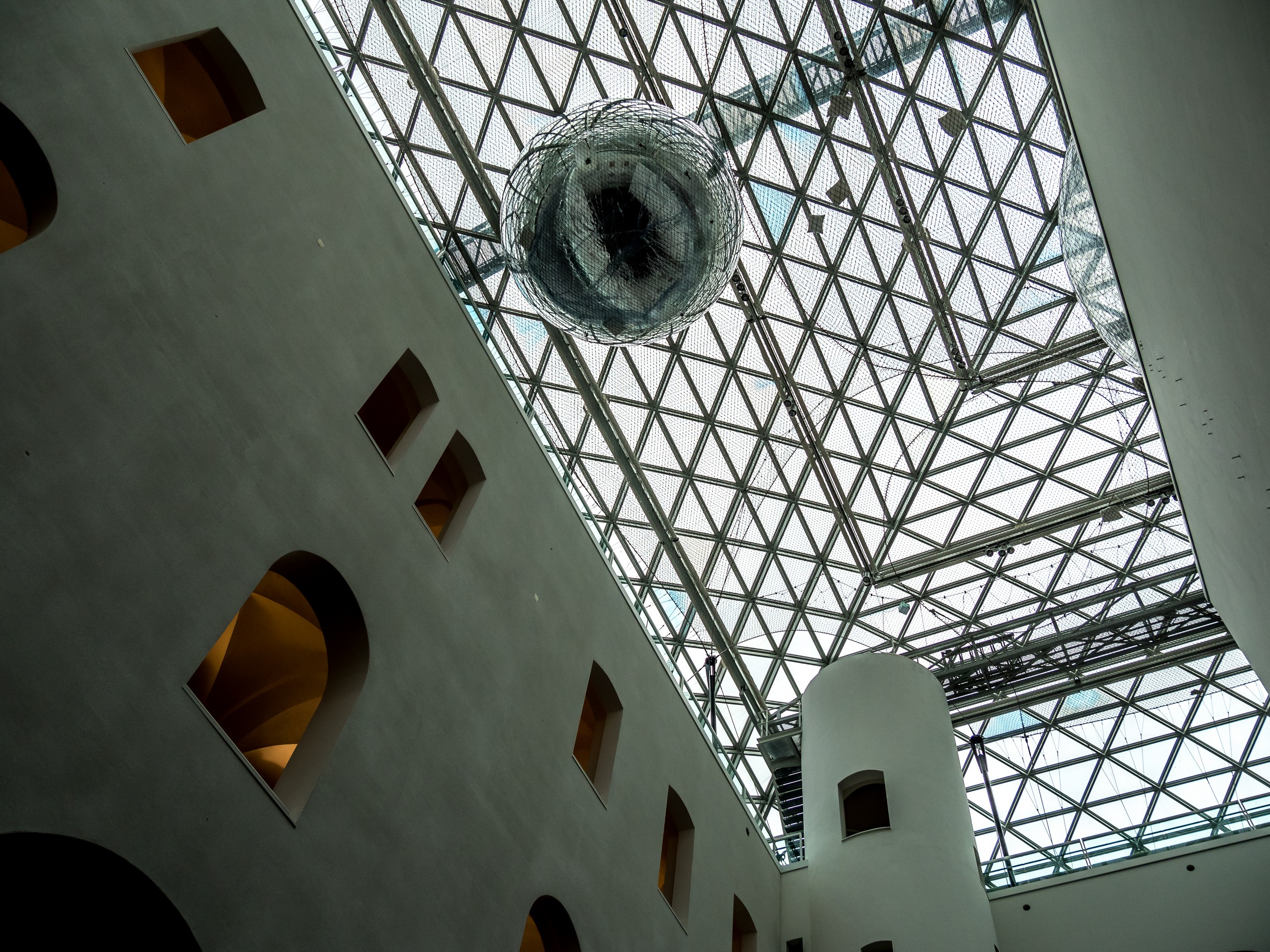 Il faut atteindre le dernier étage pour trouver un peu de légèreté avec « In Orbit », l’installation de Tomás Saraceno. Prenant la largeur de toute la coupole, de gigantesques filets de métal permettent aux visiteurs de se promener dans les airs, comme en apesanteur ! Les visiteurs devenant eux même partie de l’œuvre et étant regardés par les autres. Evidemment, il fallait que je le fasse ! C’est donc revêtue d’une combinaison à la « Objectif Lune » et de chaussure à crampon que je me lance. Et c’est pas facile. Ce n’est pas tellement à cause d’un éventuel vertige (parce quand même, le sol est 4 étages plus bas) mais à cause de l’équilibre. Le filet est mouvant, évidemment pas plat et c’est lentement que l’on progresse autour de ballons géants. De ci, de là, des coussins blancs sont disposés pour qu’on puisse se reposer un instant. Sauf que se relever est plutôt difficile ! Mais enfin, j’arrive au bout du parcours, un peu essoufflée mais contente. Cette petite promenade dans les auteurs a été l’occasion aussi de mieux admire le bâtiment. Le Ständhaus est l’ancien parlement du Land et il semble avoir été complètement vidé et réorganisé. Seule sa façade, ses escaliers et une porte trahissent son âge, c’est un peu déroutant.
