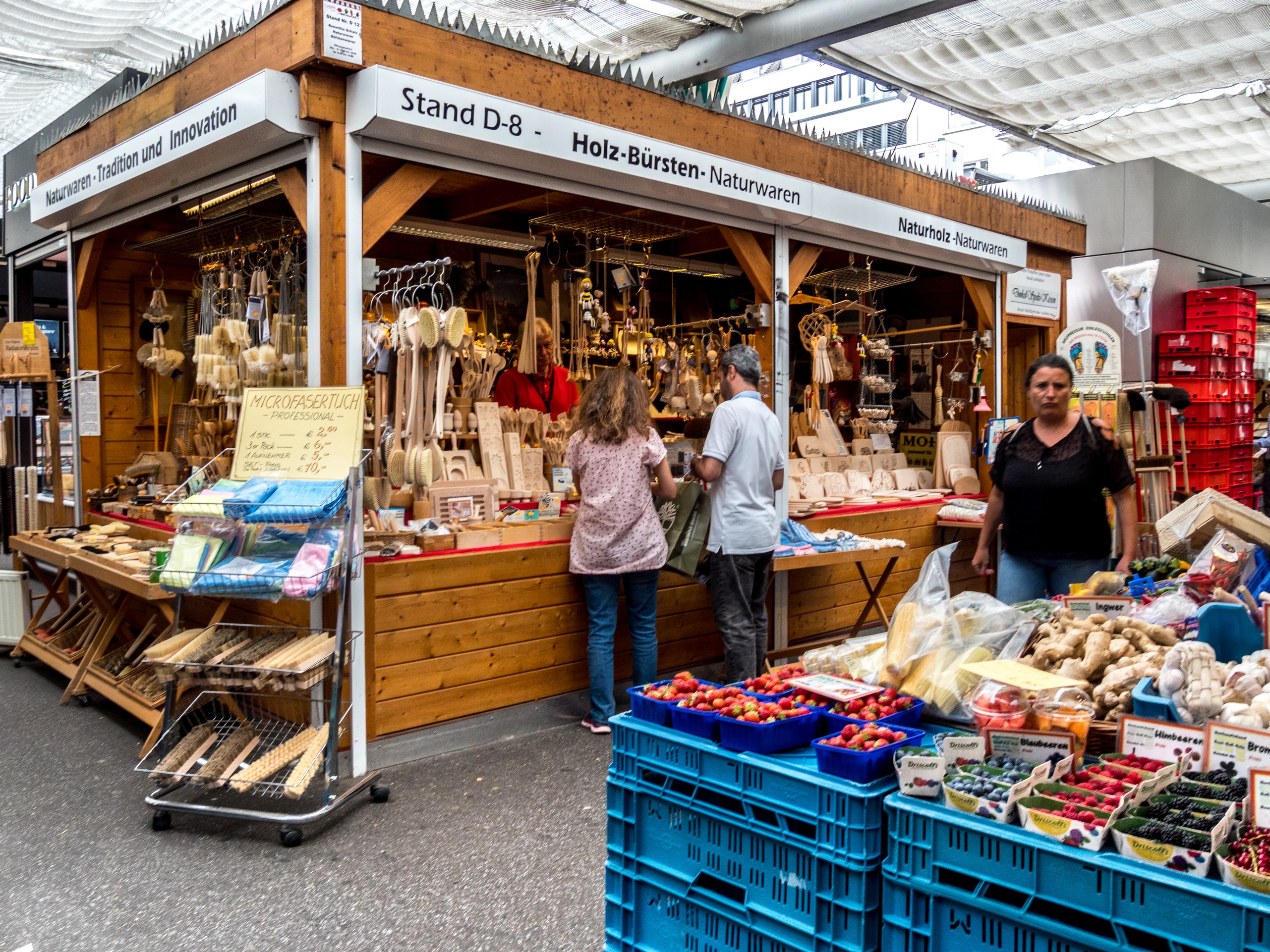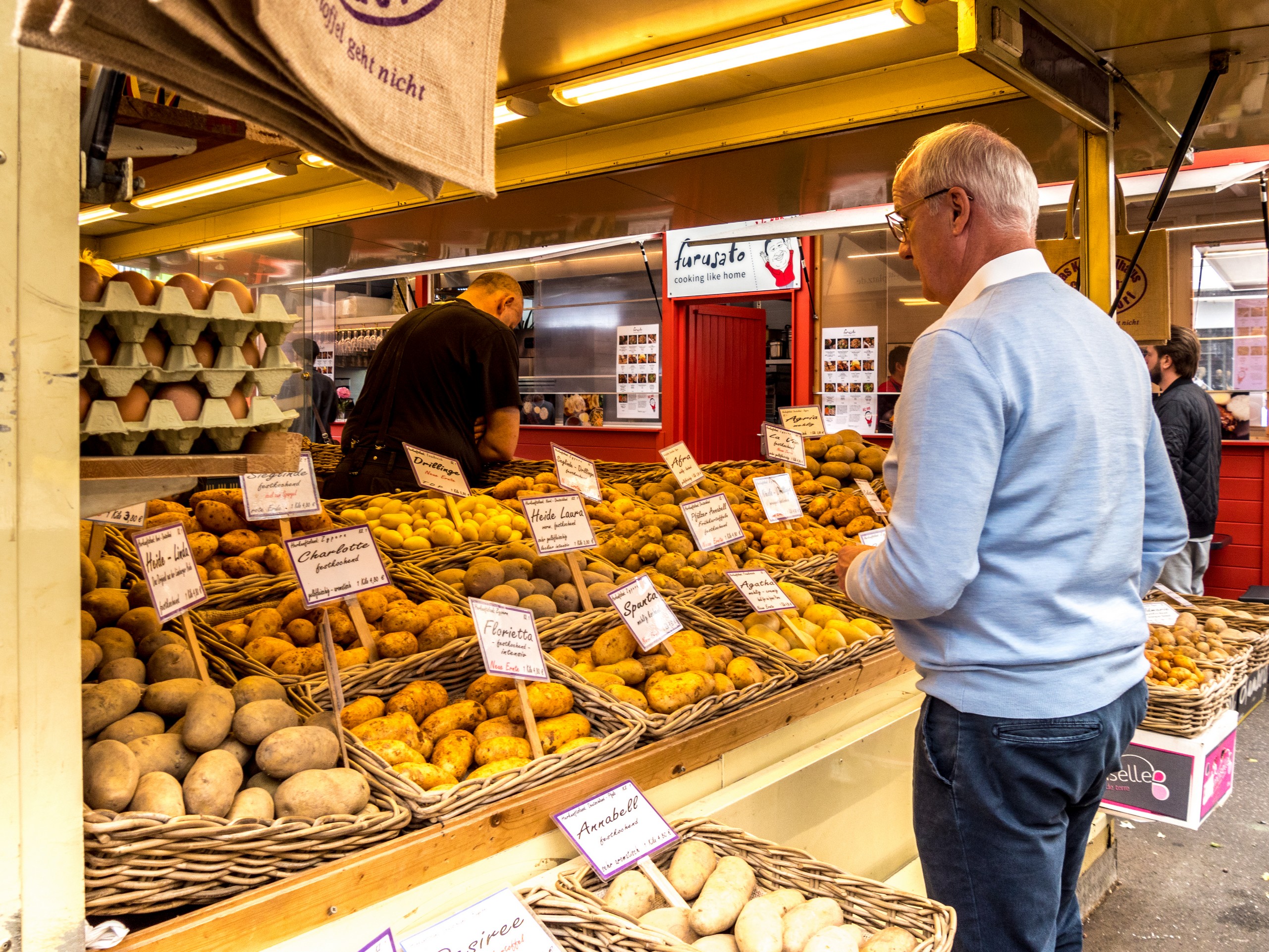 Juste le temps de me remettre de mes émotions en traversant le parc où se trouve le musée, et me me revoilà plongée dans la frénésie urbaine : il est passé midi, j’ai faim et un des endroits les plus conviviaux pour manger un bout, c’est sur la Carlsplatz ! Et pourquoi là me demanderas-tu, lectrice, lecteur ? Eh bien parce que c’est là que se trouve le marché permanent de Düsseldorf, ouvert du lundi au samedi. C’est un véritable marché avec ses fruits, ses légumes, ses viandes et ses poissons mais en plus, on y trouve des petits cafés, bars à vin, vendeurs de saucisses et de burgers. Toute la ville s’y retrouve : on vient y faire ses courses et y manger un morceau. Ce qui m’a fait sourire a été un stand qu’on ne droit trouver qu’en Allemagne : un maraîcher qui ne vendait que des pommes de terre : des blondes, des rouges, des très grandes aux très petites : un rêve pour les connaisseurs (mais pas vu une bintje pour les frites, tsss…).