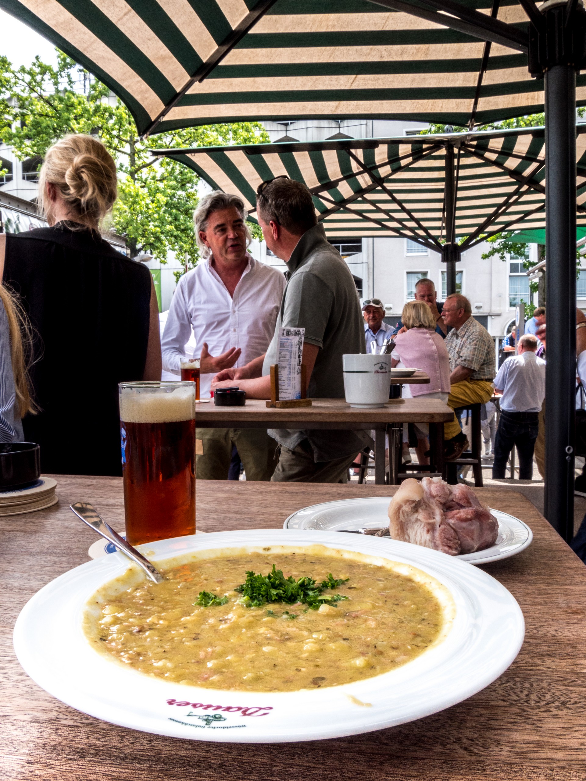 Entourant le marché, on trouve une ribambelle de cafés et de boulangeries et c’est à terrasse d’une institution que je vais m’installer : chez Dauser. Le patriarche Dauser avait ouvert une boucherie/restaurant près du port de la ville en 1947. En 1973, Jozef Dauser décide de préparer des soupes qui seraient vendues lors de grands évènements. Son goulasch était si bon qu’il devient la coqueluche de la ville et finalement, en 1979, l’établissement de Carlsplatz ouvre et n’a jamais désempli depuis. Si le goulasch n’était pas au menu, il parait que la soupe aux pois valait le détour. C’est donc ce que j’ai commandé (avec un morceau de genoux de porc) et que dire… C’était consistant (j’aurai pu me passer de la viande, il y en avait assez dans la soupe) mais aussi un véritable régal : Dauser n’a pas volé sa popularité et en plus, c’est plutôt bon marché (une grande soupe est à 6 euros).