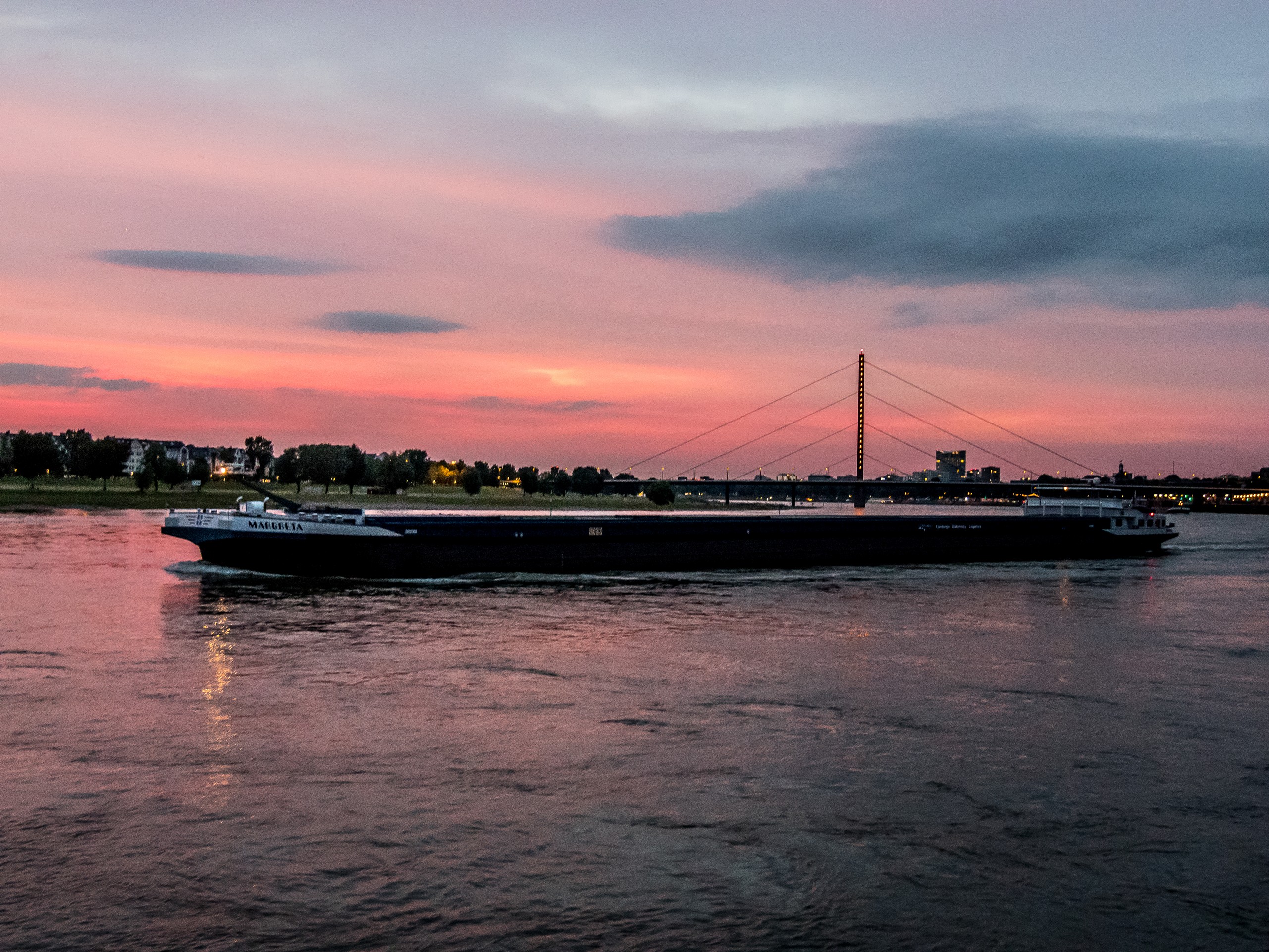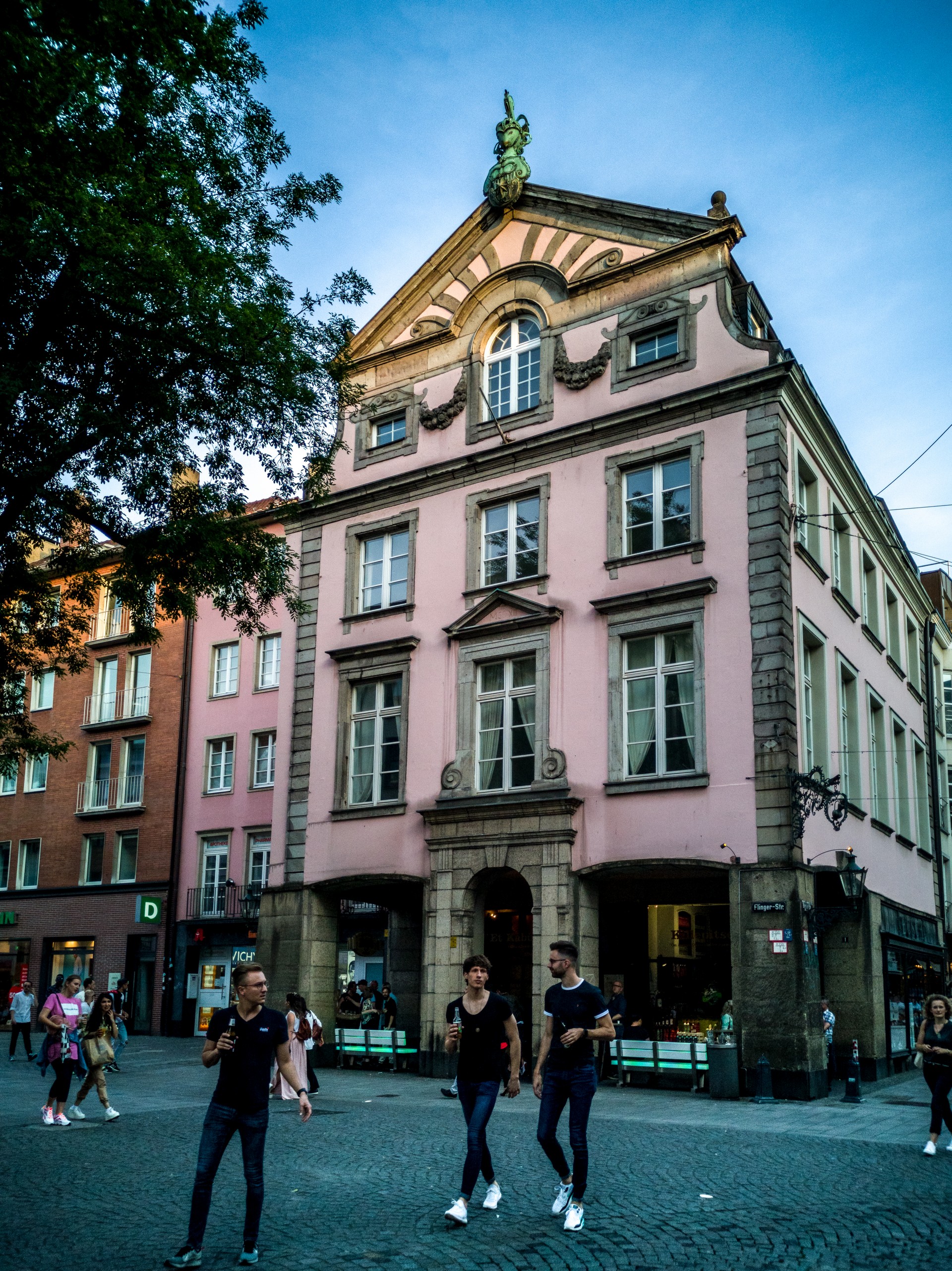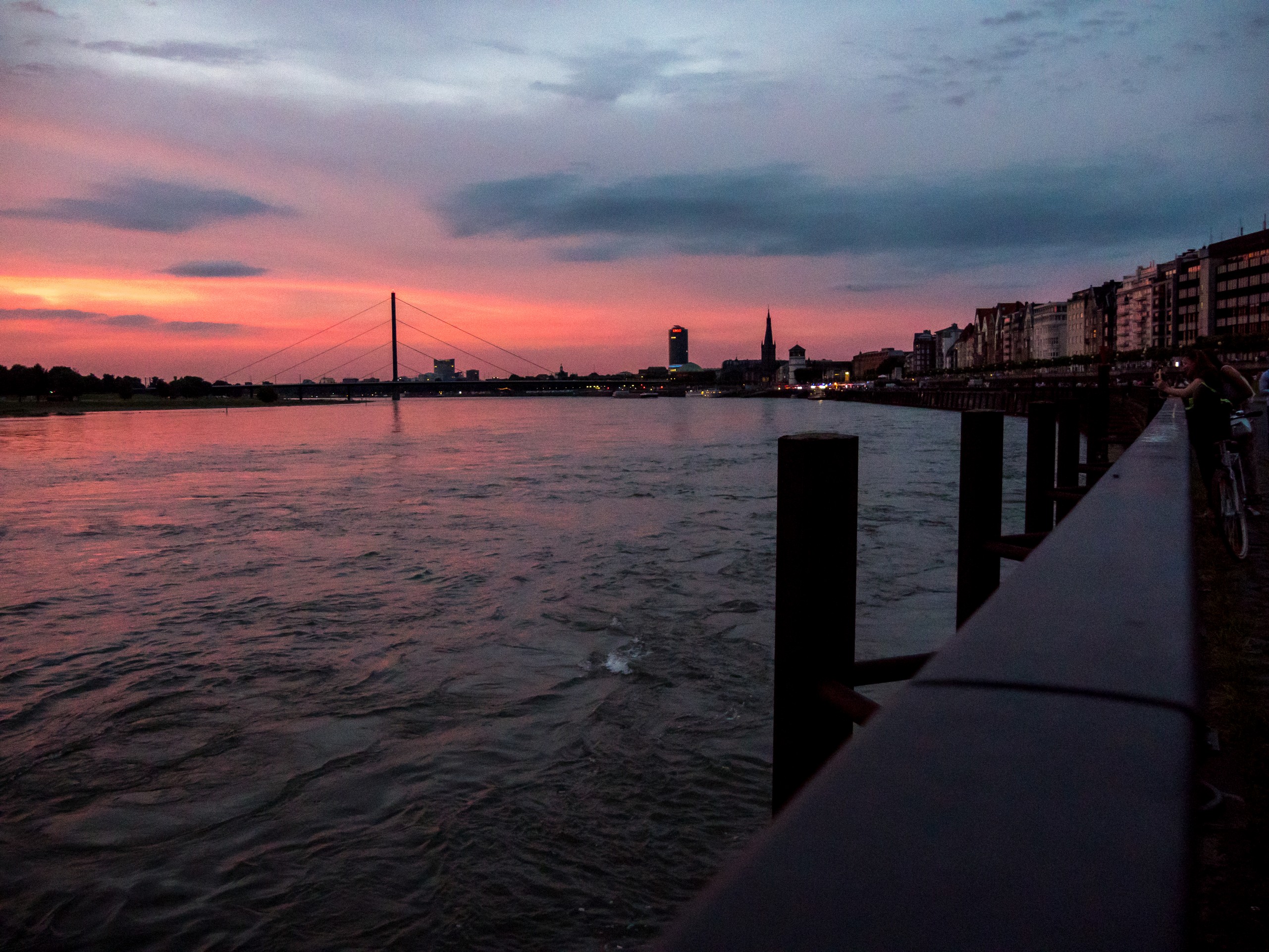 Le ciel est littéralement en feu : du rouge, de l’orange, beaucoup de rose… tout ça se reflète dans les eaux du Rhin sur lesquelles passent des longues péniches comme des ombres chinoises. C’est que ce fleuve est fort fréquenté, à la fois sur ses berges que dans son lit ! Il y a un va-et-vient incessant, surtout de péniches et comme nous sommes vendredi soir, la Promenade a une petite ambiance de fête dans l’air. De vieux couples promènent leur chien, des jeunes parents, leurs bébés, des bandes de grand ados vident des bières accoudés joyeusement aux rambardes de la promenade… La première impression de Dusseldorf est donc très positive : je me retrouve dans une ville vivante (je ne sais pas jusqu’à quel point) et plutôt jeune. L’air est doux et résonne de musique et de rire, je continue ma promenade vers la vieille ville et l’ambiance devient de plus en plus animée. Tout à coup, les quais sont transformés en un immense bar. Il doit y avoir au moins une dizaine d’établissements, côte à côte, qui sont installés là et tous sont pleins à craquer !