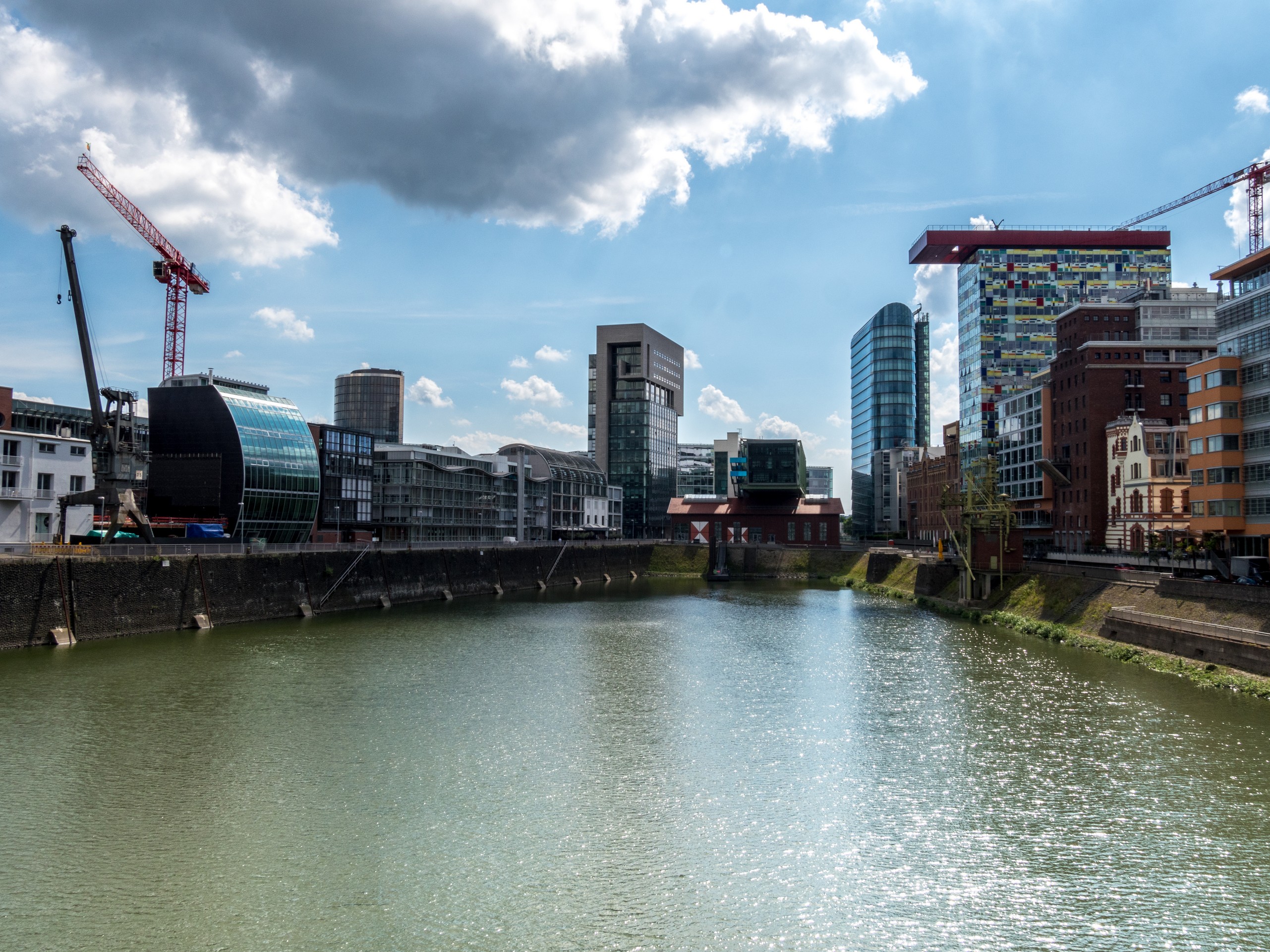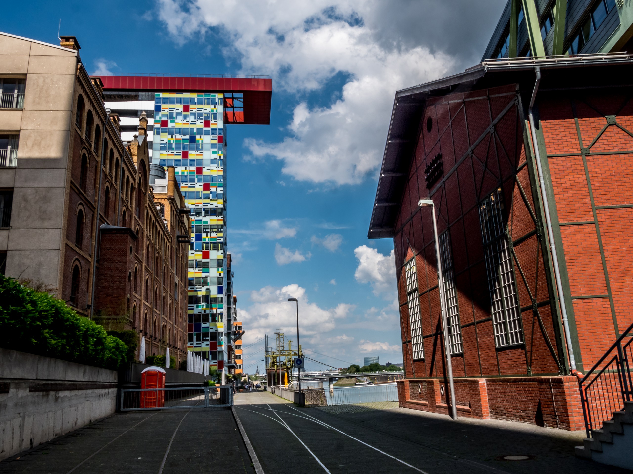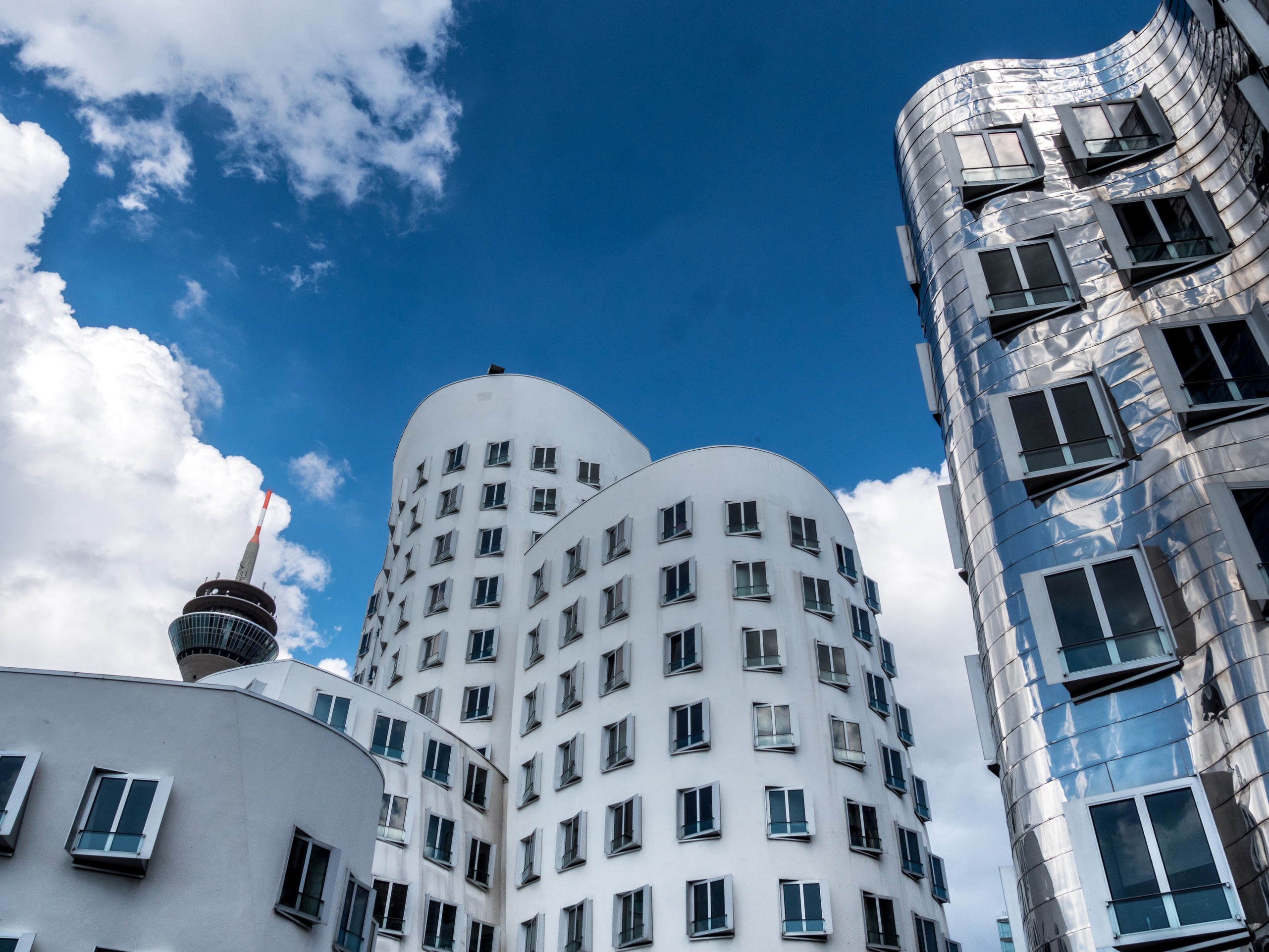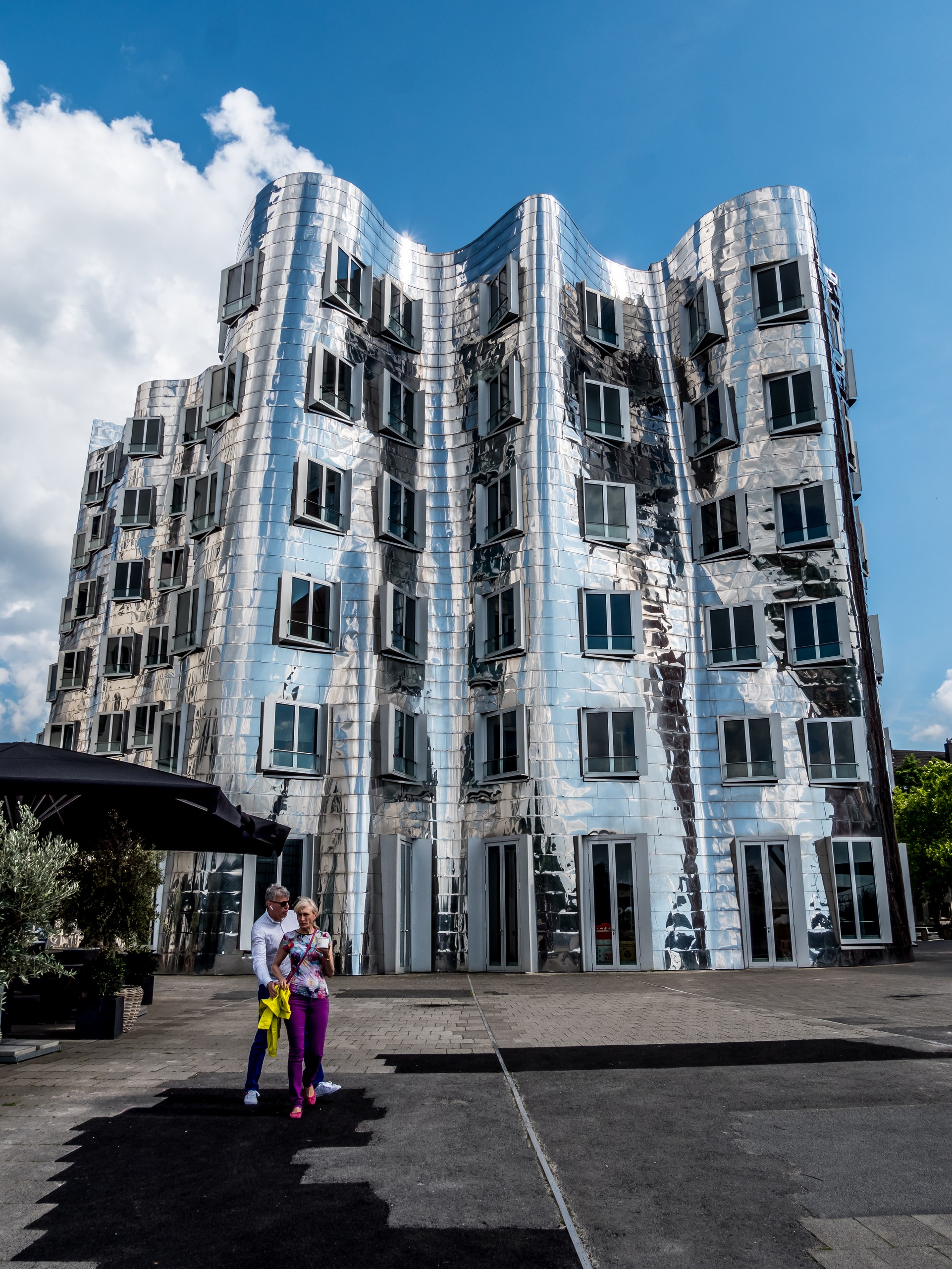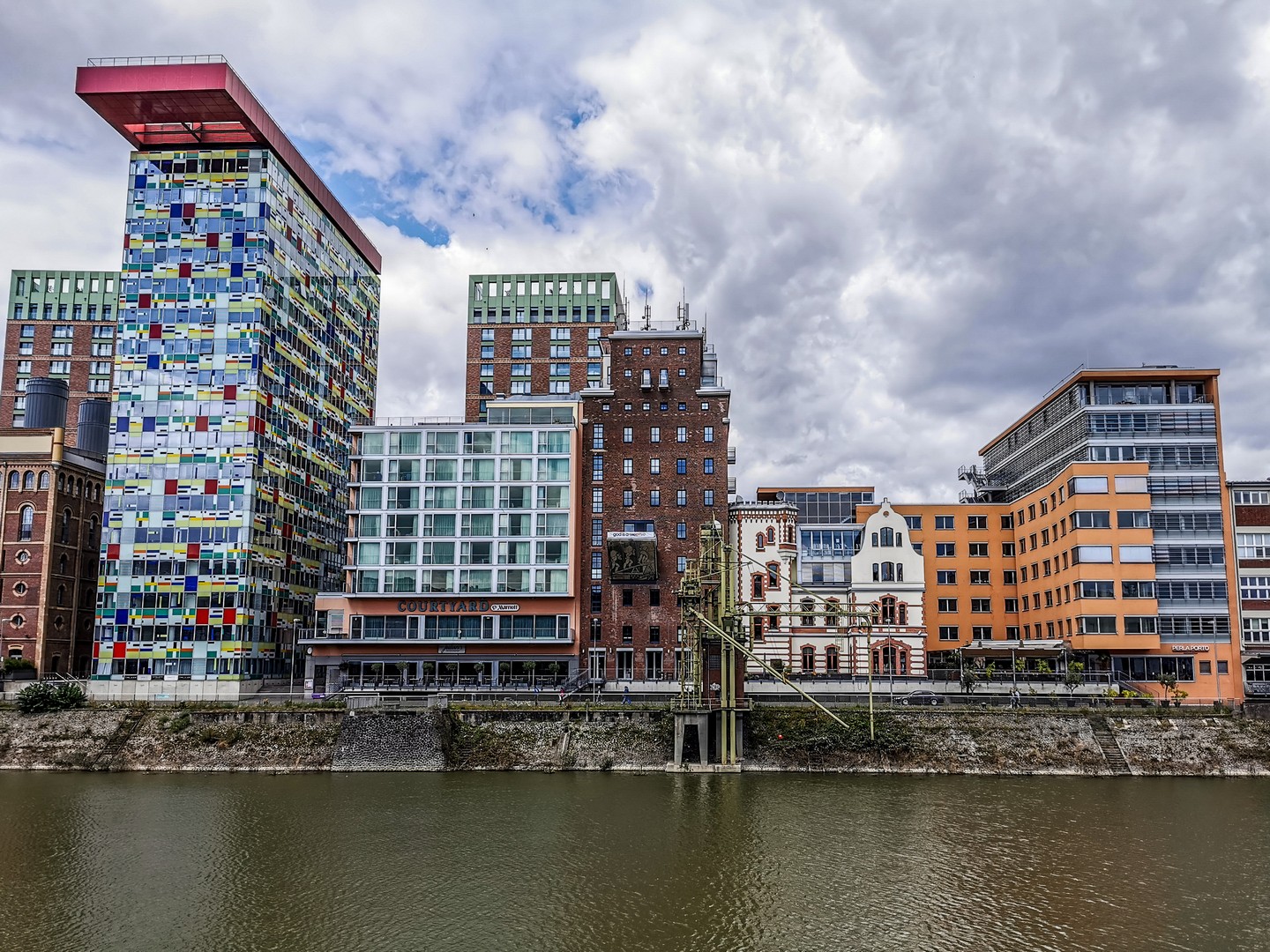 Je m’engouffre dans un métro, puis dans un tram (j’ai déjà acquis quelques repères en ville) pour retrouver un quartier plutôt insolite de Düsseldorf : Medienhafen.