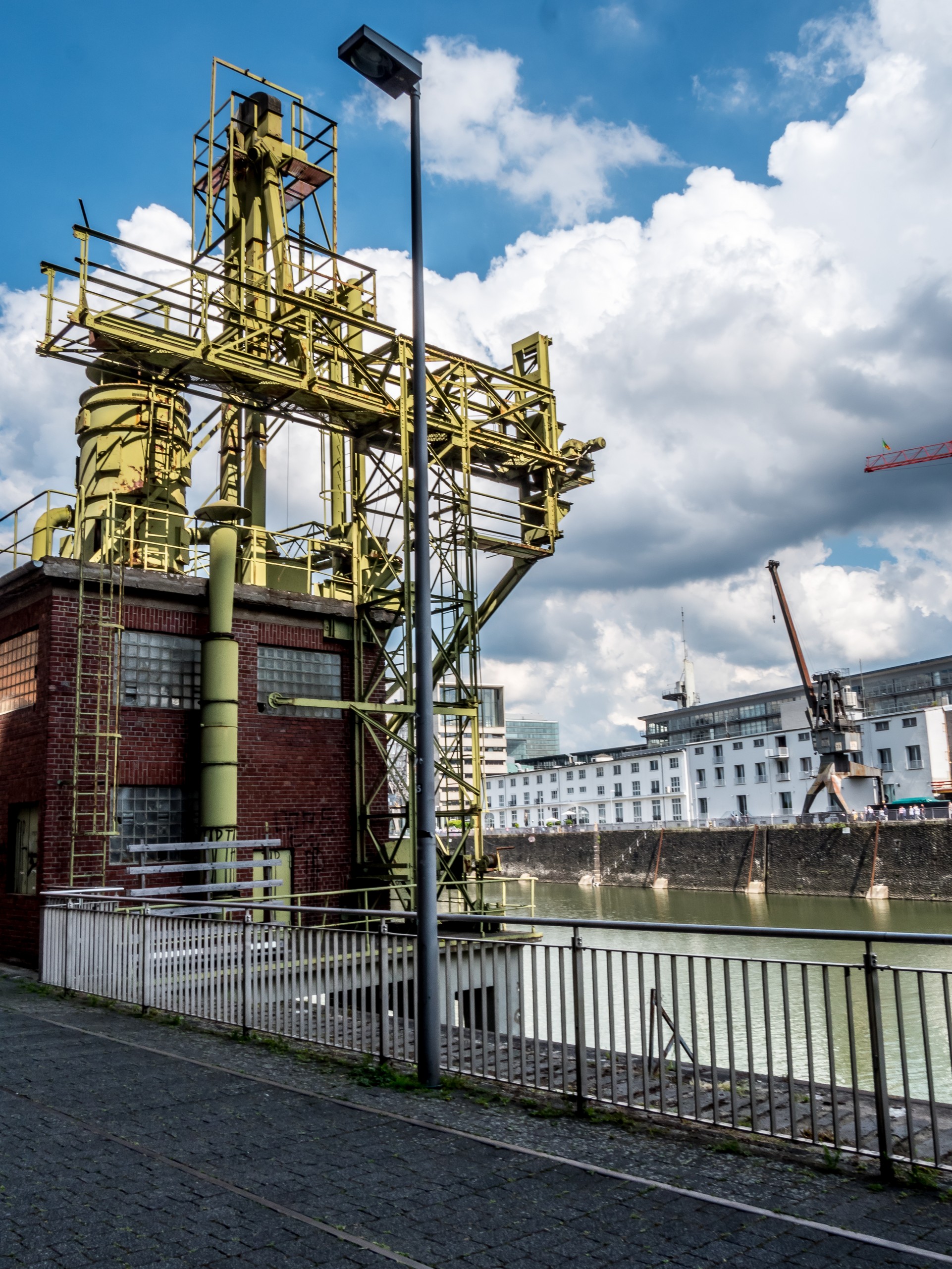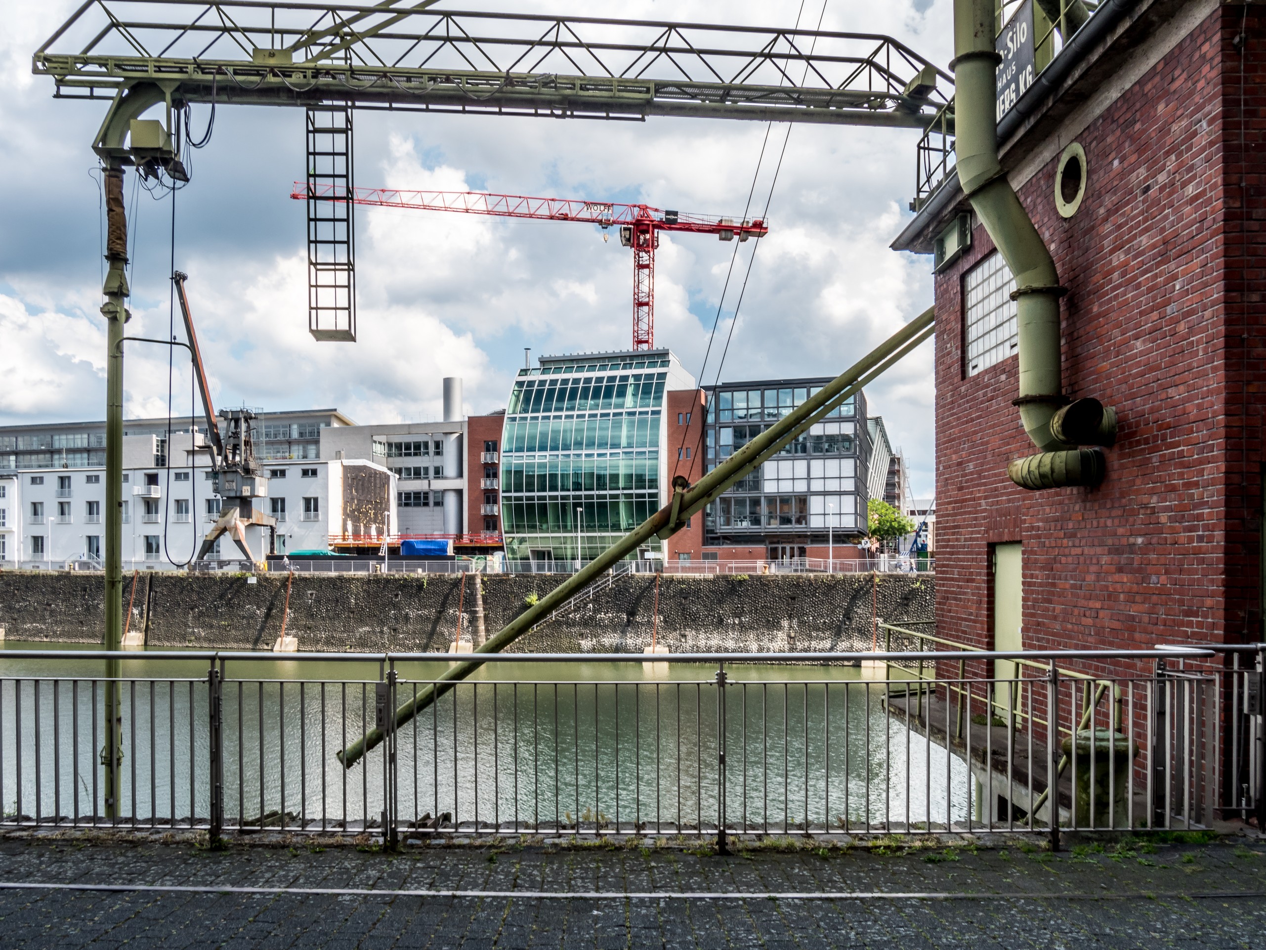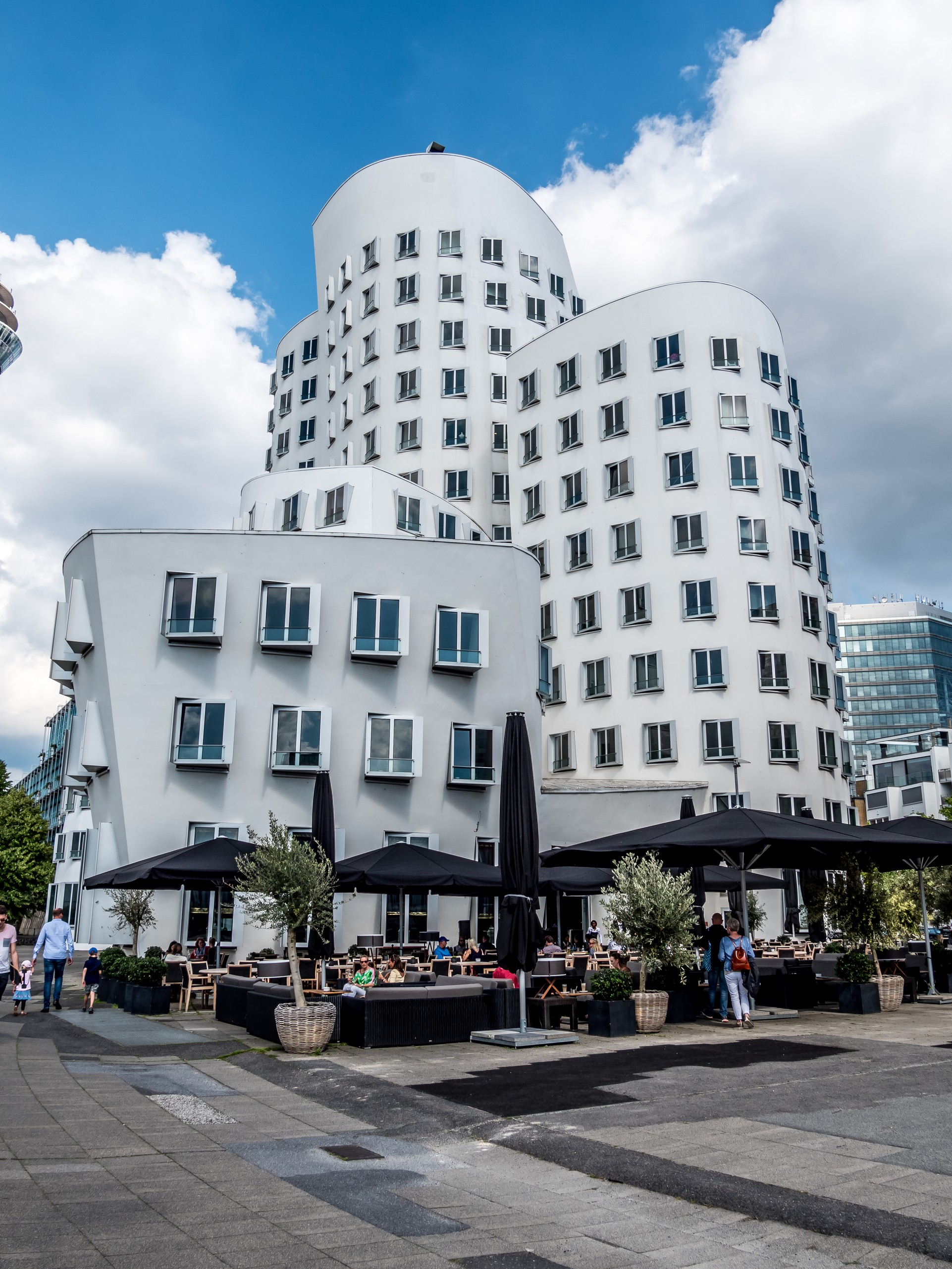 Tu connais, Lectrice, Lecteur, mon amour des anciens quartiers industriels et Medienhafen est un de ces nombreux exemples de réhabilitation d’un ancien port laissé à l’abandon. Les premiers à venir s’y établir furent les employés de la WDR, la télé-radio régionale, ainsi fut donné le nom de « Port des média » à ce nouveau quartier. Peu des installations et des anciens hangars sont restés en place lors de cette reconstruction. On a bien conservé un ancien bâtiment et quelques grues de dockers, mais c’est à peu près tout. Au contraire, on a laissé aux architectes carte blanche pour développer leurs envies des deux côtés du port. Et ce ne sont pas des moindres qui ont contribué à embellir le port : Richard Meier, Helmut Jahn, Claude Vasconi et son « Grand Bateau » (en français dans le texte), le « Colorium » de William Alsop… mais la star de Medienhafen, c’est Neuer Zollhoff, un ensemble de 3 maisons de Frank O. Gehry. L’une est en brique, la deuxième recouverte de métal et la troisième est recouverte de blanc mais toutes ont cette forme caractéristique de vague ondulante qu’on retrouve dans les oeuvres de Gehry, de Bilbao à Chicago.