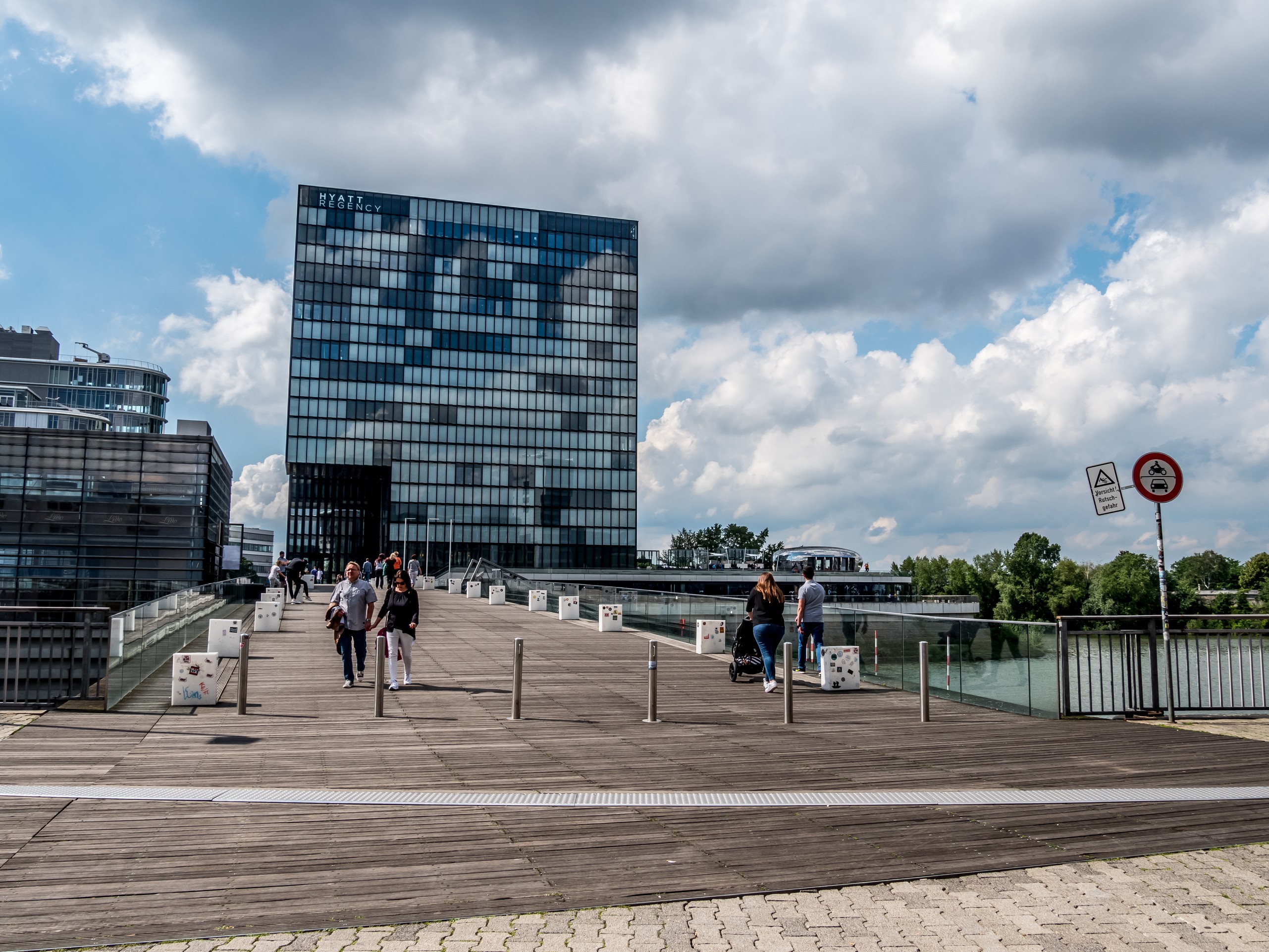 Pour ceux qui sont fans d’architecture, c’est un lieu extraordinaire mais que j’ai trouvé un peu stérile. Certes, Medienhafen abrite en son sein de beaux hôtels (dont le Hyatt, fortement recommandé par plusieurs guides pour avoir une belle vue sur la ville mais que je n’ai pas eu le temps de visiter) et des restaurants et cafés particulièrement raffinés mais ce n’est pas un quartier où l’on vit. Comme nous étions un samedi, et que les nombreux bureaux qui s’y trouvent étaient fermés, j’avais l’impression d’être dans une ville fantôme, à quelques exceptions prêts.