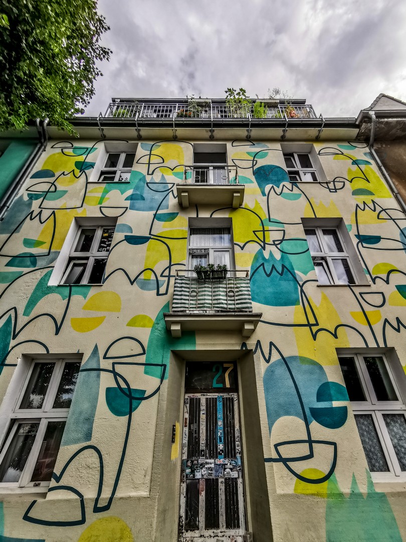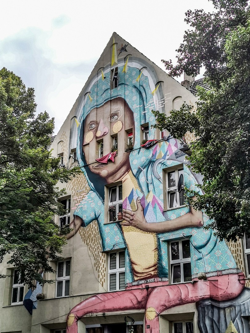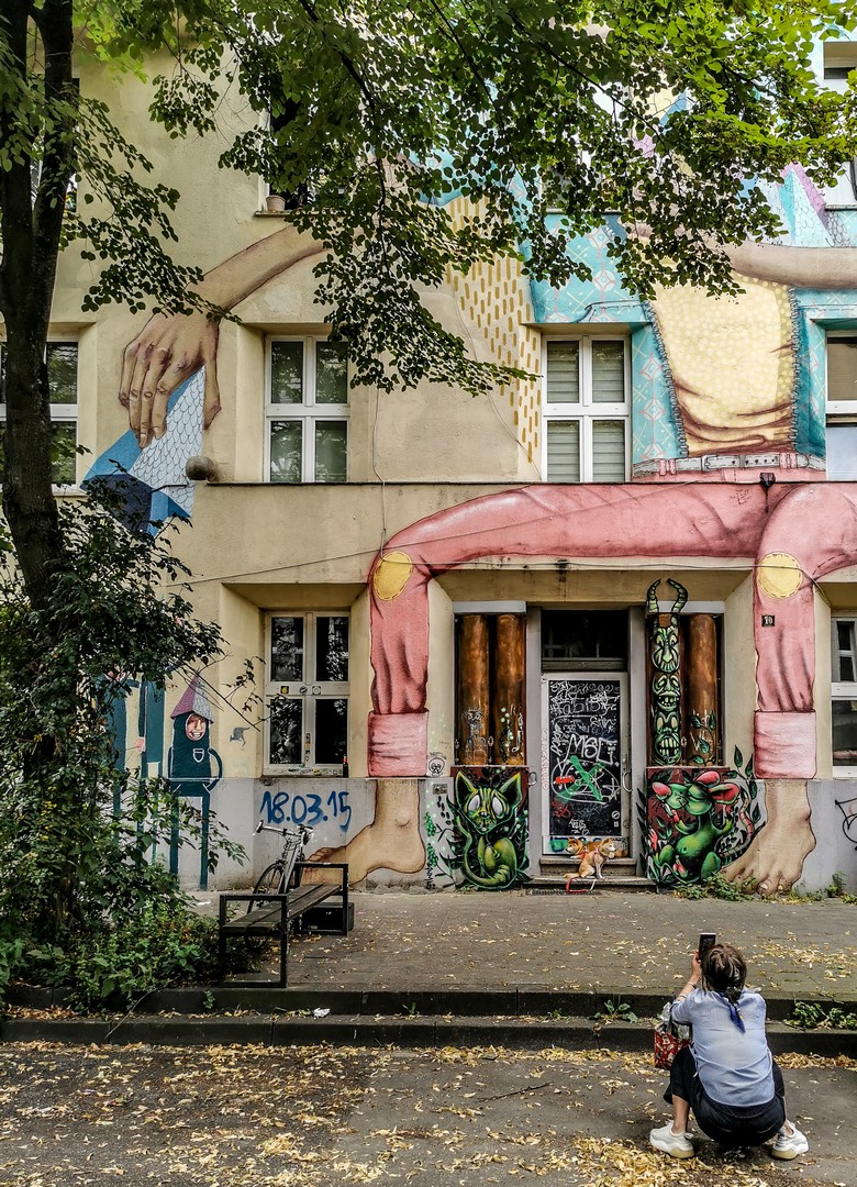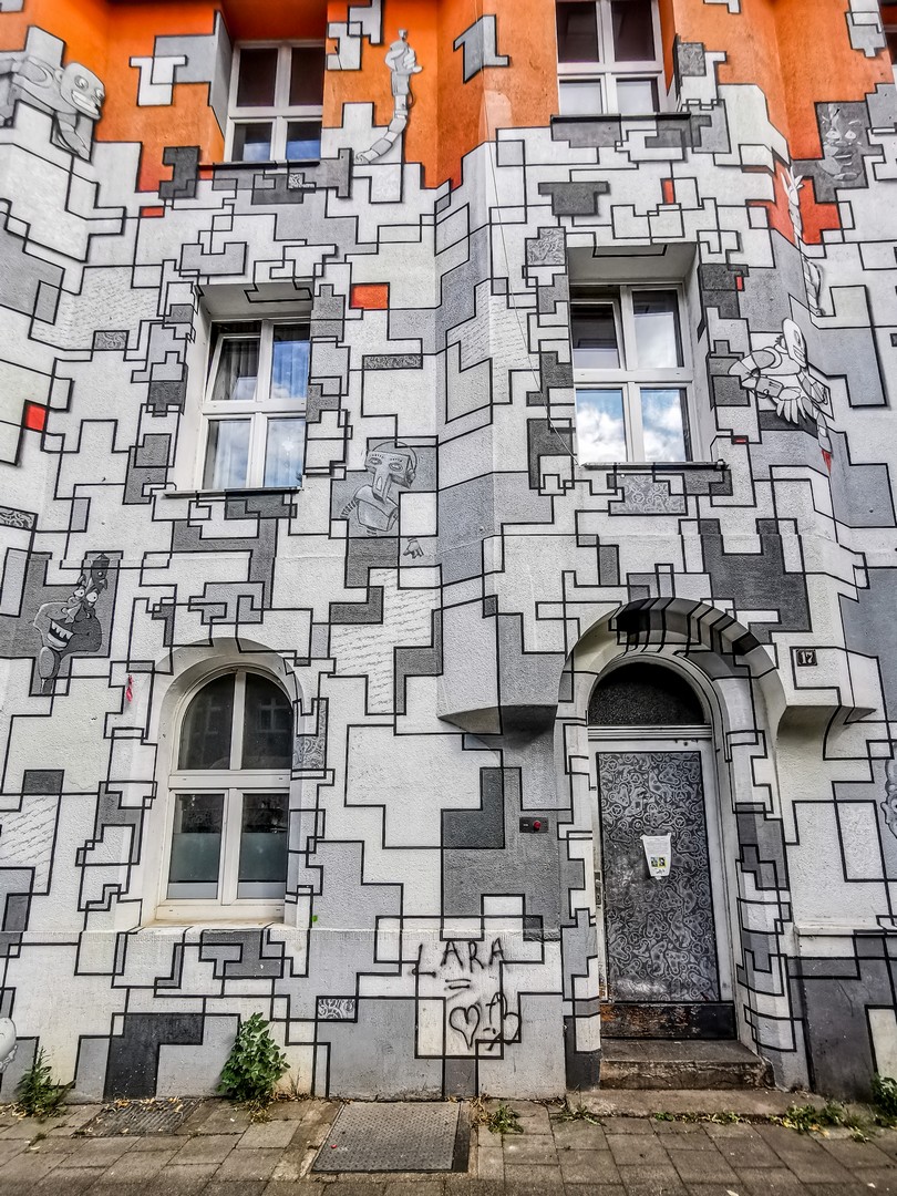 Après ce petit aparté historique, à quoi ressemble Kiefernstraße ? Tout simplement à une énorme œuvre de street art à elle toute seule. Toutes les maisons de la rue, sans exception, sont customisées avec des fresques géantes couvrant la totalité des façades. On y trouve tous les genres d’expression : de la simple peinture à la bombe en passant par les mosaïques et la sculpture… On en littéralement le souffle coupé tellement la quantité, l’ampleur et la qualité des œuvres est énorme. Surtout, Lectrice, Lecteur, ne loupe pas ça !
