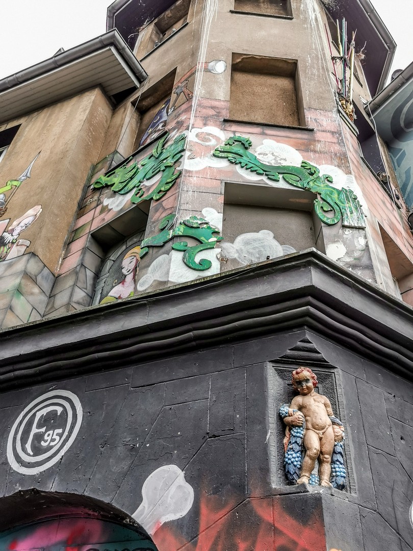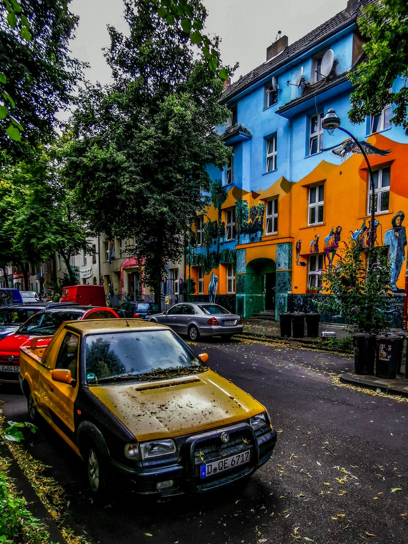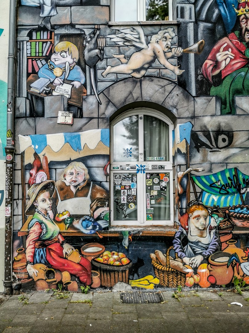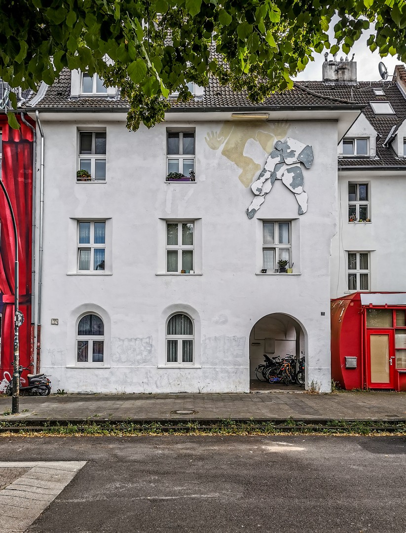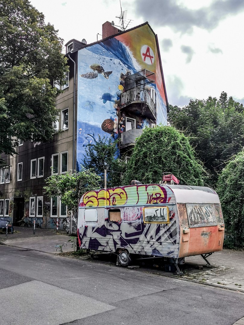 Toute grande ville a à présent une scène street art. C’est même devenu un atout non négligeable pour l’attractivité d’une cité mais à Düsseldorf, le street art a des racines profondes. Nous voilà à Flingern et plus précisément, Flingern-Sud, quartier alternatif-bobo un peu en dehors du centre-ville. Dans un coin un peu à part du quartier, se trouve une rue dont le destin semblait voué à cet art sauvage : Kiefernstraße. Au départ, les maisons qui la composent ont été érigées pour loger les ouvriers d’une usine juste à côté, ainsi que leurs familles. Lorsque l’usine ferma, la ville racheta les logements et avait le projet de les raser pour en faire une zone commerciale. C’était sans compter sur la résistance des habitants.