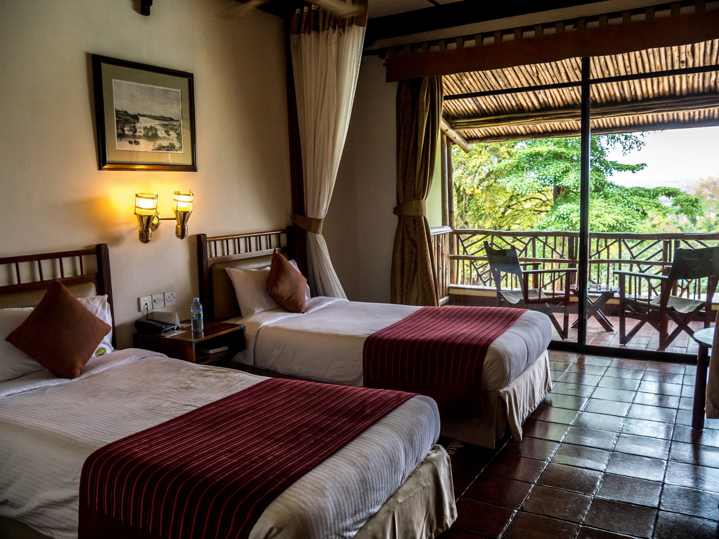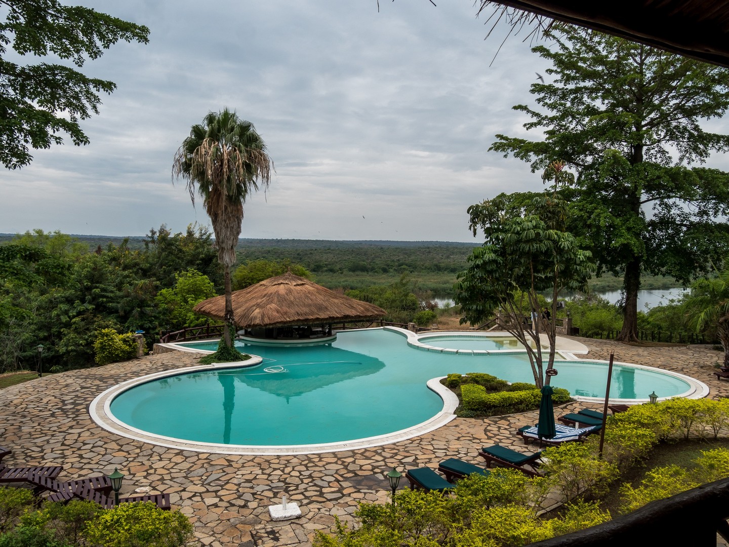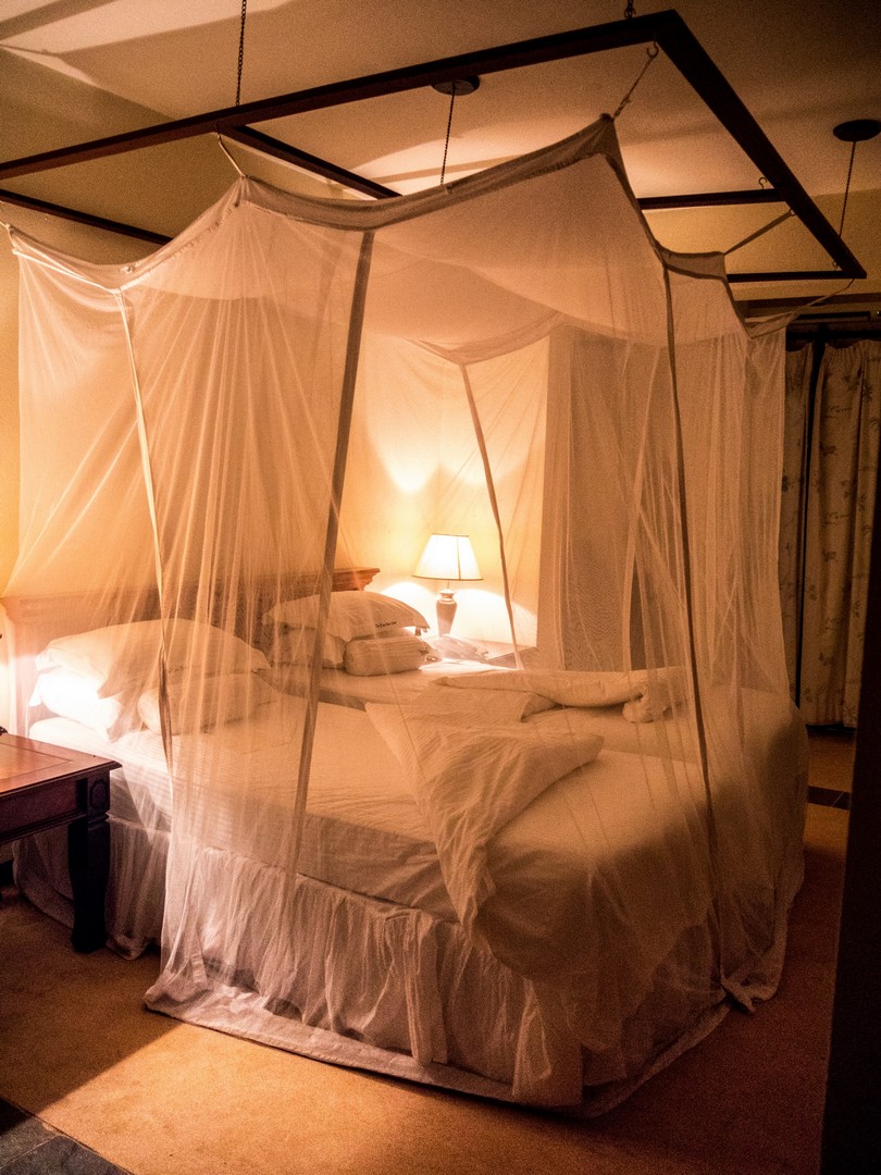 Nous avons séjourné au Paraa Safari Lodge, juste à l’entrée du circuit du safari. Plutôt que les logements à cases que nous verrons à la suite du voyage, il s’agit d’un hôtel classique mais hyper-confortable. Les chambres sont décorées dans un style afro-colonial, chacune pourvue d’un immense porche ou balcon avec vue sur le Nil (malheureusement, nous n’aurons pas vraiment pu en profiter). L’hôtel possède un grand restaurant et un très joli ainsi qu’une grande piscine. Autre point positif, vous pouvez louer une voiture ou réserver vos excursions directement depuis l’hôtel.