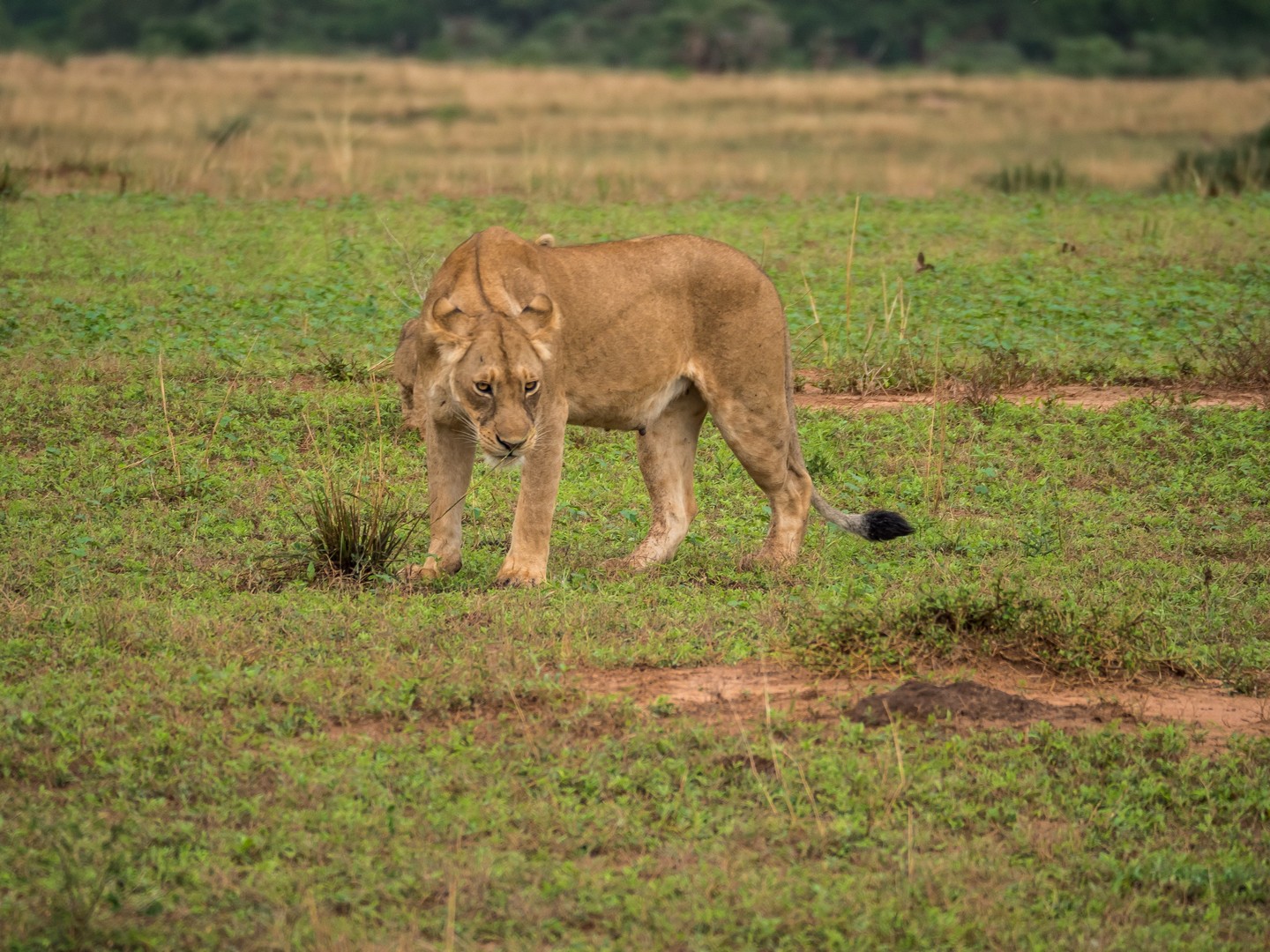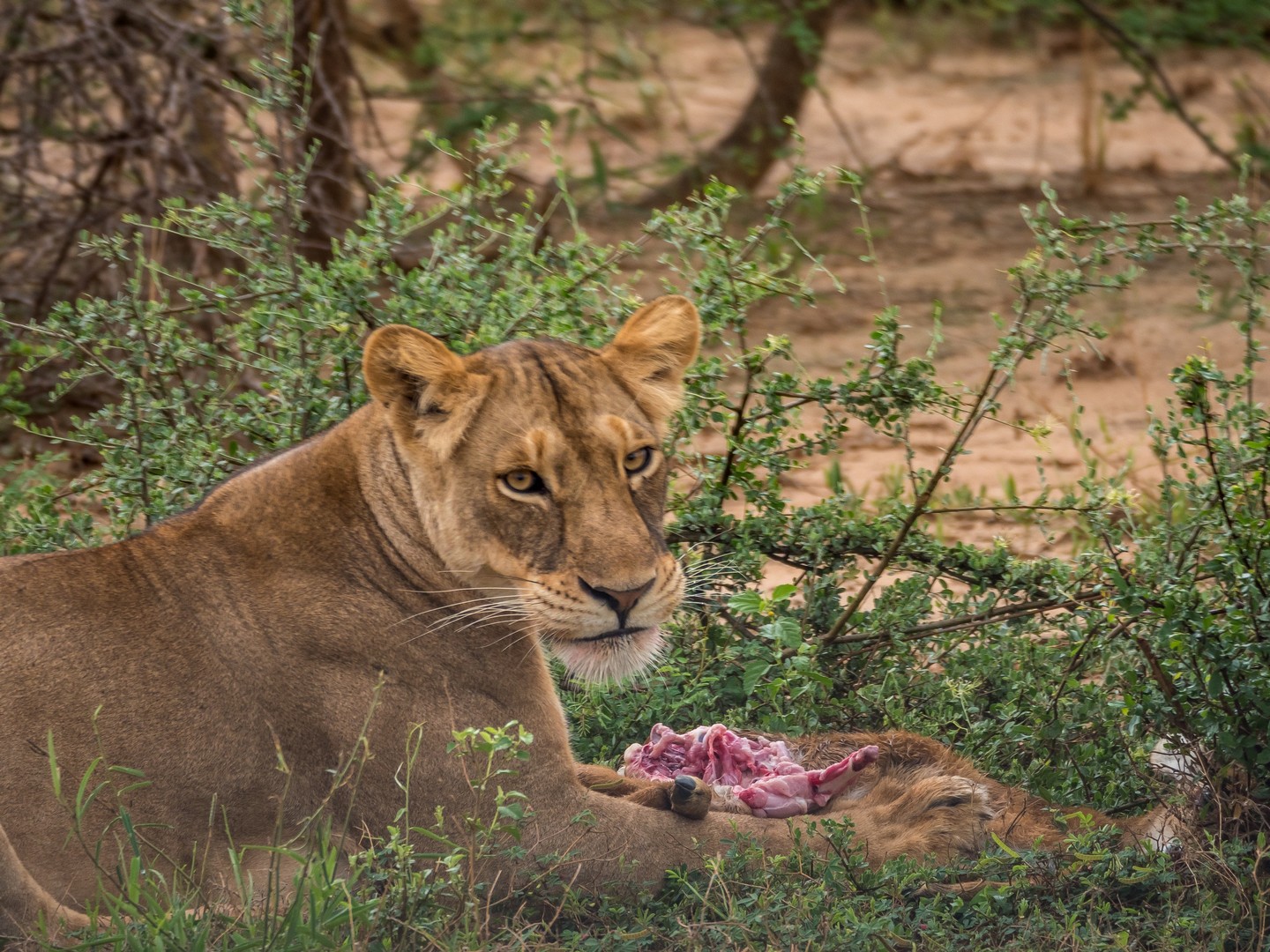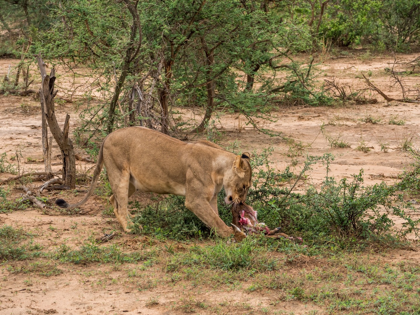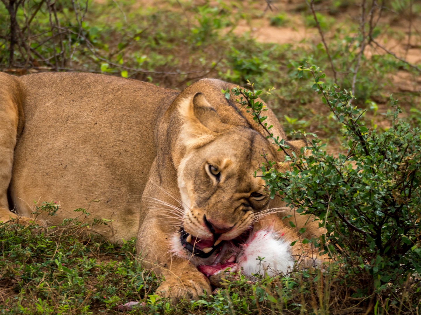Nous continuons encore un peu plus loin et soudain, la voiture de devant s’arrête, on ouvre le toit pour permettre de mieux voir et il semble que l’excitation est à son comble. Qu’est-ce qu’ils ont vu ??? Bientôt, nous le voyons aussi : en direction du fleuve, deux lionnes et deux paires de très jeunes lionceaux. Et là, c’est moi qui suis au comble de la joie. Si tu m’es fidèle, Lectrice, Lecteur, tu sais que je suis une grosse fan des félins en tous genres. De tout le règne animal, ce sont eux qui me fascinent le plus et pour la première fois, je vois des lions en liberté ! Avec des lionceaux en plus. Quatre petits Simbas tous neufs ! Nous avons la permission de faire du hors-piste et suivons à bonne distance les femelles puis nous arrêtons. On a compris, à notre droite, une carcasse d’antilope est en train d’être nettoyée par un marabout et une bande de vautours. Et là, sur cette savane, tout à coup, c’est une scène digne du roi-lion qui va se jouer : une lionne derrière un buisson semble lécher quelque chose. Est-ce un lionceau ? La léchouille a l’air un peu rude. Mais non… en y regardant bien, c’est une petite antilope à peine chassée qu’elle va dévorer ! Je crois que je n’oublierai jamais le bruit des os de la pauvre bête craquant sous la mâchoire du fauve et son regard comblé quand coule enfin le sang. Le museau rougit, elle fouille et refouille dans les entrailles de l’antilope. Autour de nous, des girafes se promènent, altières. Des antilopes, sachant qu’elle n’ont plus rien à craindre pour le moment, sont encore là et les charognards continuent de dépecer ce qu’il reste de l’autre carcasse. Je sais que je ne suis pas la seule à avoir voulu chanter « It’s the circle of liiiiiiiiiiife… » !