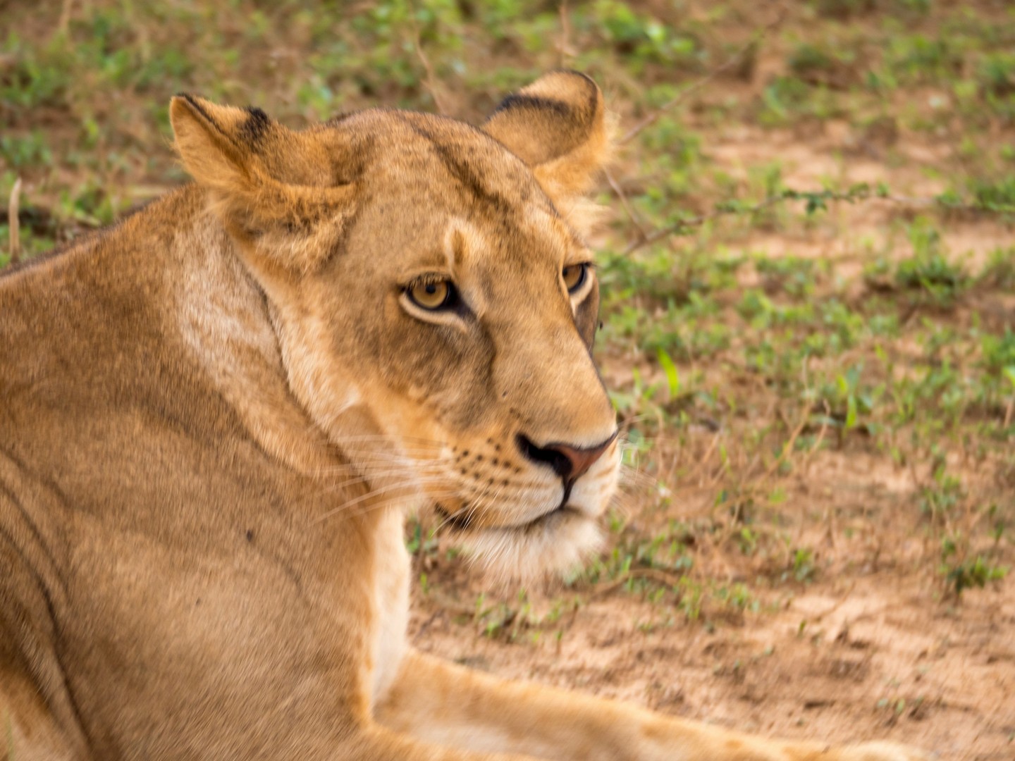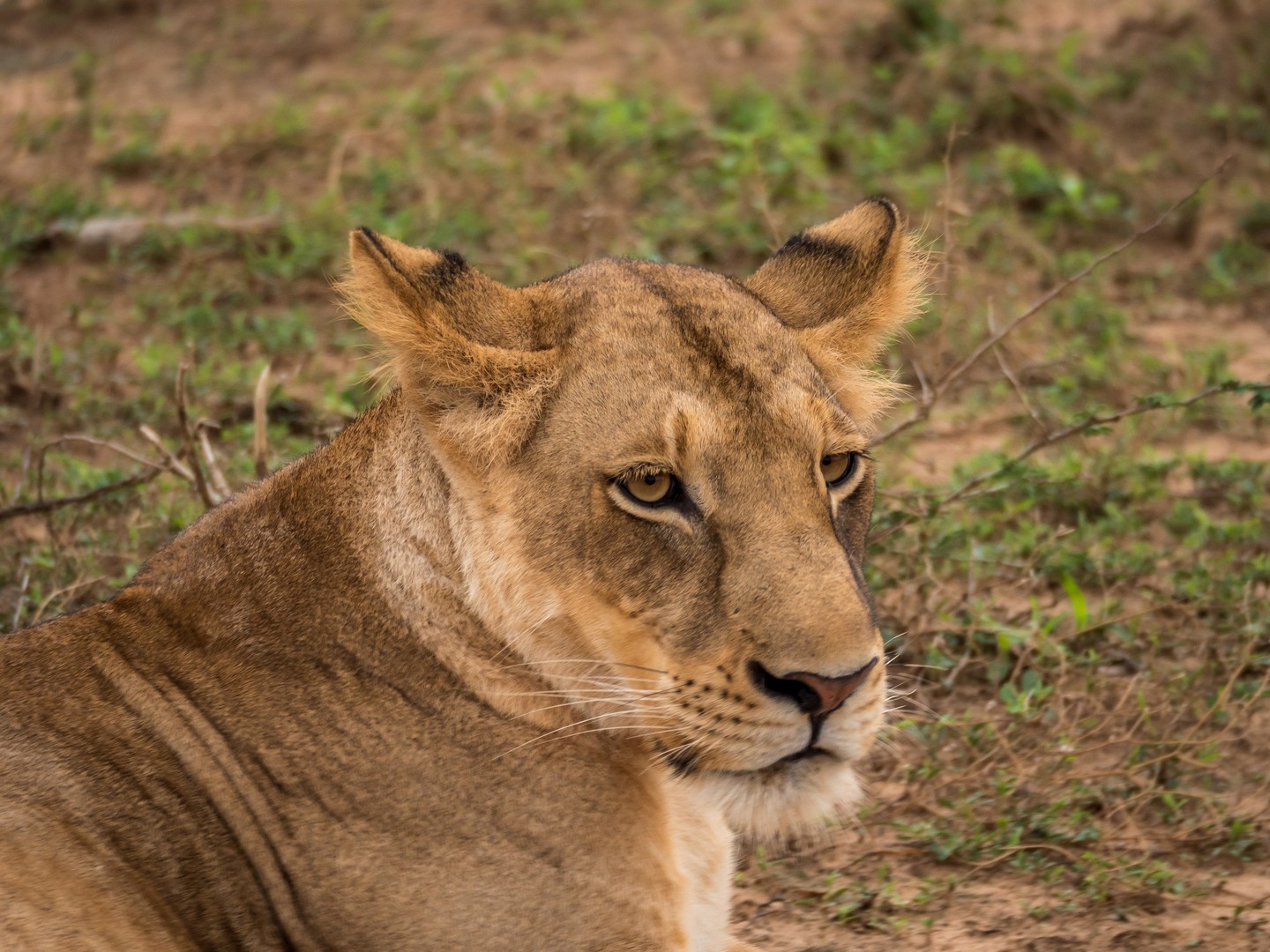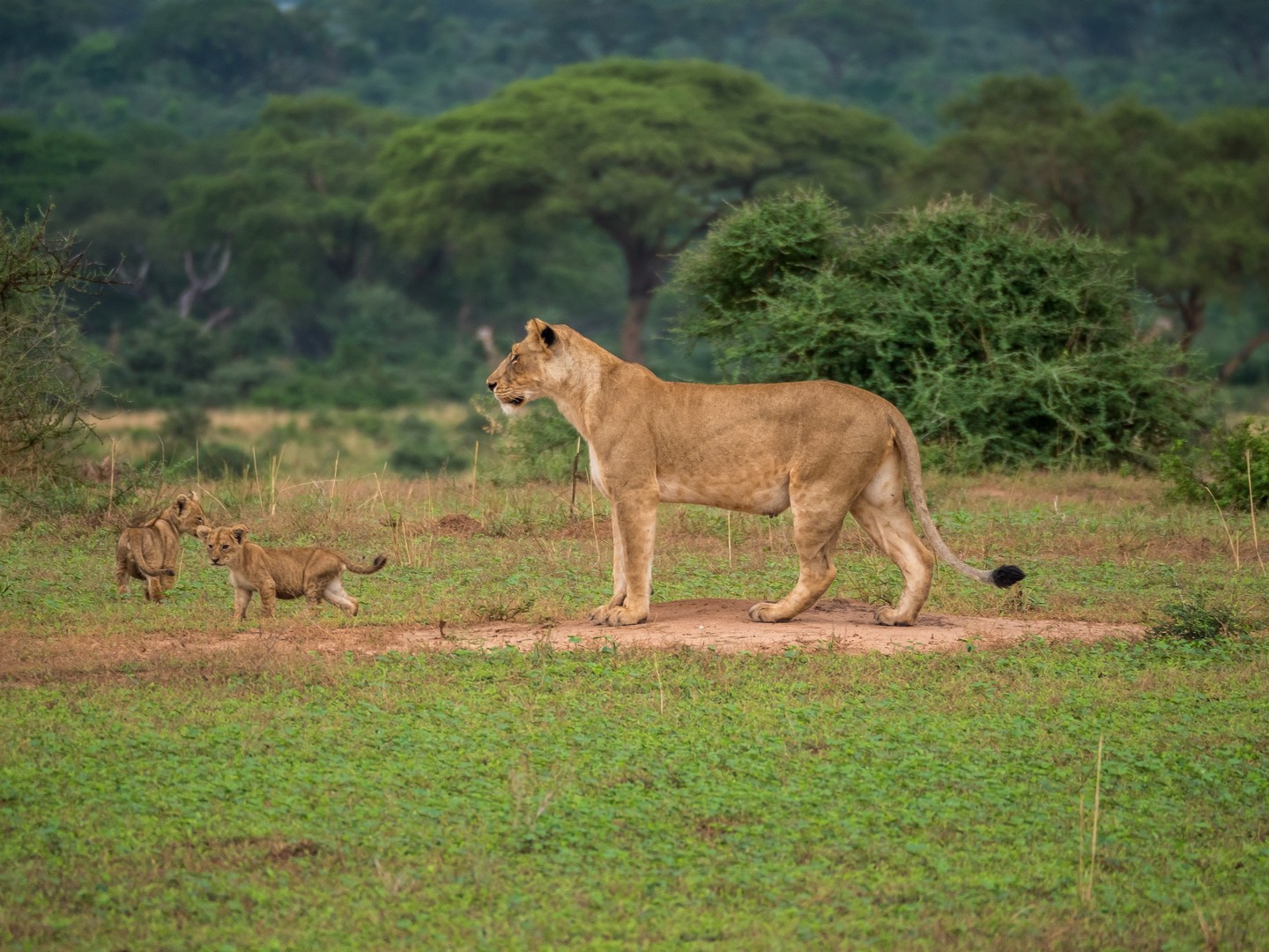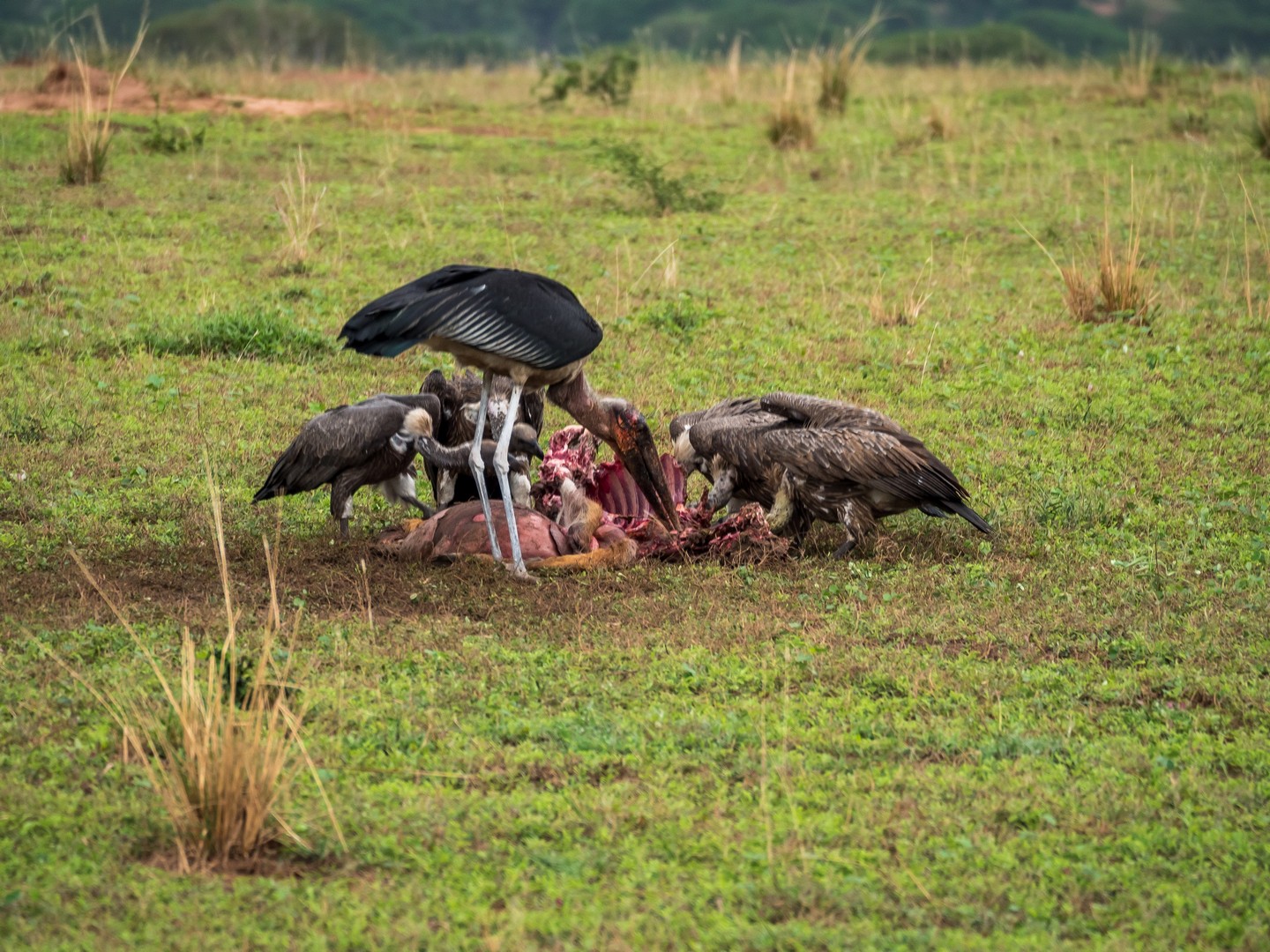 Nous continuons encore un peu plus loin et soudain, la voiture de devant s’arrête, on ouvre le toit pour permettre de mieux voir et il semble que l’excitation est à son comble. Qu’est-ce qu’ils ont vu ??? Bientôt, nous le voyons aussi : en direction du fleuve, deux lionnes et deux paires de très jeunes lionceaux. Et là, c’est moi qui suis au comble de la joie. Si tu m’es fidèle, Lectrice, Lecteur, tu sais que je suis une grosse fan des félins en tous genres. De tout le règne animal, ce sont eux qui me fascinent le plus et pour la première fois, je vois des lions en liberté ! Avec des lionceaux en plus. Quatre petits Simbas tous neufs ! Nous avons la permission de faire du hors-piste et suivons à bonne distance les femelles puis nous arrêtons. On a compris, à notre droite, une carcasse d’antilope est en train d’être nettoyée par un marabout et une bande de vautours. Et là, sur cette savane, tout à coup, c’est une scène digne du roi-lion qui va se jouer : une lionne derrière un buisson semble lécher quelque chose. Est-ce un lionceau ? La léchouille a l’air un peu rude. Mais non… en y regardant bien, c’est une petite antilope à peine chassée qu’elle va dévorer ! Je crois que je n’oublierai jamais le bruit des os de la pauvre bête craquant sous la mâchoire du fauve et son regard comblé quand coule enfin le sang. Le museau rougit, elle fouille et refouille dans les entrailles de l’antilope. Autour de nous, des girafes se promènent, altières. Des antilopes, sachant qu’elle n’ont plus rien à craindre pour le moment, sont encore là et les charognards continuent de dépecer ce qu’il reste de l’autre carcasse. Je sais que je ne suis pas la seule à avoir voulu chanter « It’s the circle of liiiiiiiiiiife… » !