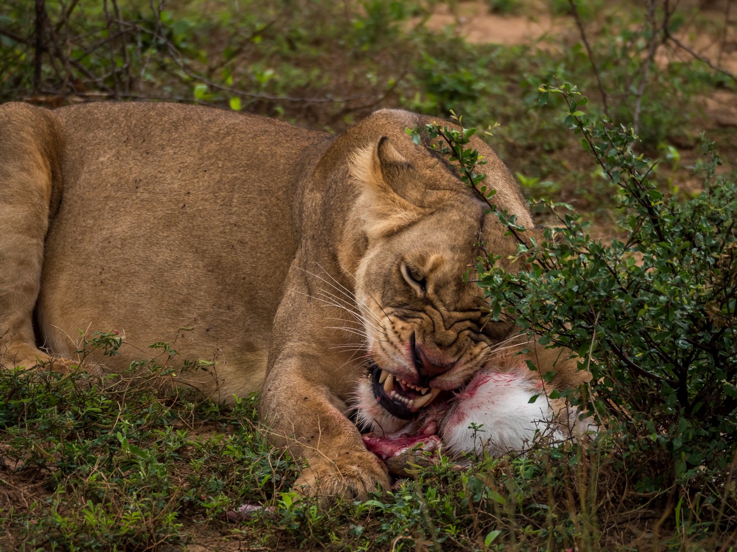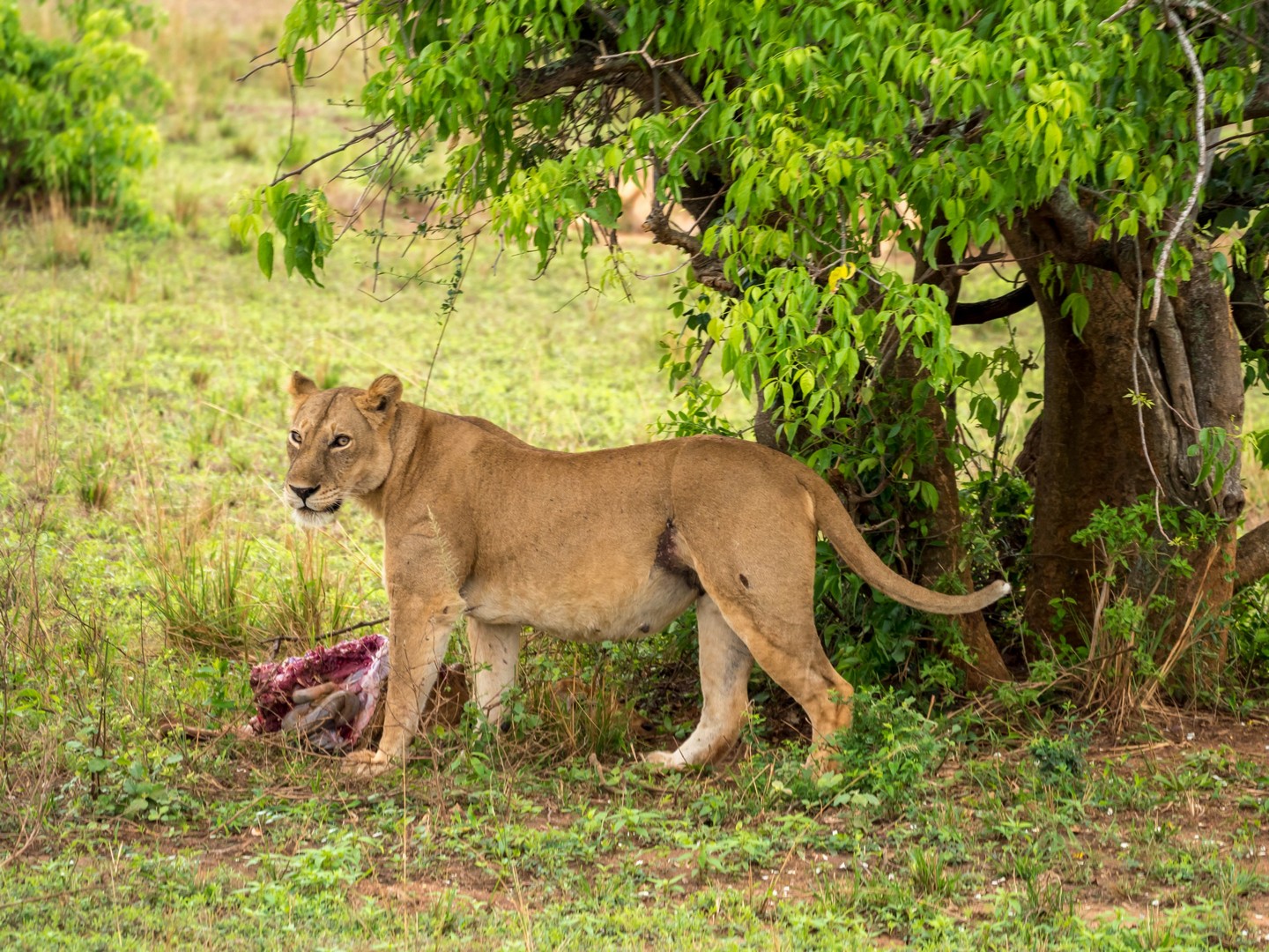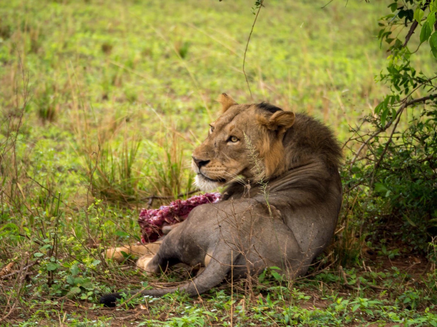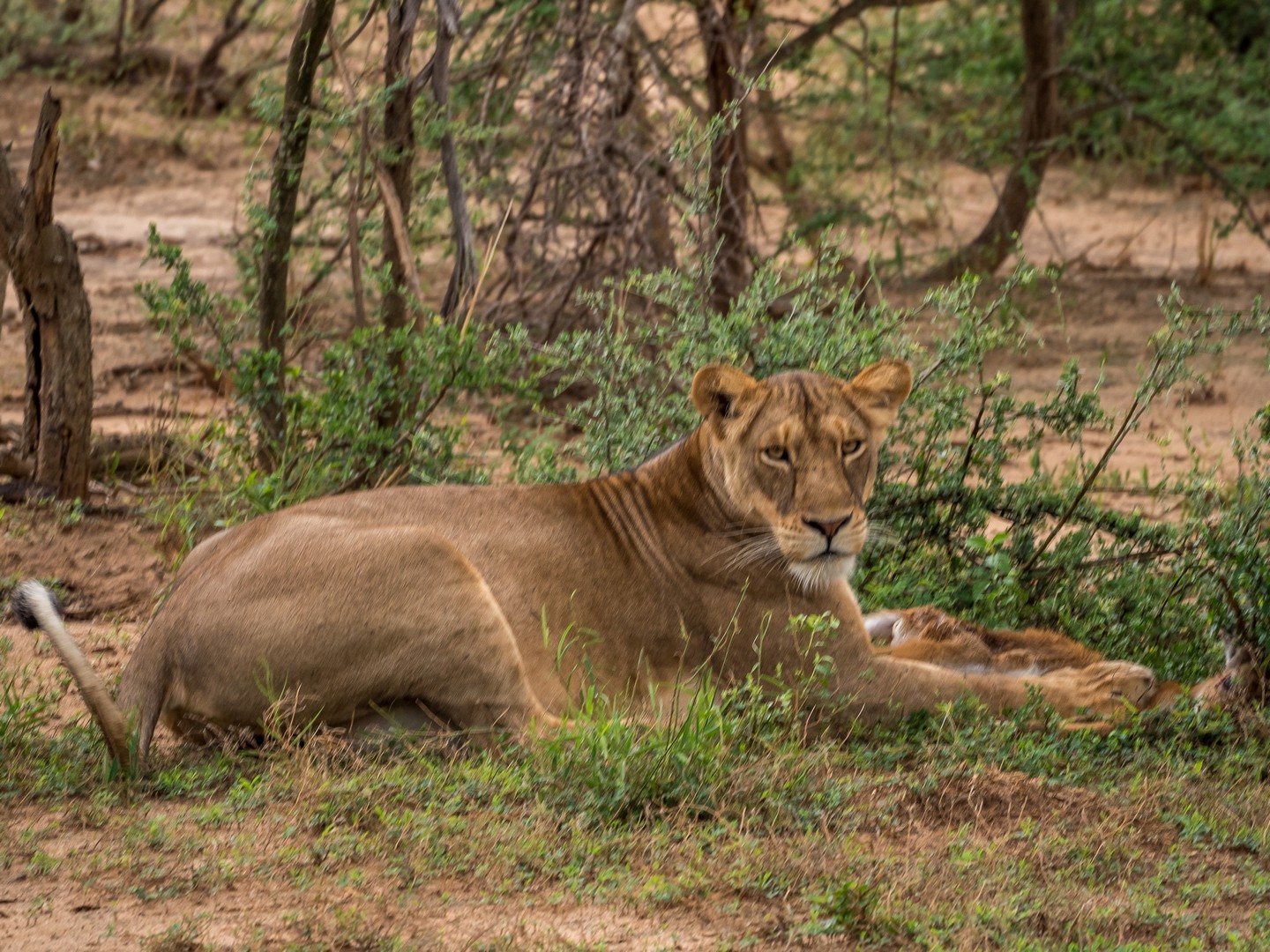 Nous allons même assister à une véritable « cat fight ». La deuxième femelle, pensant que la première avait terminé de se régaler, a voulu également prendre une bouchée de l’antilope. Mais non, un gros grognement et un violent coup de patte qui nous a tous fait battre en retraite dans les camions ont vite remis la gourmande à sa place. TRES impressionnant ! Et un peu plus loin, c’est carrément un lion (à la maigre crinière, mais un lion quand même) que nous allons entendre rugir !