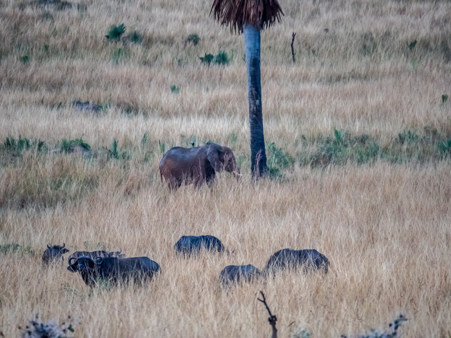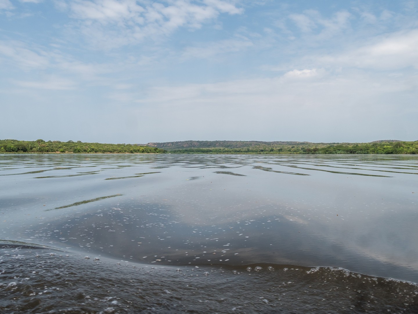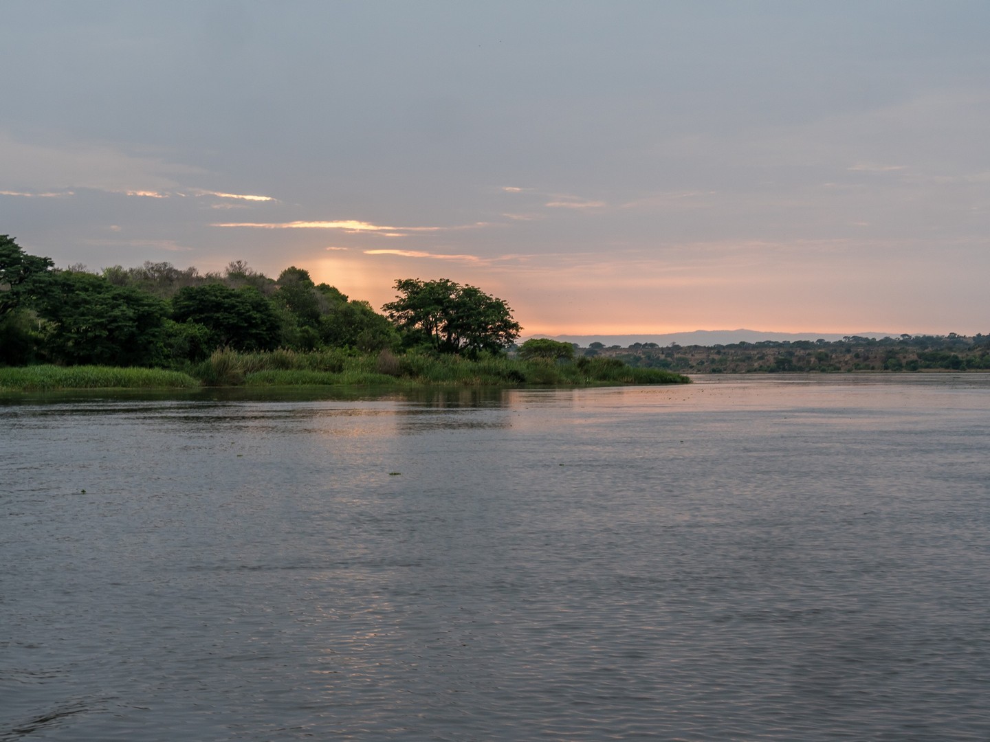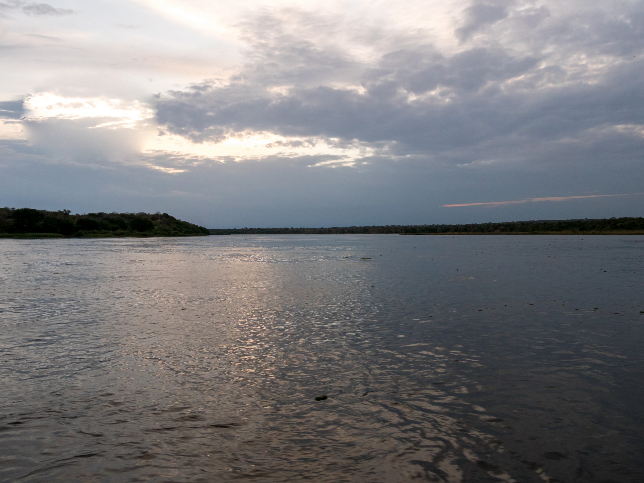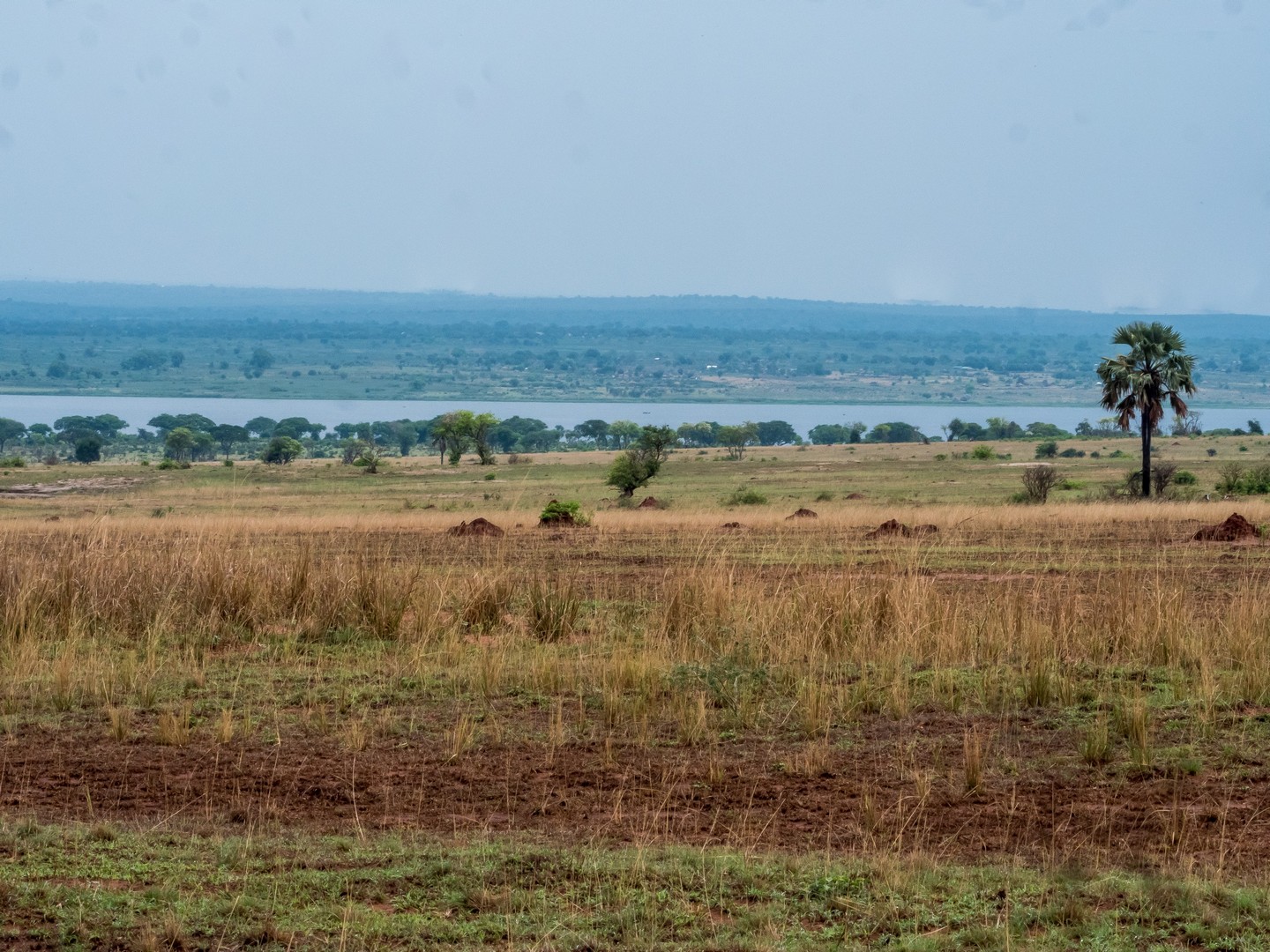 Le jour se lève enfin, colorant la savane de bleu puis de vert et jaune. Je ne m’attendais pas à çà : devant nous, c’est un immense paysage de plaine doucement vallonnée, couverte de buissons, d’herbes et plantée de ci de là de quelques acacias et même des palmiers, le tout sous un grand ciel et avec le fleuve en arrière plan, dépendant de la zone où nous sommes.