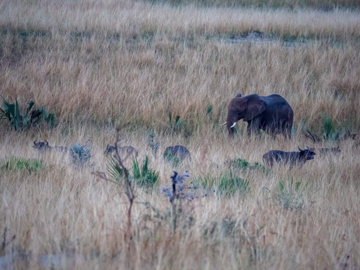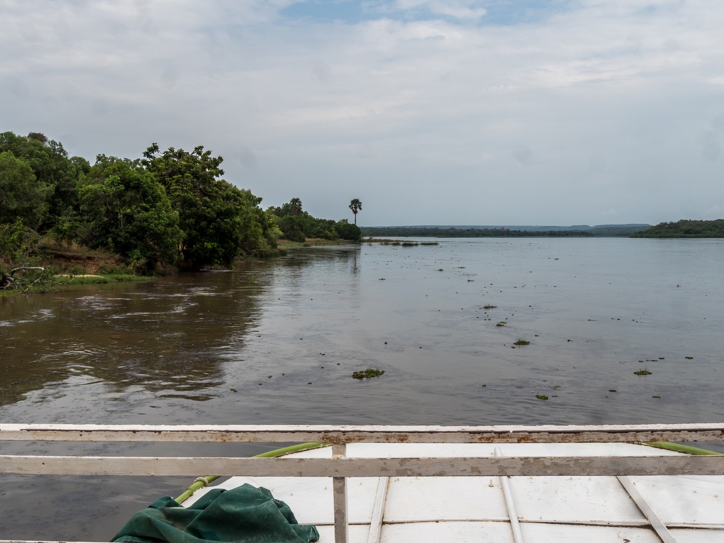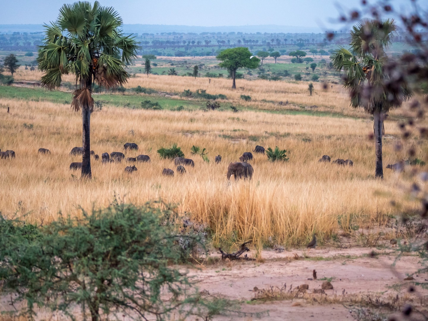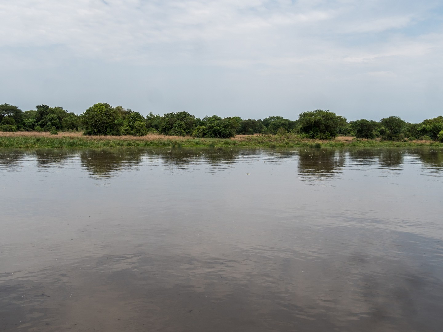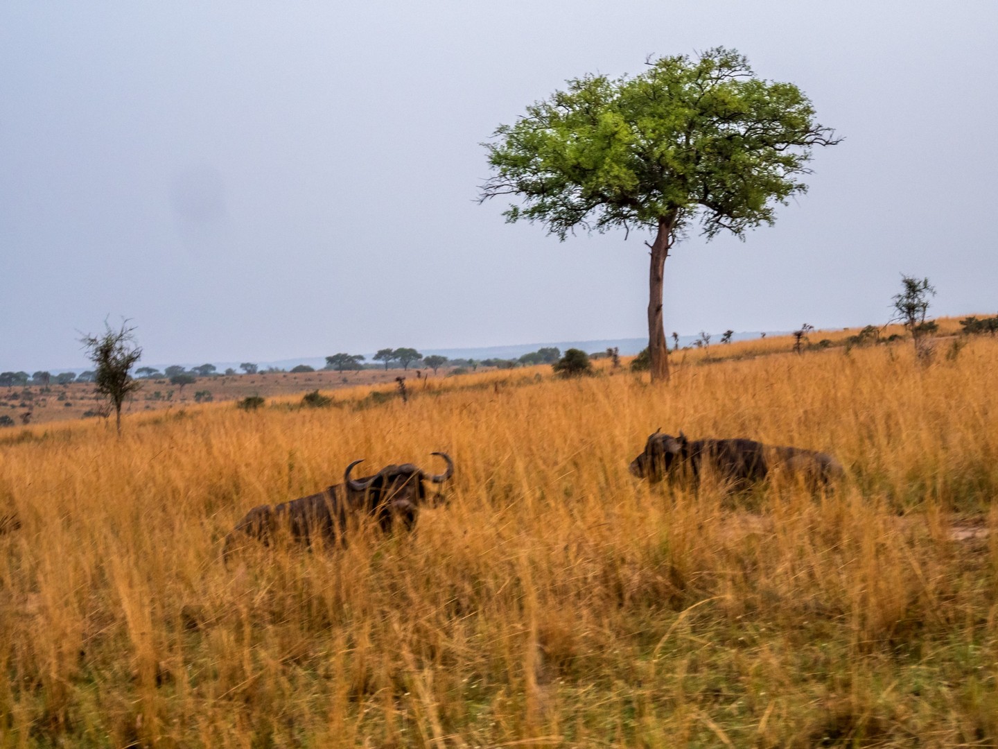 Le jour se lève enfin, colorant la savane de bleu puis de vert et jaune. Je ne m’attendais pas à çà : devant nous, c’est un immense paysage de plaine doucement vallonnée, couverte de buissons, d’herbes et plantée de ci de là de quelques acacias et même des palmiers, le tout sous un grand ciel et avec le fleuve en arrière plan, dépendant de la zone où nous sommes.
