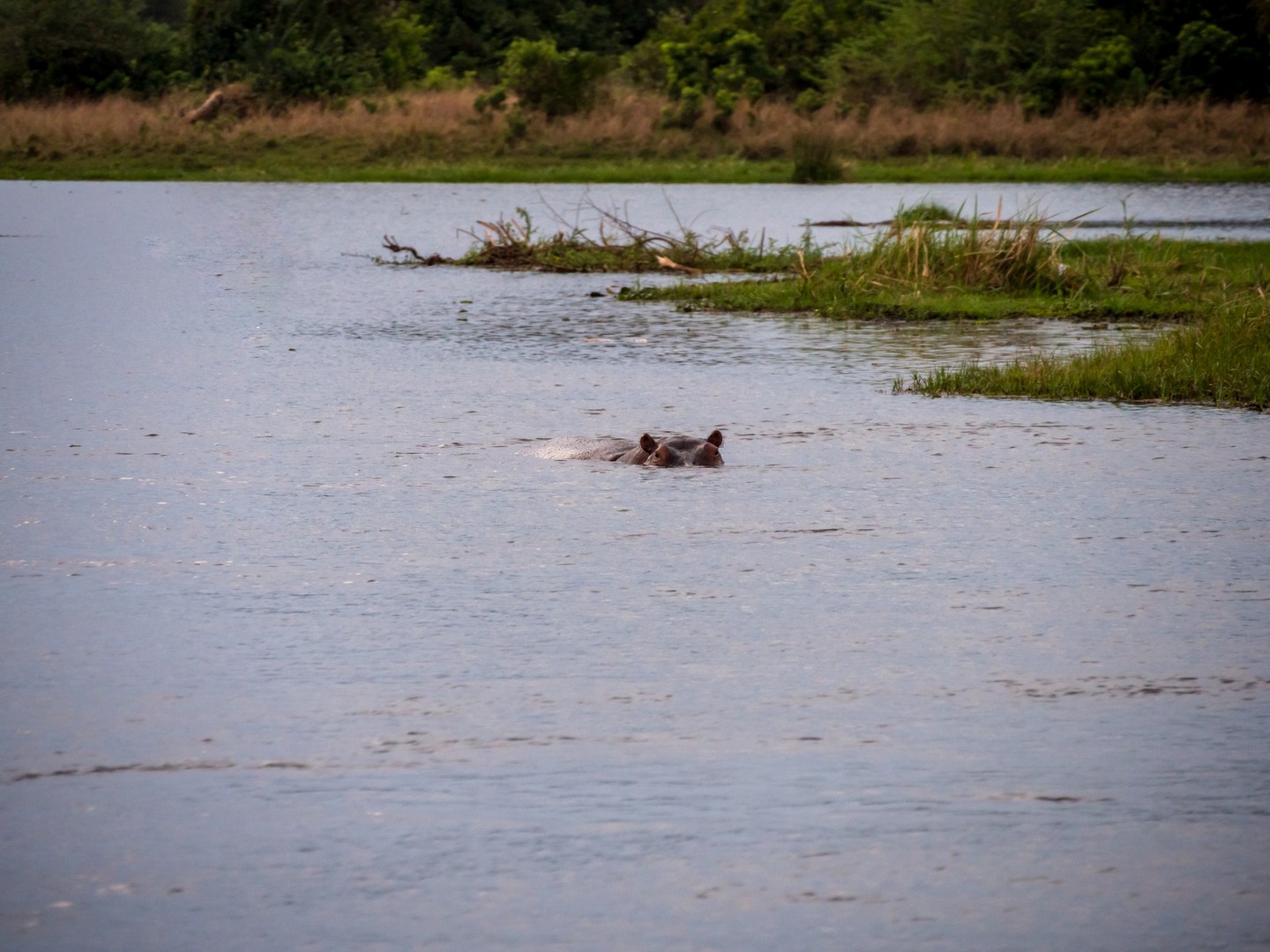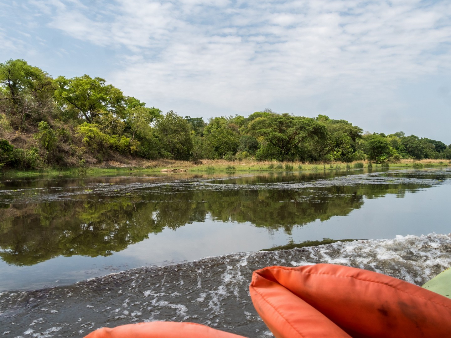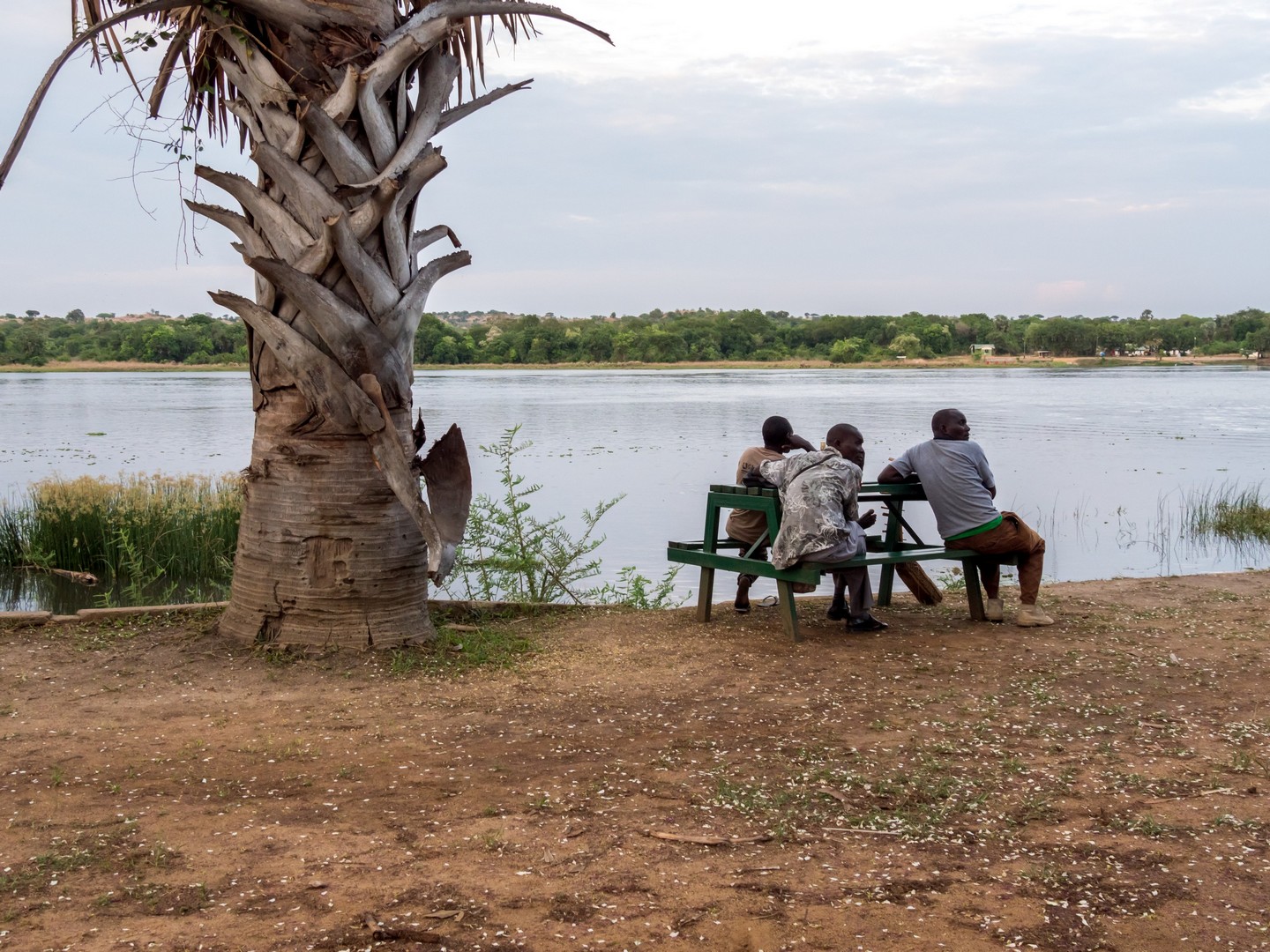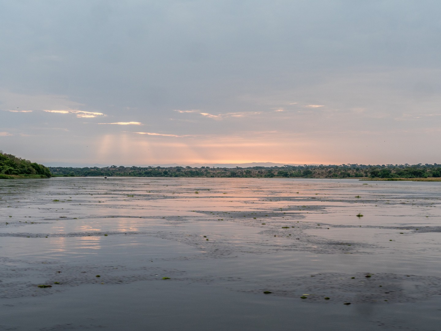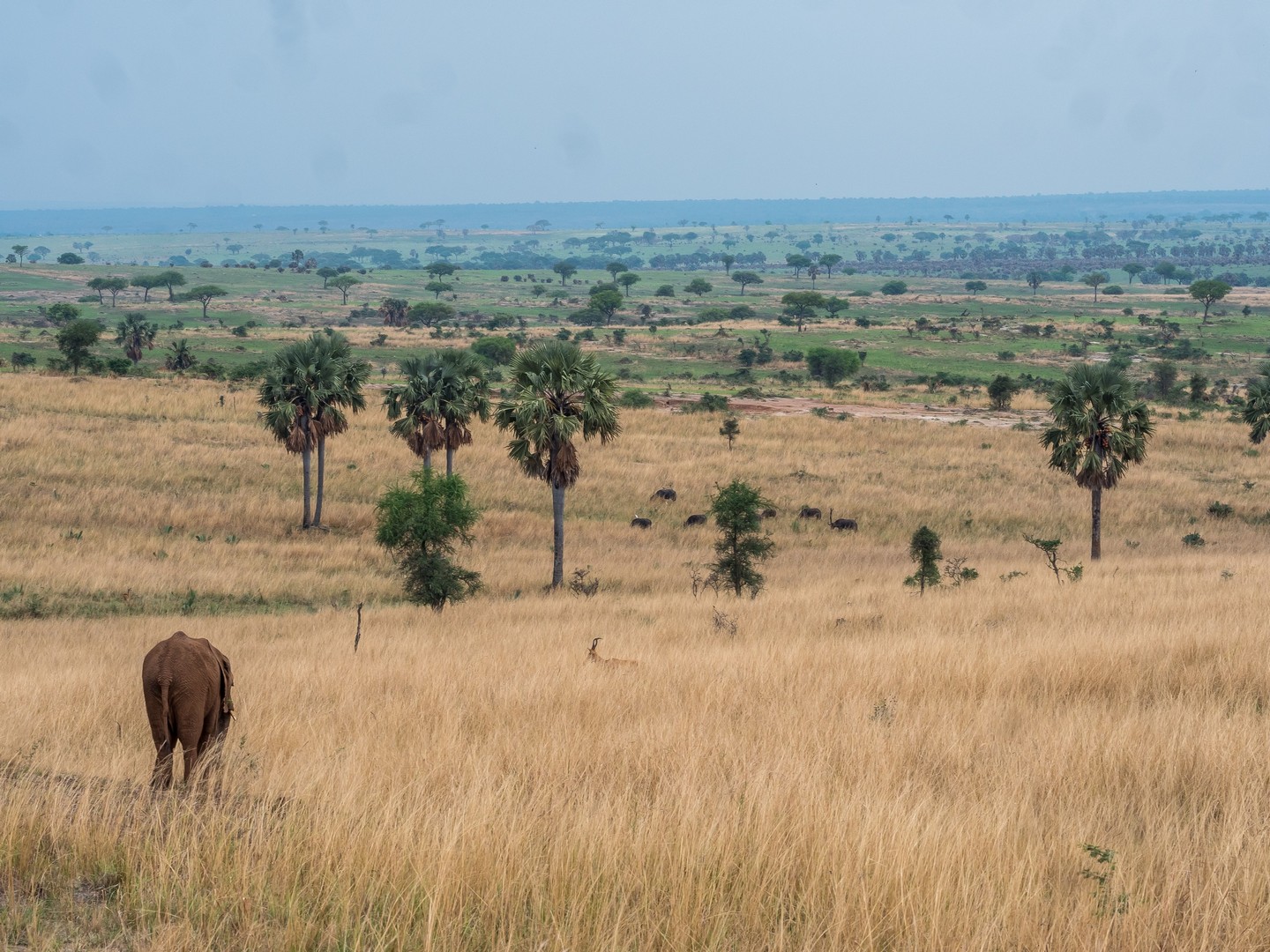 Le jour se lève enfin, colorant la savane de bleu puis de vert et jaune. Je ne m’attendais pas à çà : devant nous, c’est un immense paysage de plaine doucement vallonnée, couverte de buissons, d’herbes et plantée de ci de là de quelques acacias et même des palmiers, le tout sous un grand ciel et avec le fleuve en arrière plan, dépendant de la zone où nous sommes.