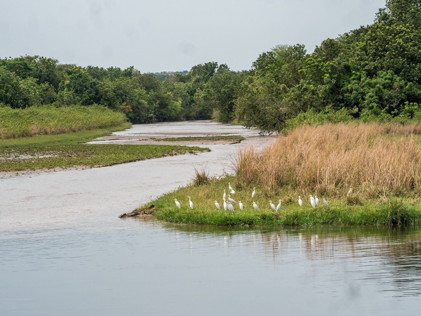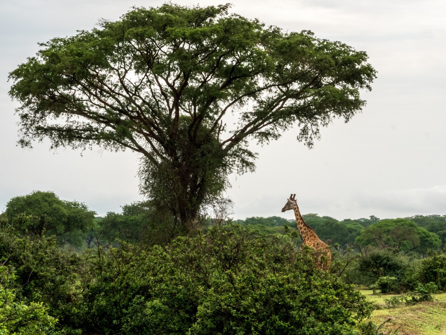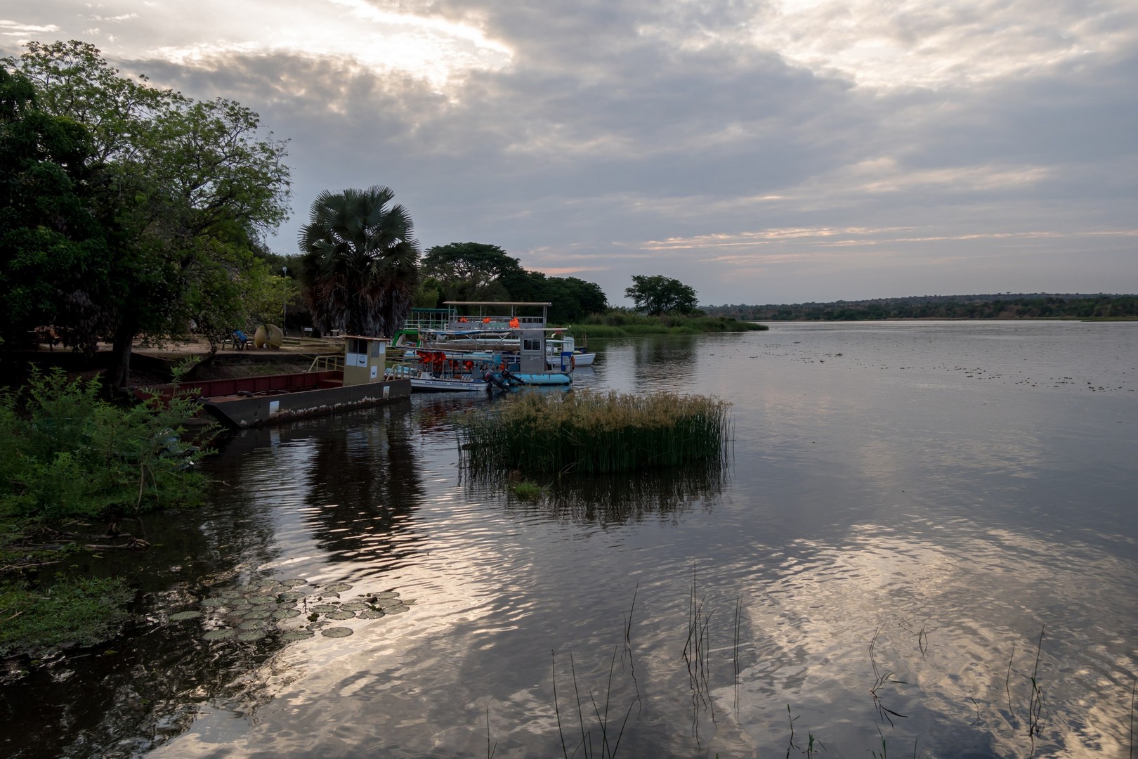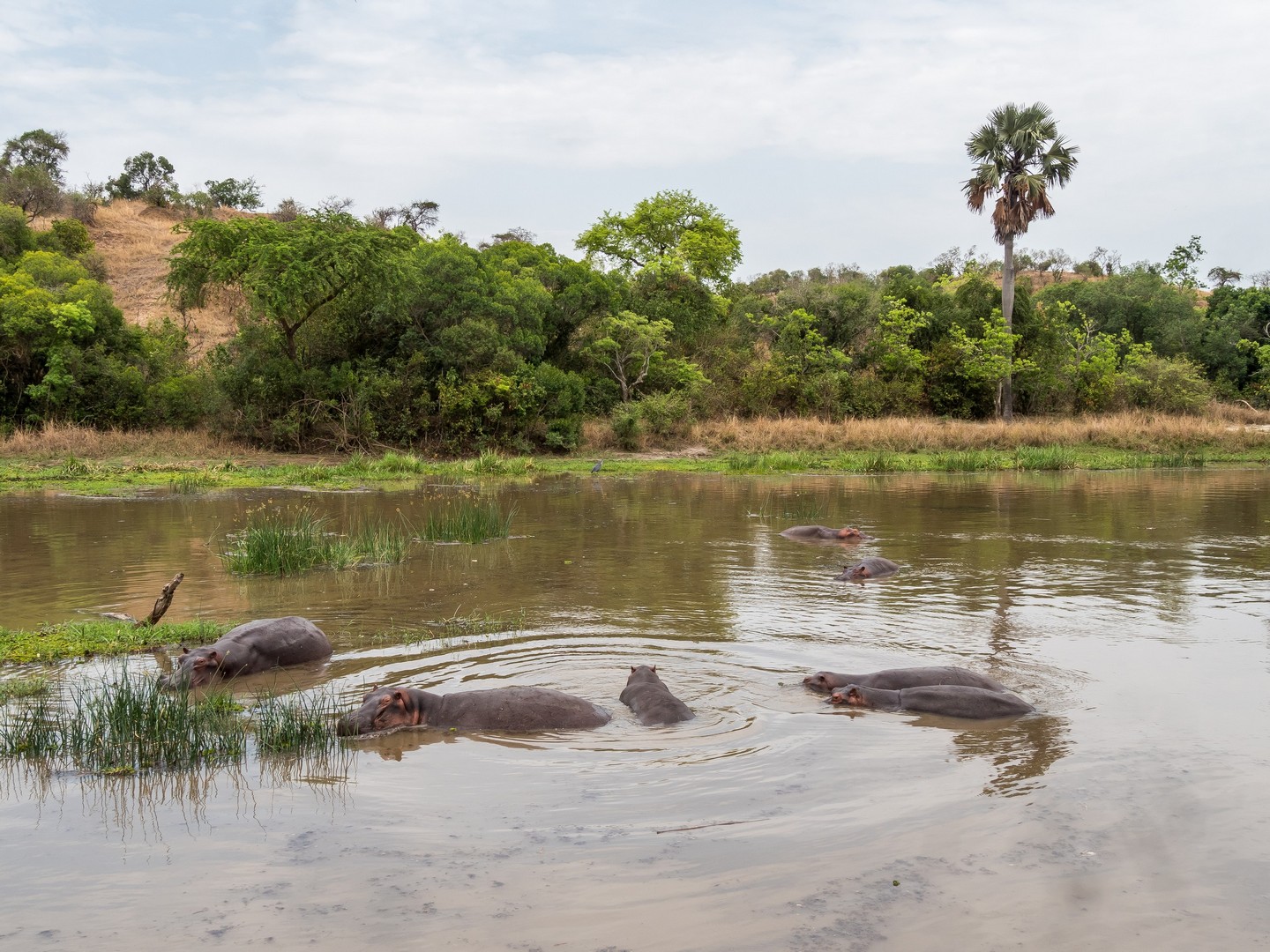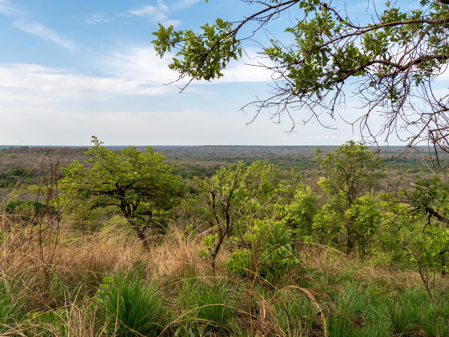 Le jour se lève enfin, colorant la savane de bleu puis de vert et jaune. Je ne m’attendais pas à çà : devant nous, c’est un immense paysage de plaine doucement vallonnée, couverte de buissons, d’herbes et plantée de ci de là de quelques acacias et même des palmiers, le tout sous un grand ciel et avec le fleuve en arrière plan, dépendant de la zone où nous sommes.