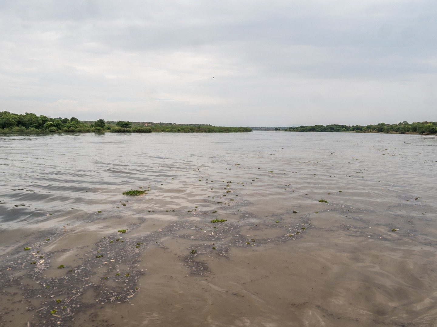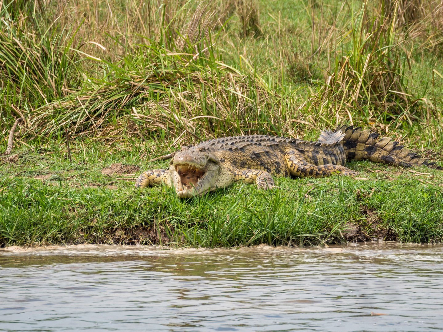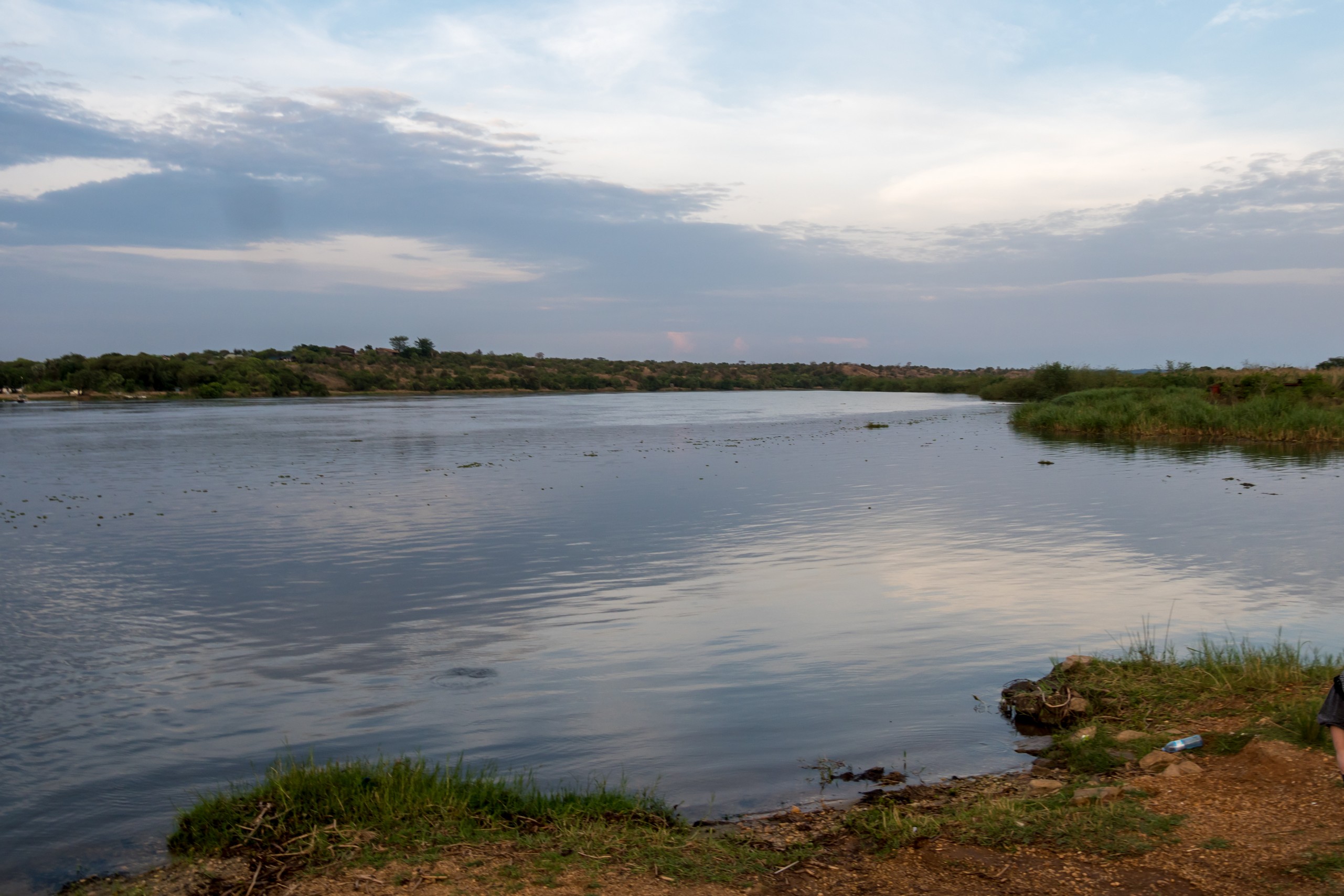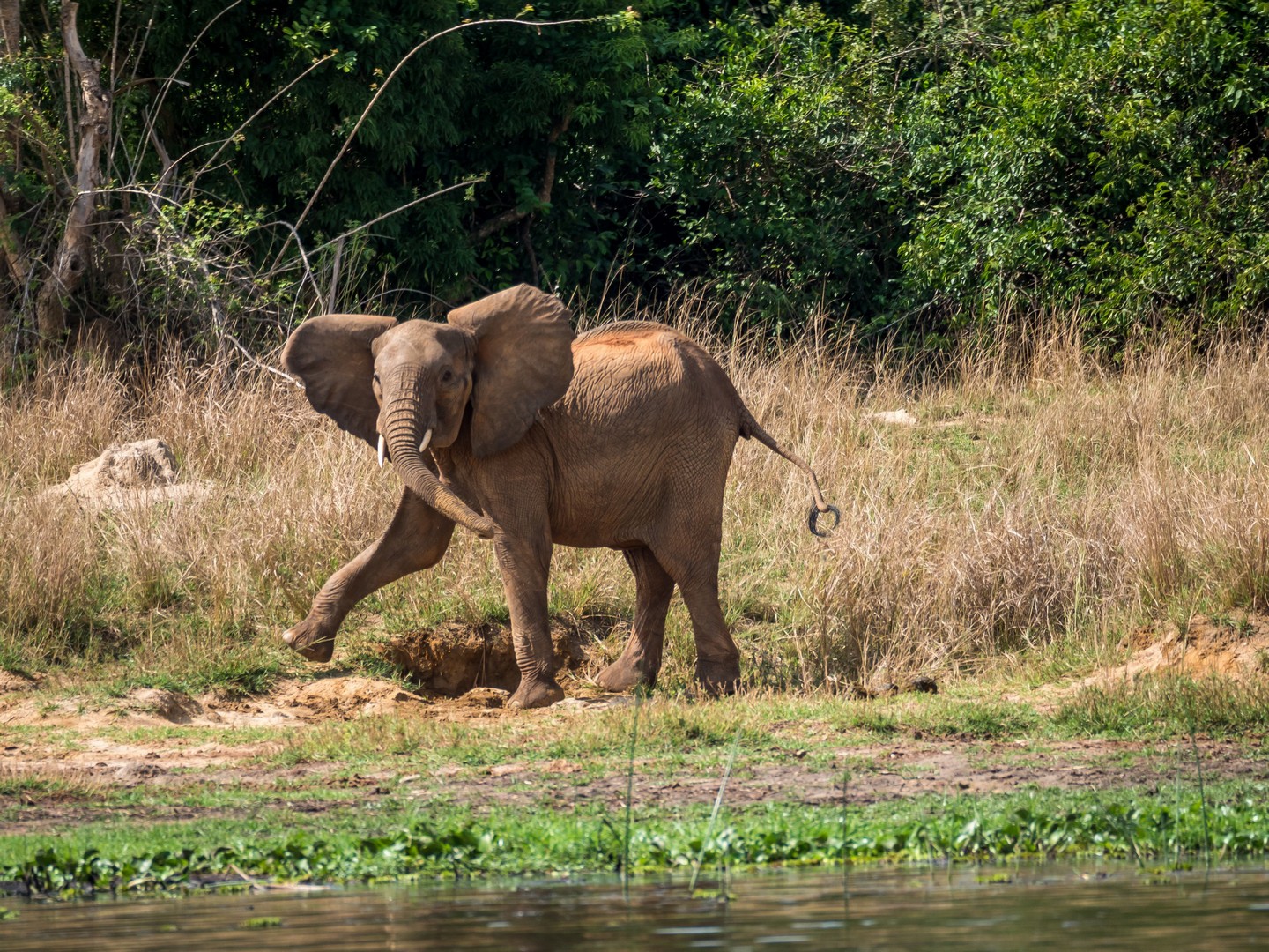 Le parc porte le nom de « Cascade de Murchinson » et c’est précisément elles que nous allons voir. Pour cela, il faut d’abords embarquer sur un bateau pour rejoindre un sentier de randonnée qui vous emmènera sur le sommet de la cascade. Ça fait partie de la beauté du lieu. Au début, le Nil semble tranquille. Les fleuves, chenaux et lacs sont les lieux idéaux pour observer la faune, notamment les oiseaux, qui sont très, très nombreux : hérons, martin-pêcheurs de toute sortes… Tous très difficile à capturer en photo, je dois dire ! Evidemment, il y a une foule d’hippopotames dans l’eau. Nous sommes en plein après-midi et aux heures chaudes, ils préfèrent être au frais. Quelques antilopes se promènent également, des éléphants, dont un (ou une, les femelles d’éléphants d’Afrique portent également des défenses) qui n’a pas l’air très content de nous voir et semble s’agiter un peu mais l’animal emblématique du bords du Nil, c’est le crocodile. Et on en croisera quelques uns ! Murchinson a la plus grosse concentration de crocos d’Ouganda et pour les voir, il faut quand même être observateur/trice puisque la couleur de leur peau brun-jeune-vert se confond avec celles de la rive ! Je comprends mieux les conseils de Michael, notre guide, de ne pas nous approcher des bords de l’eau (sans compter que les hippopotames sont également très dangereux). Lorsque nous croisons un grand reptile la gueule ouverte, on se dit qu’on est bien peu de choses et qu’en fait, à l’état de nature, l’homme vit entouré de danger !
