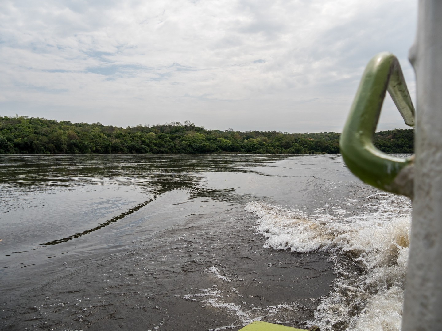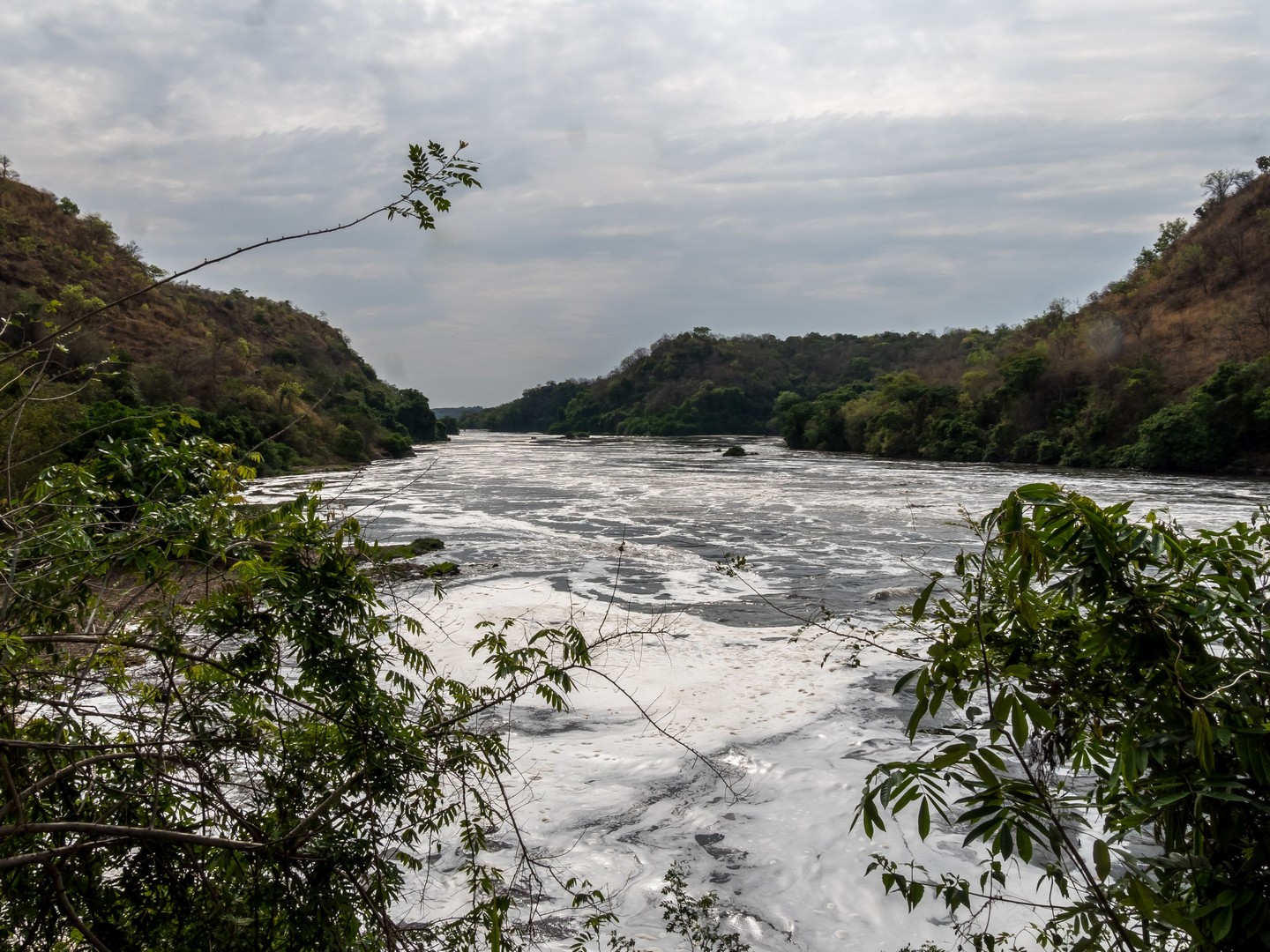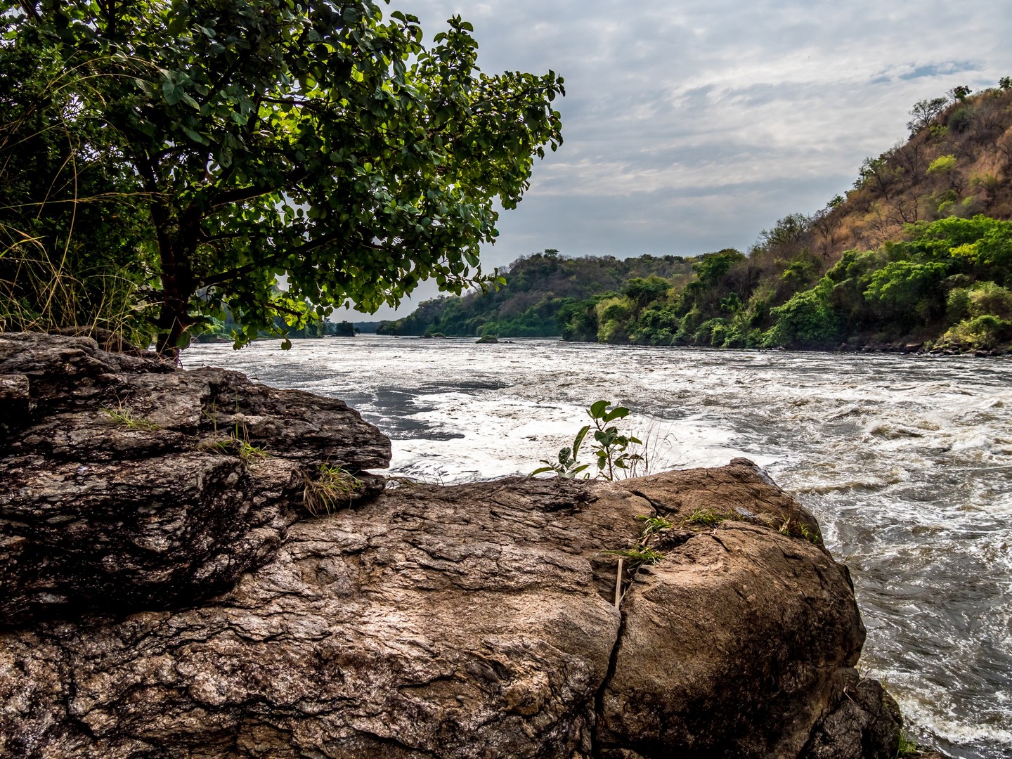 Le parc porte le nom de « Cascade de Murchinson » et c’est précisément elles que nous allons voir. Pour cela, il faut d’abords embarquer sur un bateau pour rejoindre un sentier de randonnée qui vous emmènera sur le sommet de la cascade. Ça fait partie de la beauté du lieu. Au début, le Nil semble tranquille. Les fleuves, chenaux et lacs sont les lieux idéaux pour observer la faune, notamment les oiseaux, qui sont très, très nombreux : hérons, martin-pêcheurs de toute sortes… Tous très difficile à capturer en photo, je dois dire ! Evidemment, il y a une foule d’hippopotames dans l’eau. Nous sommes en plein après-midi et aux heures chaudes, ils préfèrent être au frais. Quelques antilopes se promènent également, des éléphants, dont un (ou une, les femelles d’éléphants d’Afrique portent également des défenses) qui n’a pas l’air très content de nous voir et semble s’agiter un peu mais l’animal emblématique du bords du Nil, c’est le crocodile. Et on en croisera quelques uns ! Murchinson a la plus grosse concentration de crocos d’Ouganda et pour les voir, il faut quand même être observateur/trice puisque la couleur de leur peau brun-jeune-vert se confond avec celles de la rive ! Je comprends mieux les conseils de Michael, notre guide, de ne pas nous approcher des bords de l’eau (sans compter que les hippopotames sont également très dangereux). Lorsque nous croisons un grand reptile la gueule ouverte, on se dit qu’on est bien peu de choses et qu’en fait, à l’état de nature, l’homme vit entouré de danger !