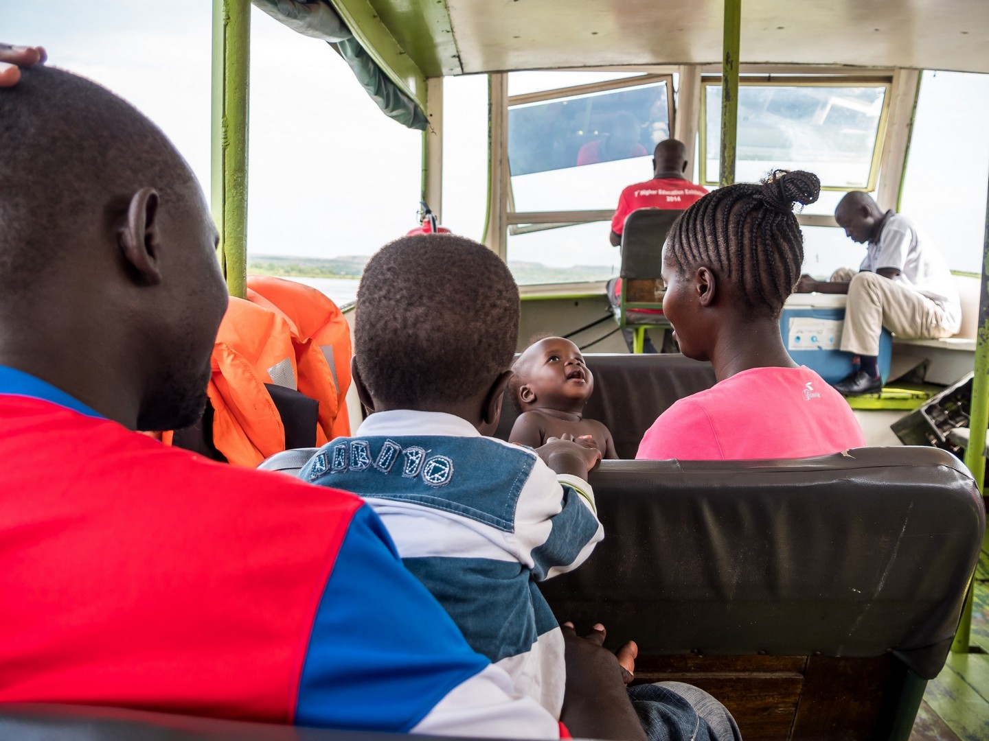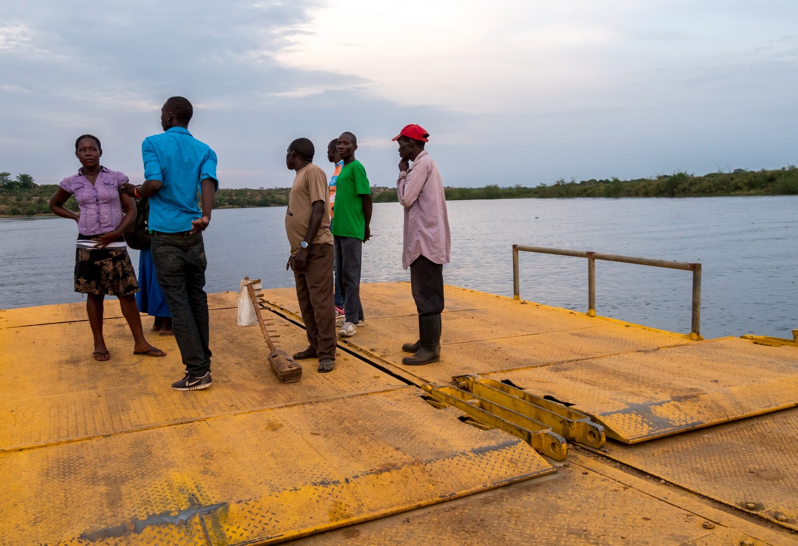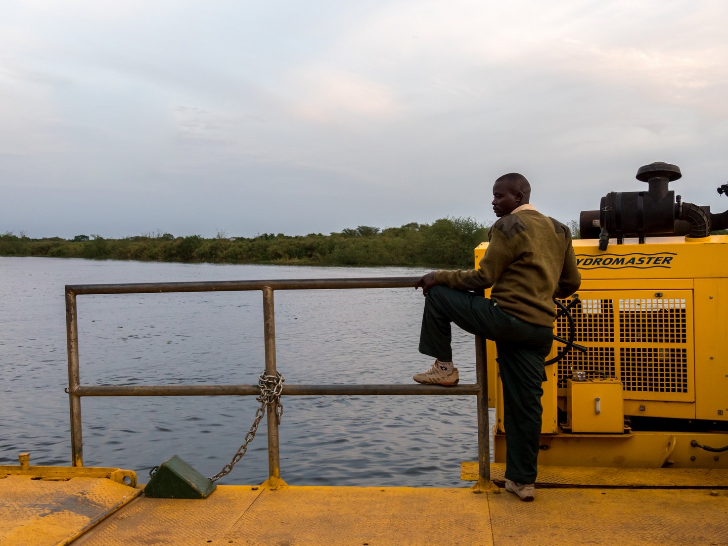 Après de longues heures de route, nous voilà à l’entrée du Parc National de Murchison Falls, un des joyaux de l’Ouganda. Gardé par des rangers armés, une ancienne haie de défenses d’éléphants (soigneusement emballées pour éviter d’être volées) et une famille de babouins, il faut encore conduire un petit moment sur une piste avant d’arriver à Paraa, le secteur où nous séjournerons et pour y arriver et surprise, il faudra traverser une rivière et pas n’importe laquelle : le Nil (à vrai dire, le Nil Victoria, l’un des noms que prend le Nil Blanc à ce niveau de son cours) ! Le soir tombe doucement et on attend le dernier bac pour embarquer avec les camions. Je n’arrive pas à y croire : le Nil… Un des fleuves les plus mythiques au monde. Et je suis en train de naviguer dessus à guetter les hippopotames qu’on peut reconnaître à leurs cris sourds ou aux petites bulles qu’on peut apercevoir à la surface quand ils sont immergés. Sur le bac, à part le bruit des moteurs, tout est calme, à peine entend-on vaguement le bruit des discussions. Je regarde Emma avec incrédulité : « On est sur un petit bac, en plein milieu du Nil, en Ouganda ! ». J’ai un peu l’impression de vivre Noël et Saint-Nicolas tous les jours ! Et encore, on ne sait pas encore ce qui nous attend le lendemain !