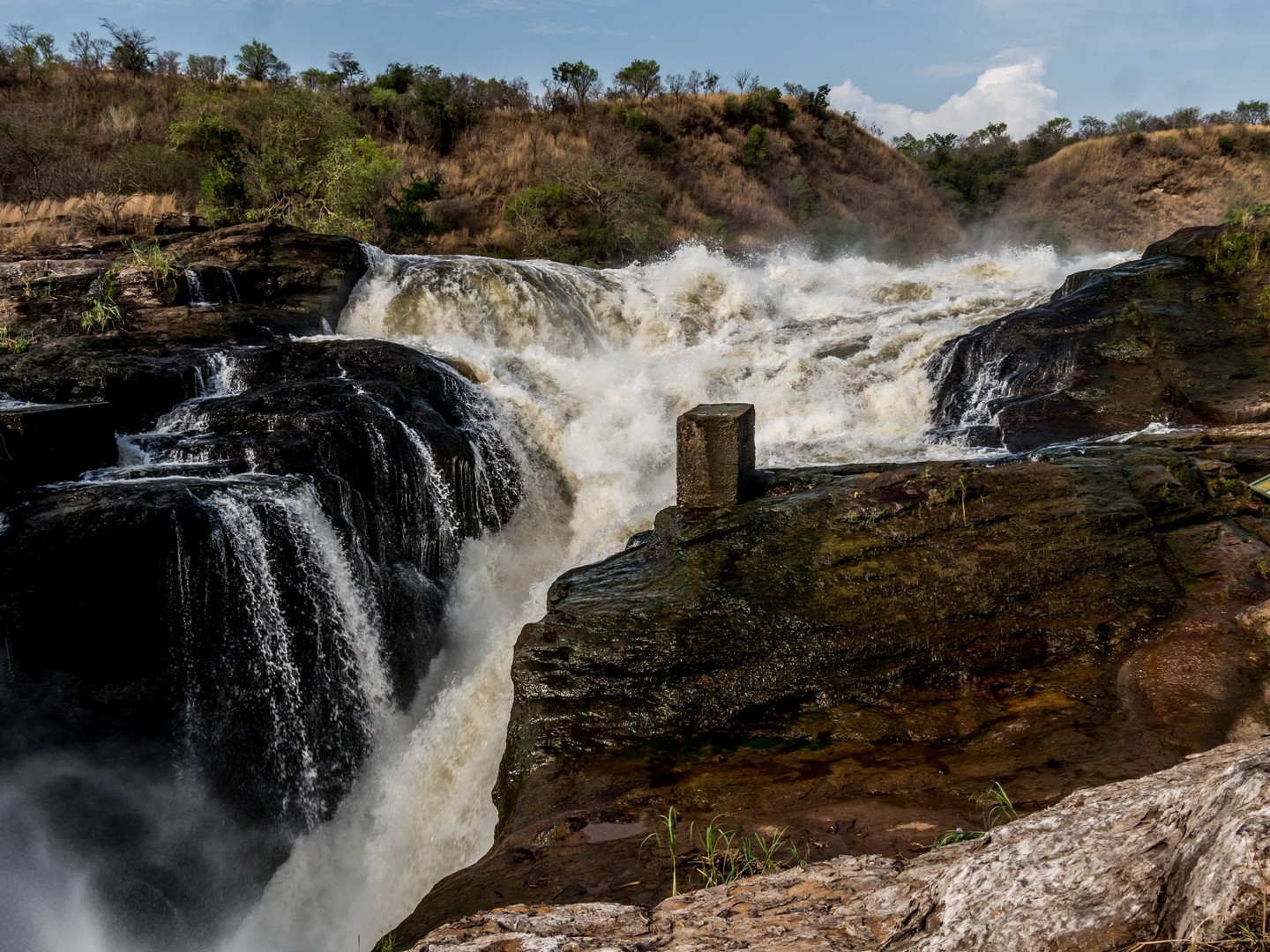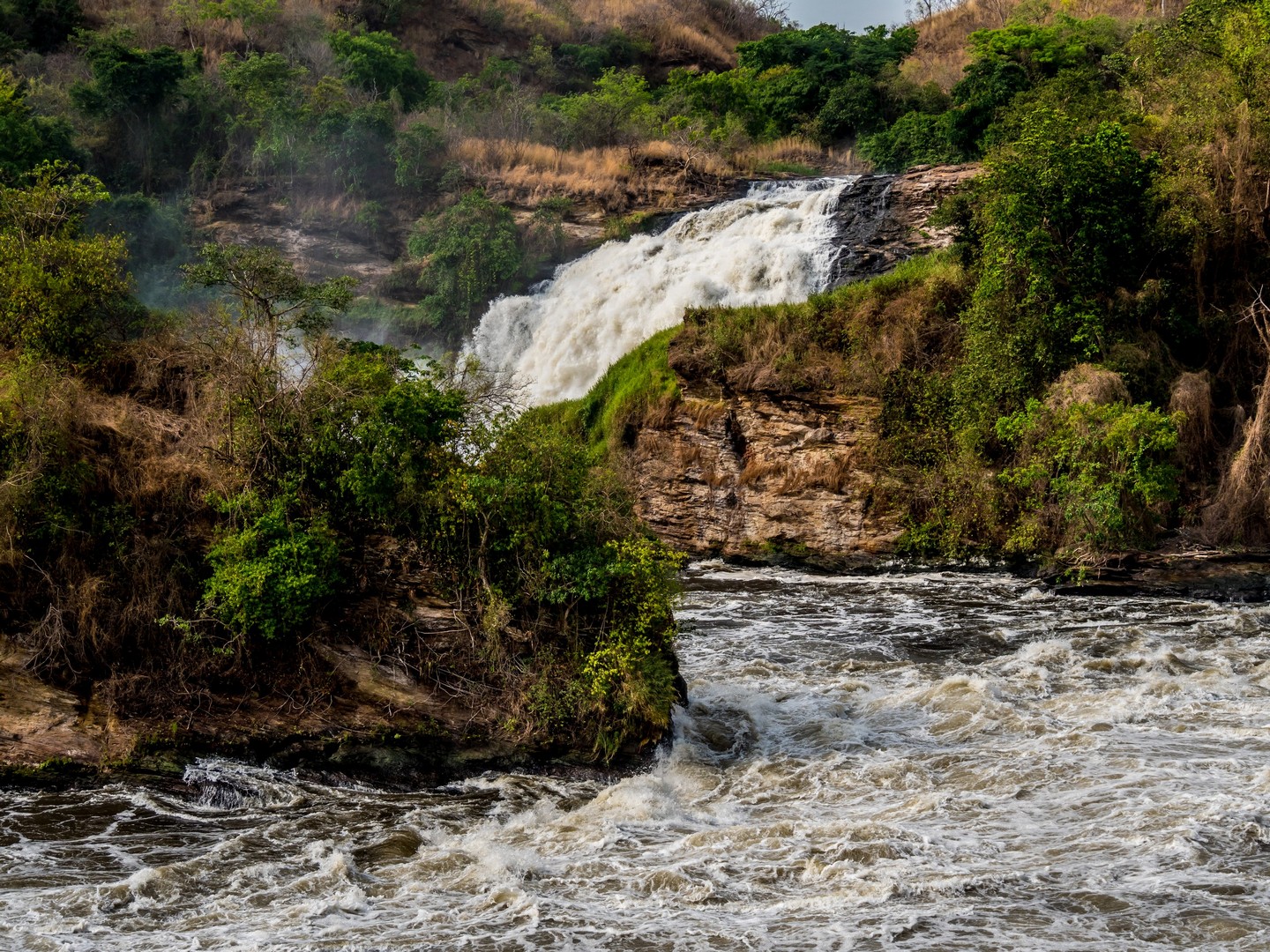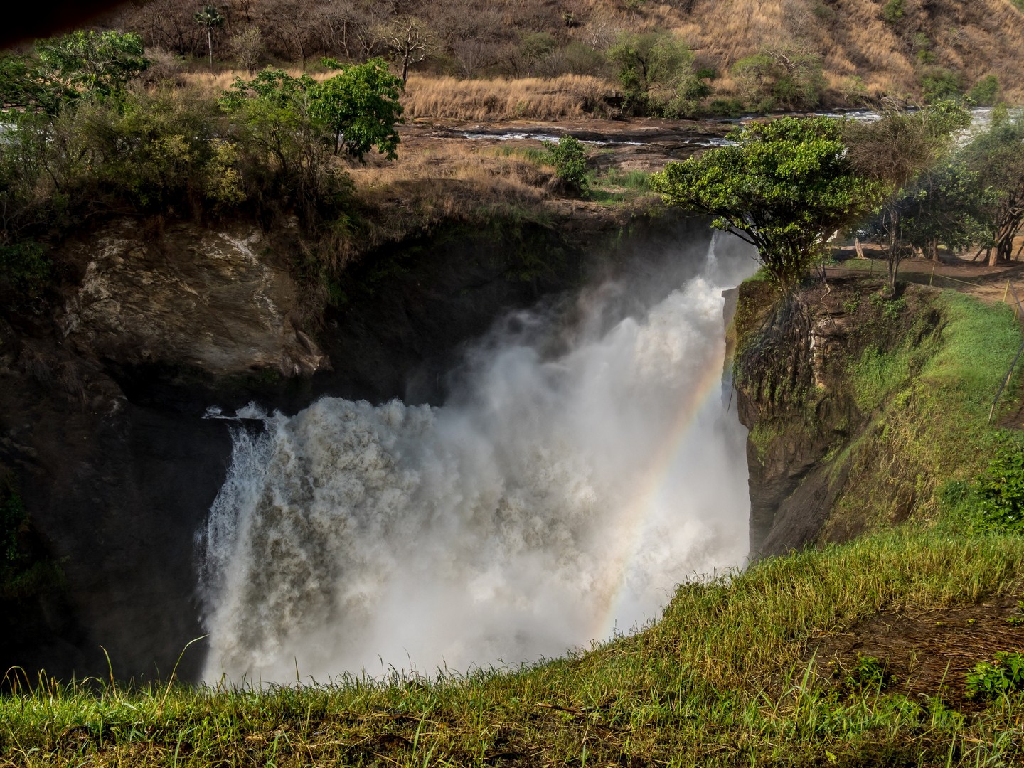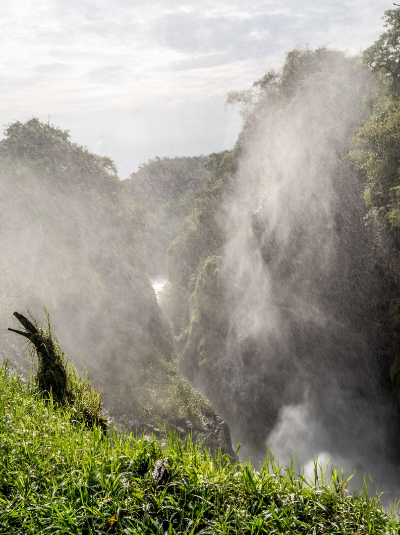 Parlant de danger, c’est plutôt aux serpents qu’il faut faire attention lors de la randonnée mais en faisant du bruit (les serpents sentent les vibrations du sol), cela suffit à les éloigner. La fin de la navigation nous a permis de voir enfin la cascade. C’est le Nil qui se jette dans une crevasse causée par un rift dans un tonnerre d’eau bouillonnante. Si la hauteur de la cascade n’est pas très importante, c’est le débit de l’eau qui coupe le souffle ! Et au fur et à mesure de l’ascension, nous allons découvrir qu’il y en a une cascade jumelle, qu’on ne peut voir qu’une fois que l’on surplombe la première. Une fois au bout de la randonnée, on peut s’approcher assez près de la cataractes et se rafraîchir un peu avec les gerbes d’eau. Un petit plaisir bienvenu après une bonne balade en partie sous le soleil !