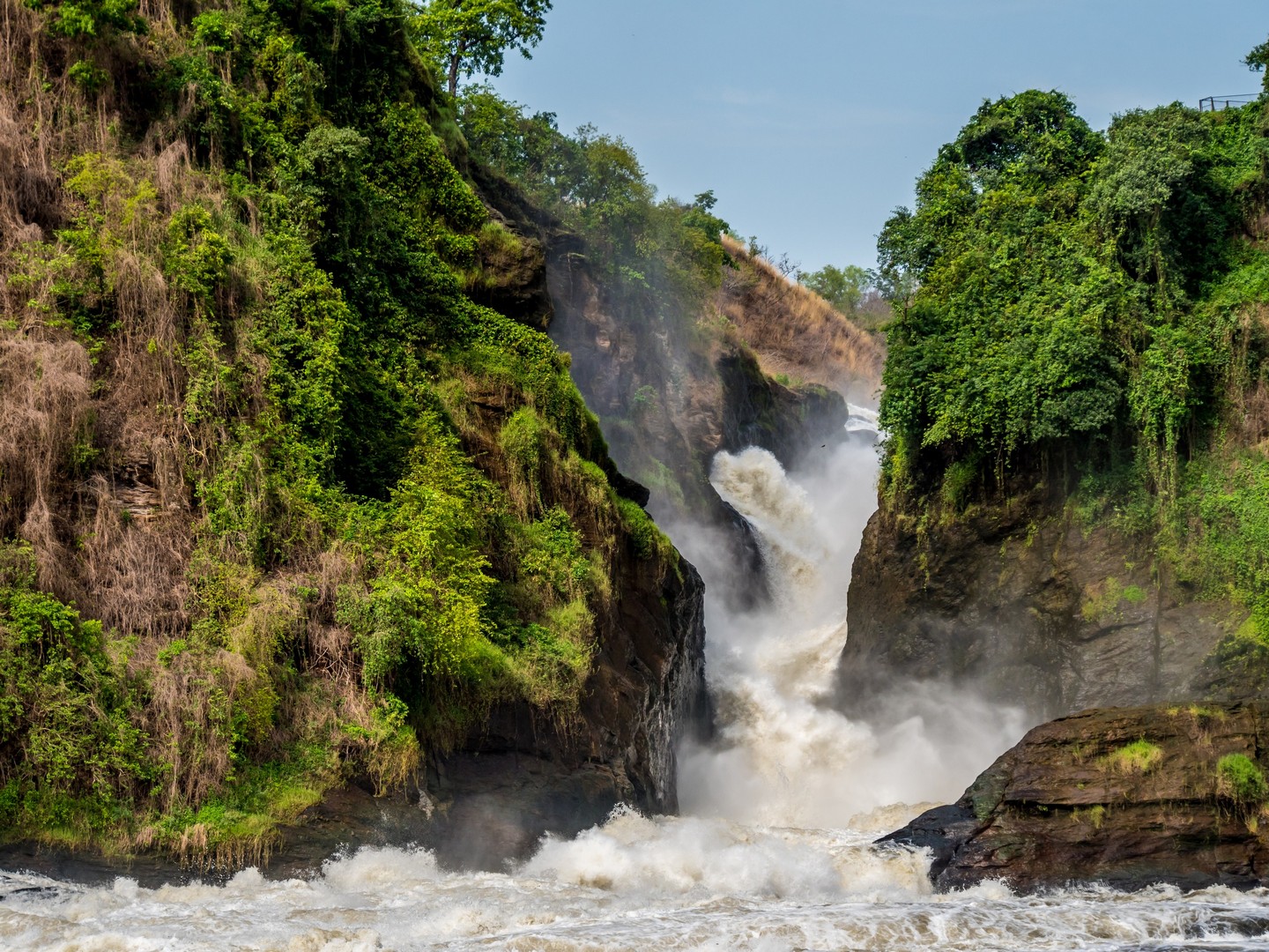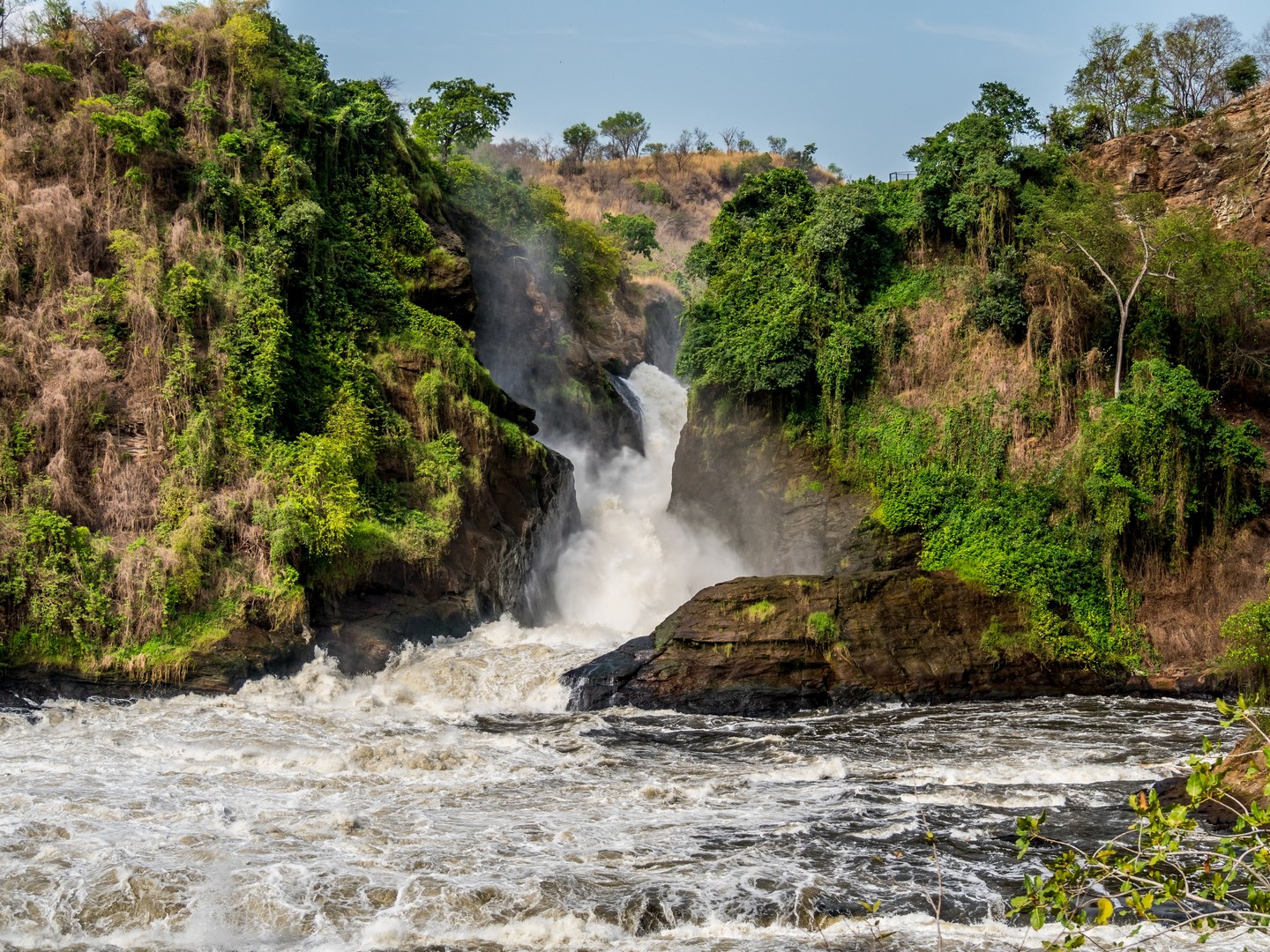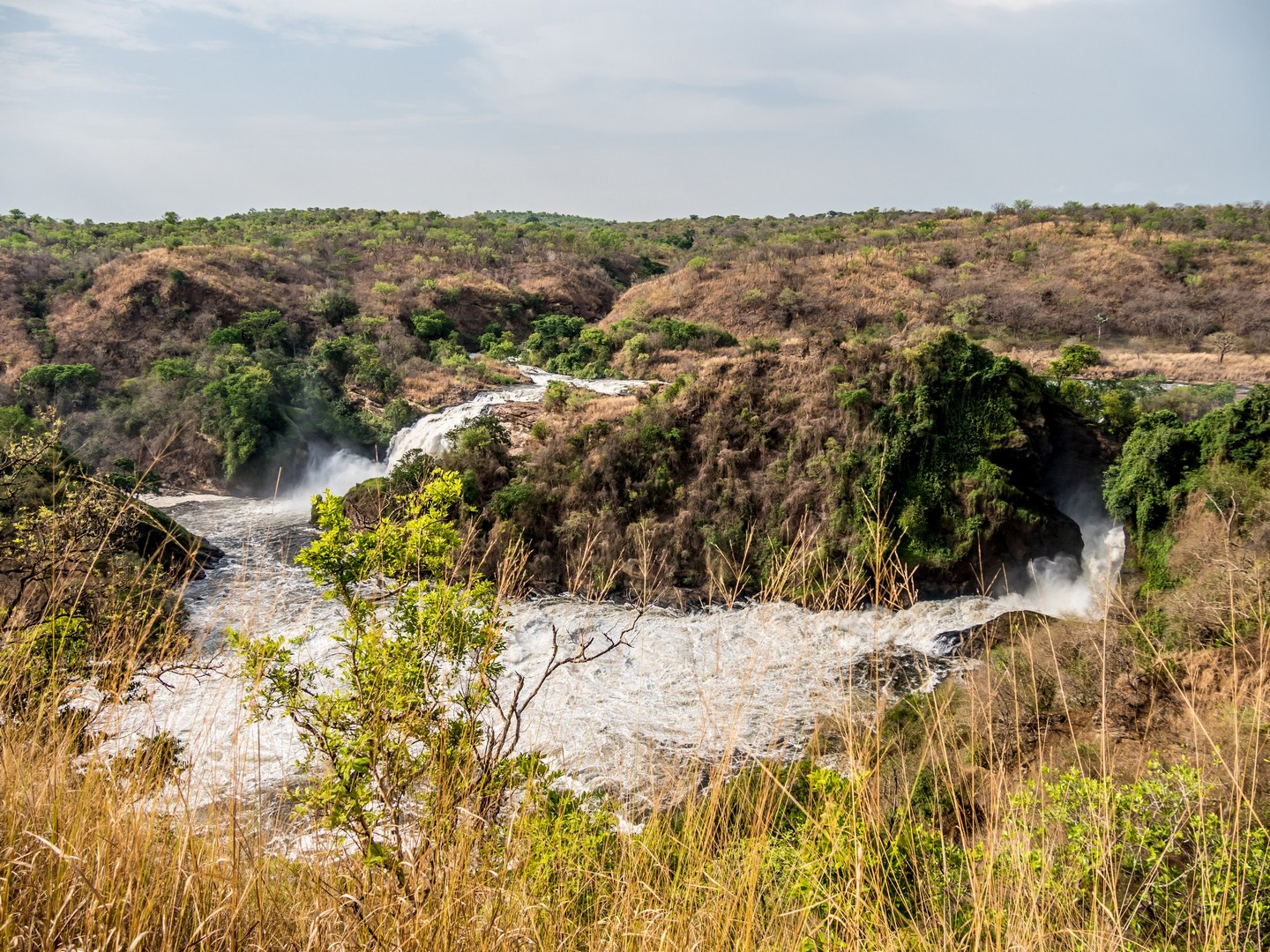 Parlant de danger, c’est plutôt aux serpents qu’il faut faire attention lors de la randonnée mais en faisant du bruit (les serpents sentent les vibrations du sol), cela suffit à les éloigner. La fin de la navigation nous a permis de voir enfin la cascade. C’est le Nil qui se jette dans une crevasse causée par un rift dans un tonnerre d’eau bouillonnante. Si la hauteur de la cascade n’est pas très importante, c’est le débit de l’eau qui coupe le souffle ! Et au fur et à mesure de l’ascension, nous allons découvrir qu’il y en a une cascade jumelle, qu’on ne peut voir qu’une fois que l’on surplombe la première. Une fois au bout de la randonnée, on peut s’approcher assez près de la cataractes et se rafraîchir un peu avec les gerbes d’eau. Un petit plaisir bienvenu après une bonne balade en partie sous le soleil !