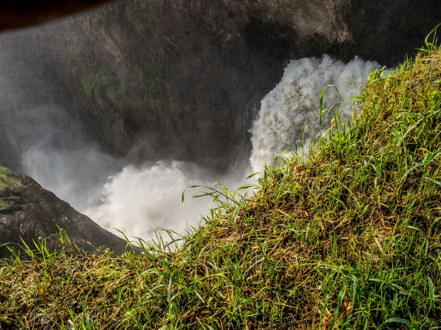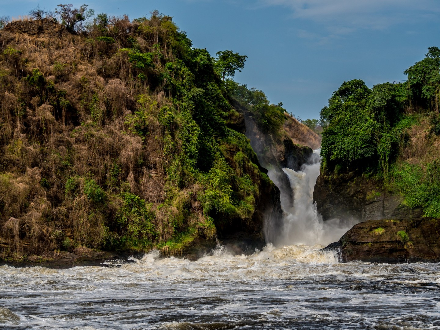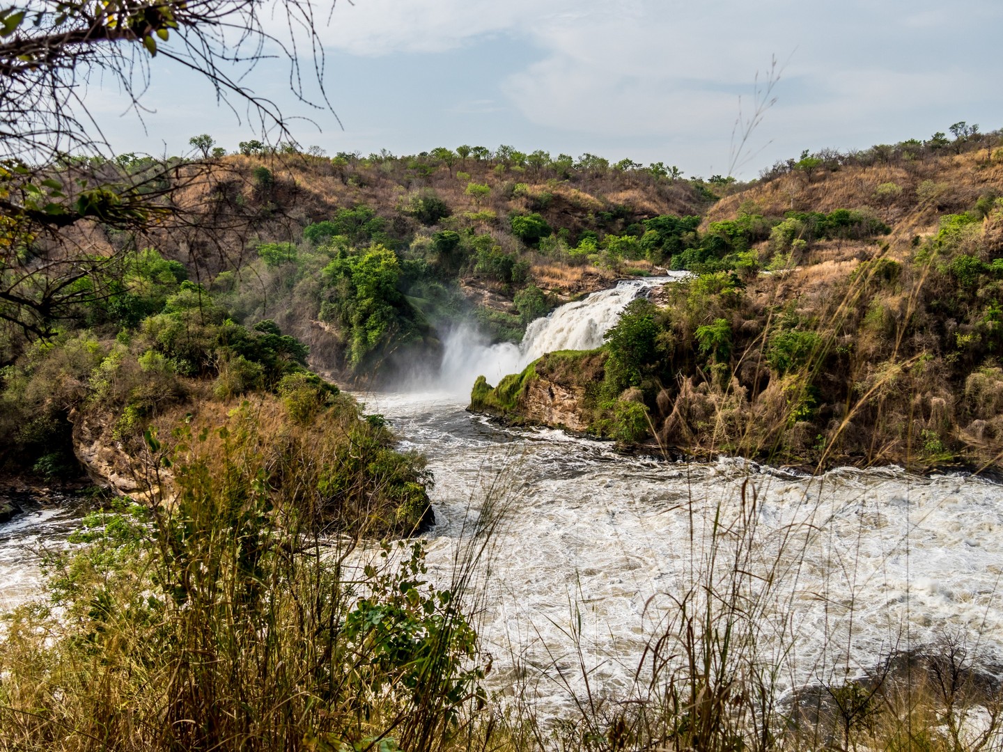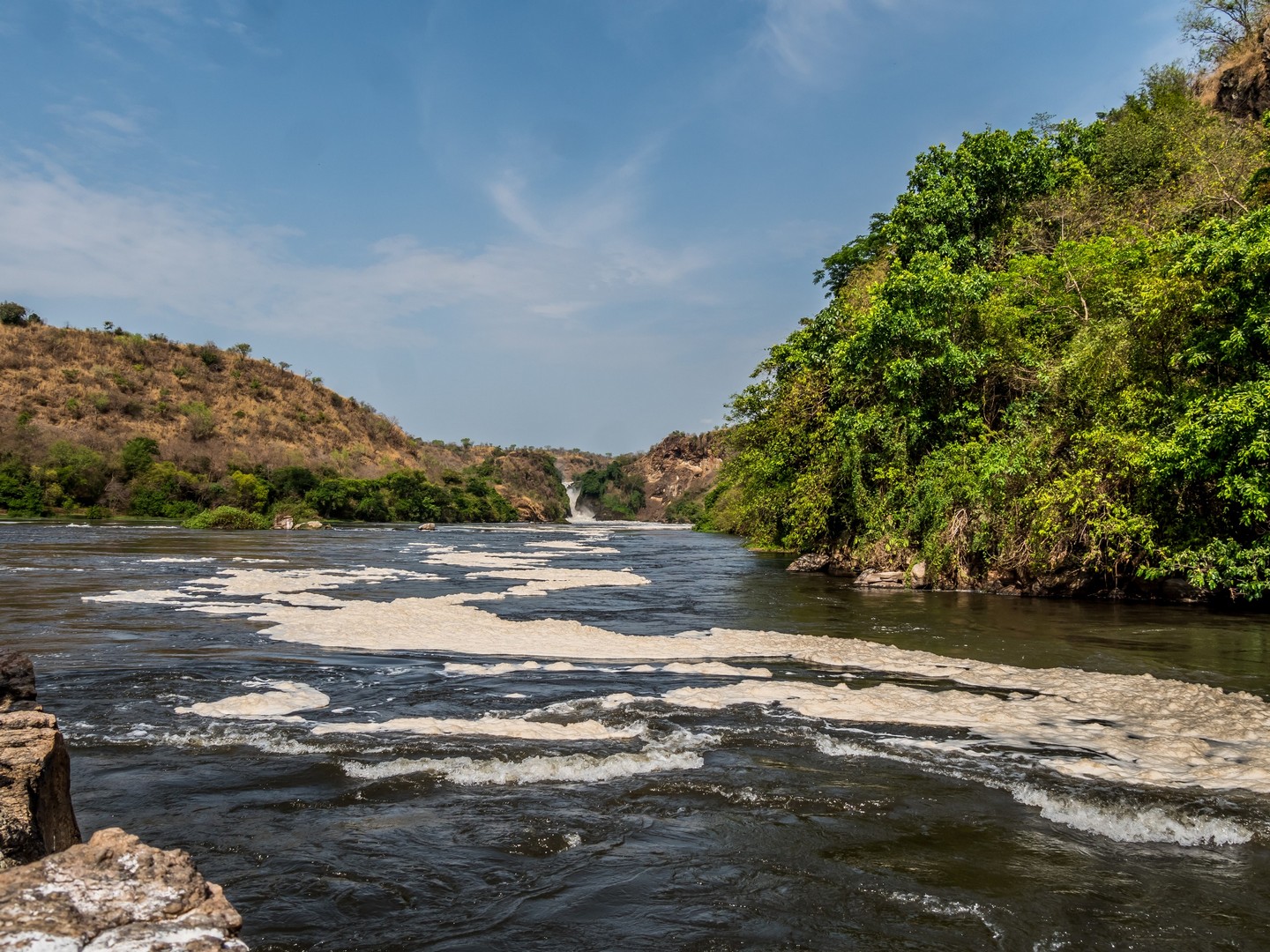 Parlant de danger, c’est plutôt aux serpents qu’il faut faire attention lors de la randonnée mais en faisant du bruit (les serpents sentent les vibrations du sol), cela suffit à les éloigner. La fin de la navigation nous a permis de voir enfin la cascade. C’est le Nil qui se jette dans une crevasse causée par un rift dans un tonnerre d’eau bouillonnante. Si la hauteur de la cascade n’est pas très importante, c’est le débit de l’eau qui coupe le souffle ! Et au fur et à mesure de l’ascension, nous allons découvrir qu’il y en a une cascade jumelle, qu’on ne peut voir qu’une fois que l’on surplombe la première. Une fois au bout de la randonnée, on peut s’approcher assez près de la cataractes et se rafraîchir un peu avec les gerbes d’eau. Un petit plaisir bienvenu après une bonne balade en partie sous le soleil !