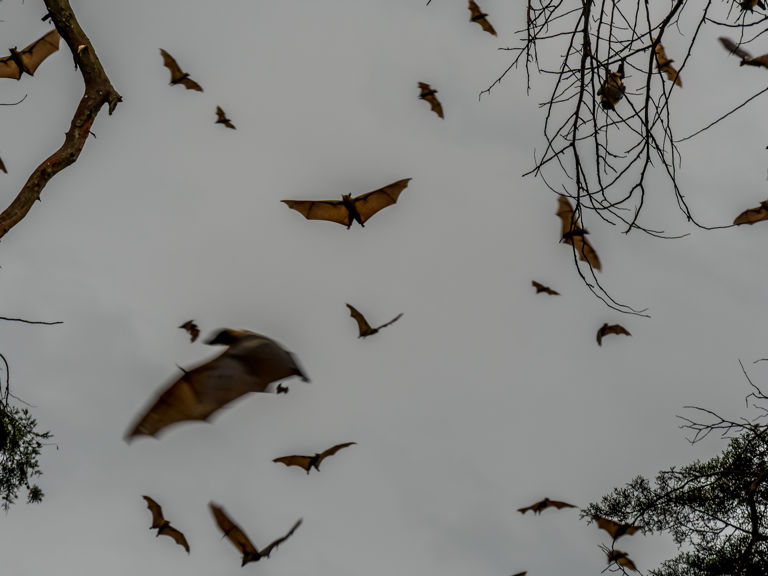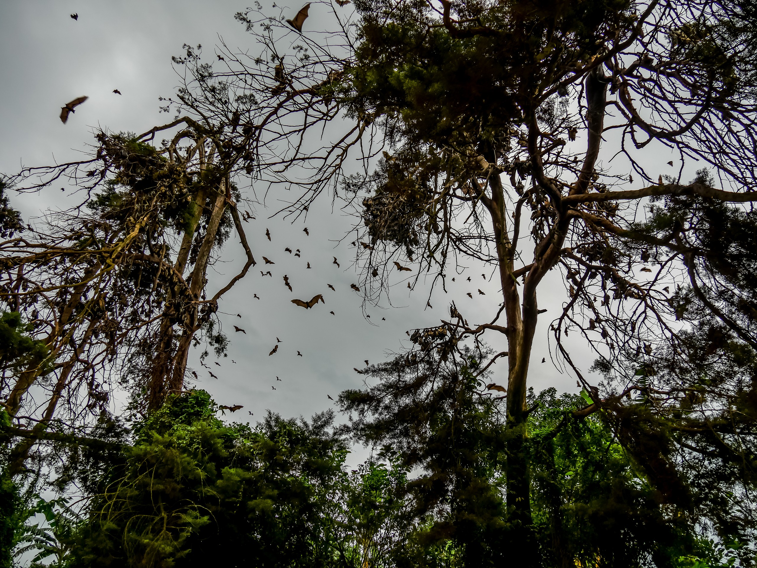 Mais avant de partir, nous aurons la vision la plus insolite qu’il nous aura été donné de voir en Ouganda. Plus effrayante qu’un lion qui vous chargerait, plus impressionnante qu’une troupe d’éléphants qui passerait devant votre jeep : ces centaines de grosses chauves-souris qui volent en plein jour ! Il y en a tellement que le ciel en est obscurci ! C’est vraiment très, très étrange. Et franchement flippant.
