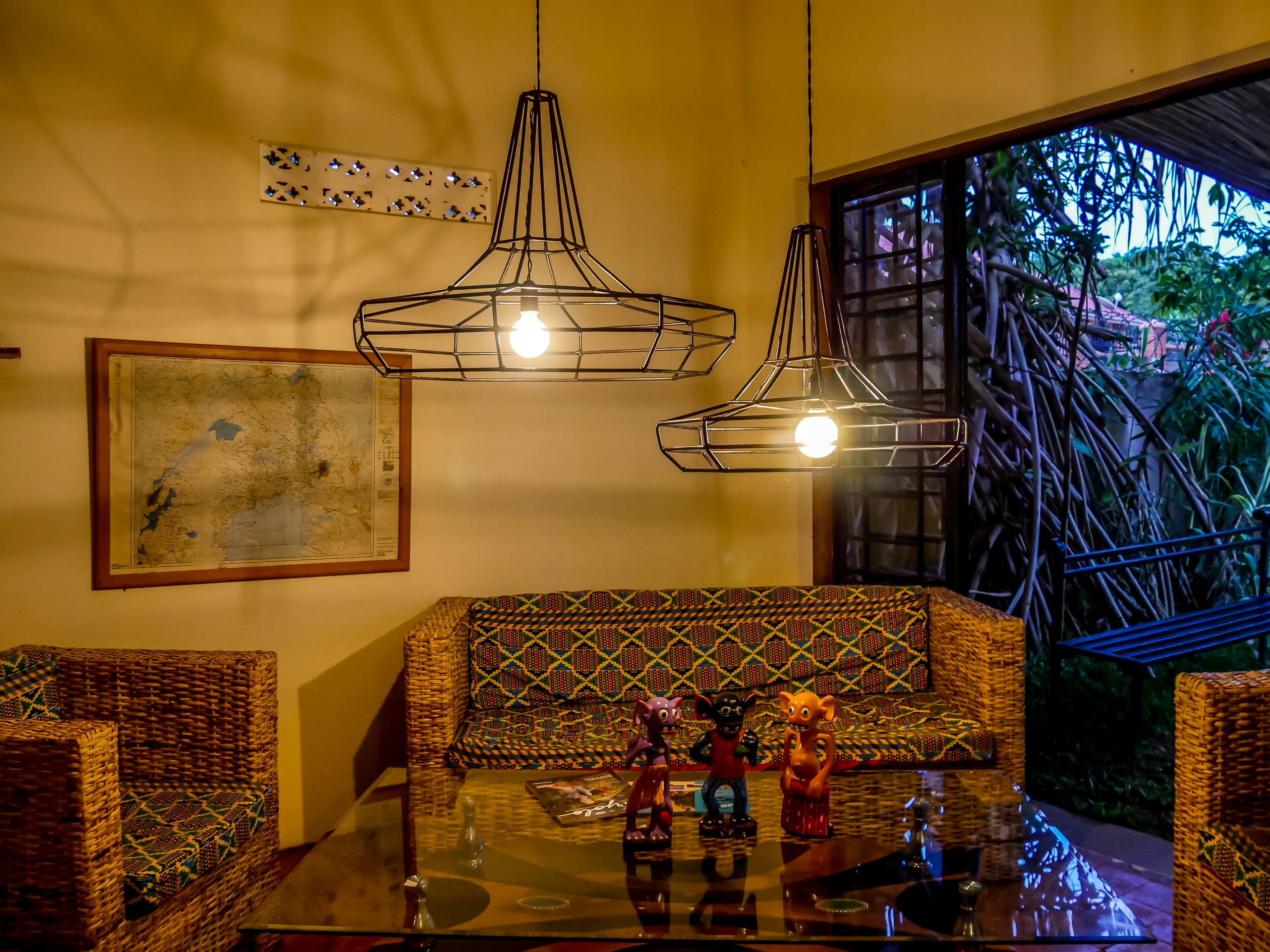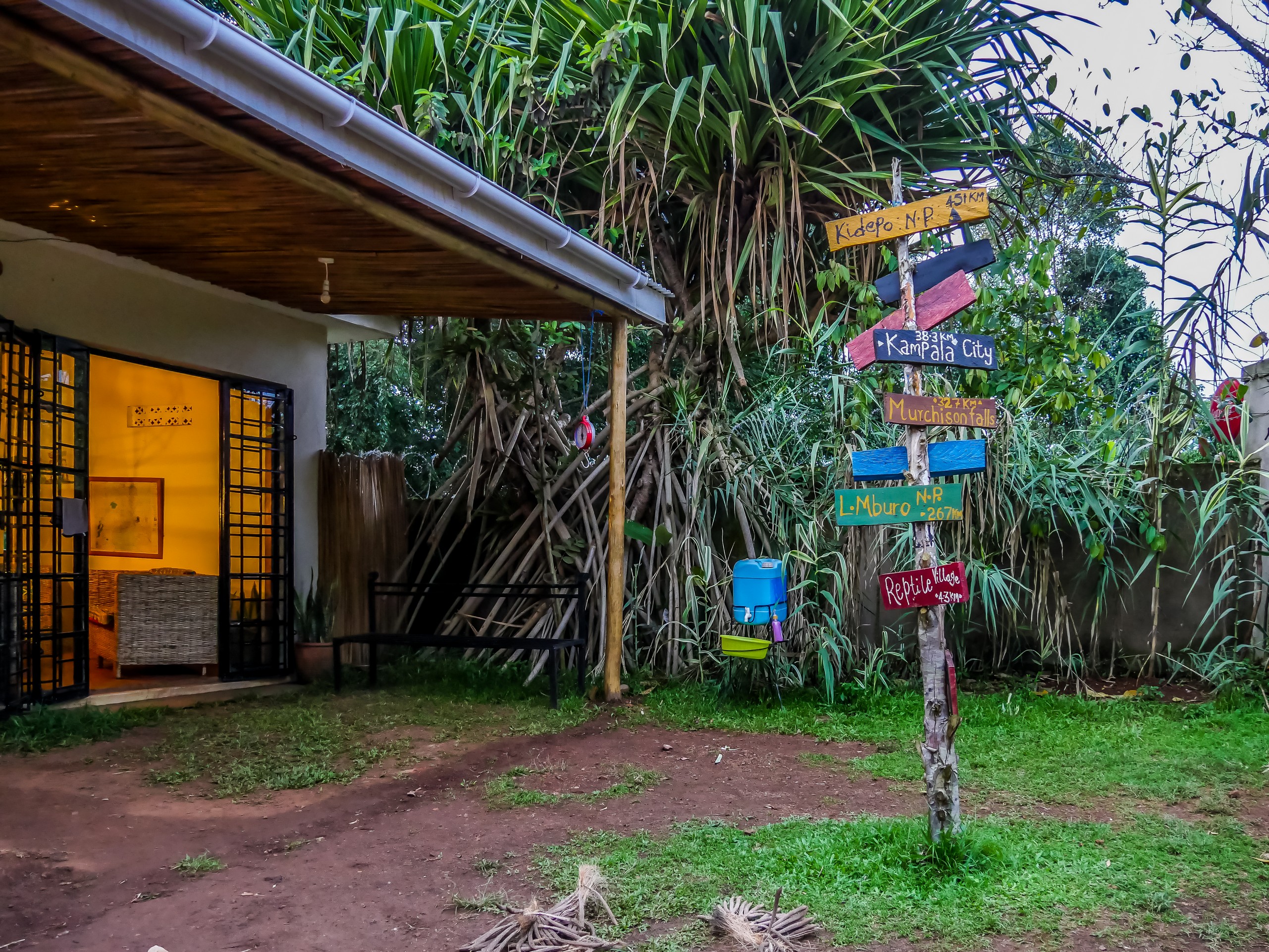 Avant d’aller à l’aéroport, nous allons visiter un dernier lieu… et pas des moindres. Dans la ville d’Entebbe, où se situe l’aéroport, trois Belges, Pieter, Lobke et Steven ont ouvert une auberge/bar/resto sous la marque ViaVia. ViaVia, je le connais bien puisque j’ai assidûment fréquenté leur café à Bruxelles et que j’ai croisé leurs auberges à Valparaiso et à Yogyakarta. Je ne savais absolument pas qu’il y en avait une ici, jusqu’à ce que l’attaché de l’ambassade belge ne nous fasse rencontrer Pieter à la soirée de la veille. Il tenait à nous inviter pour nous faire passer le temps agréablement avant de partir. Nous arrivons donc à l’établissement au moment du coucher du soleil et même nos agents de voyage sont bluffés ! L’auberge est installée dans un petit parc arboré. Situé sur petit promontoire, le bar-resto domine un petit étang. Comme la soirée est déjà avancée, on a déjà allumé les loupiotes. C’est joli, bohème, on s’y sent bien.